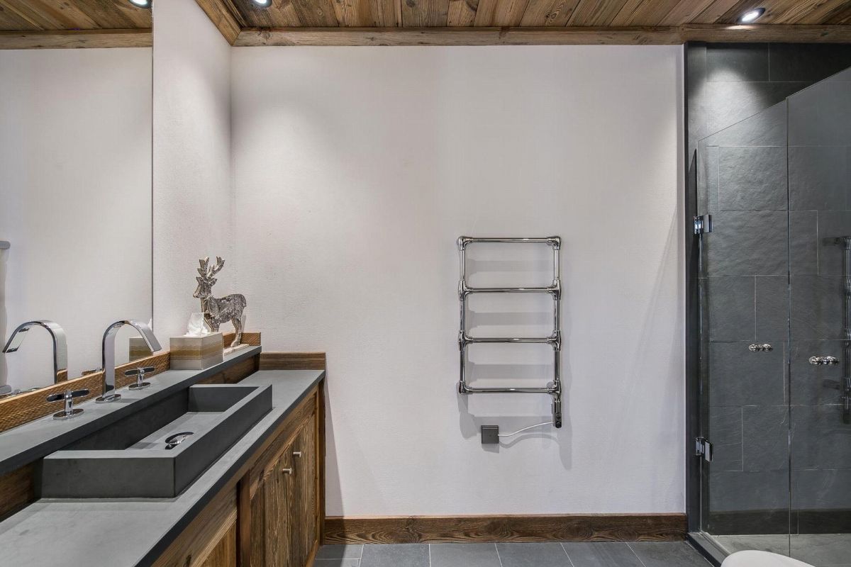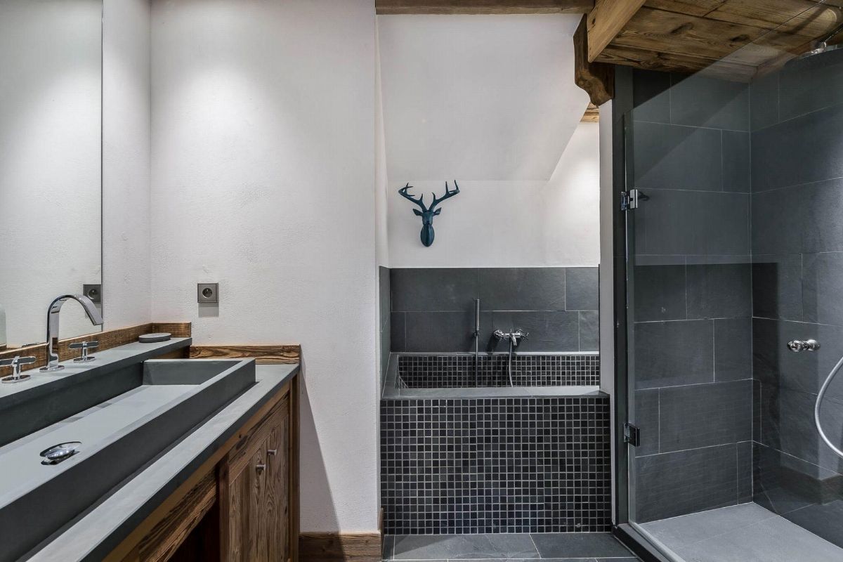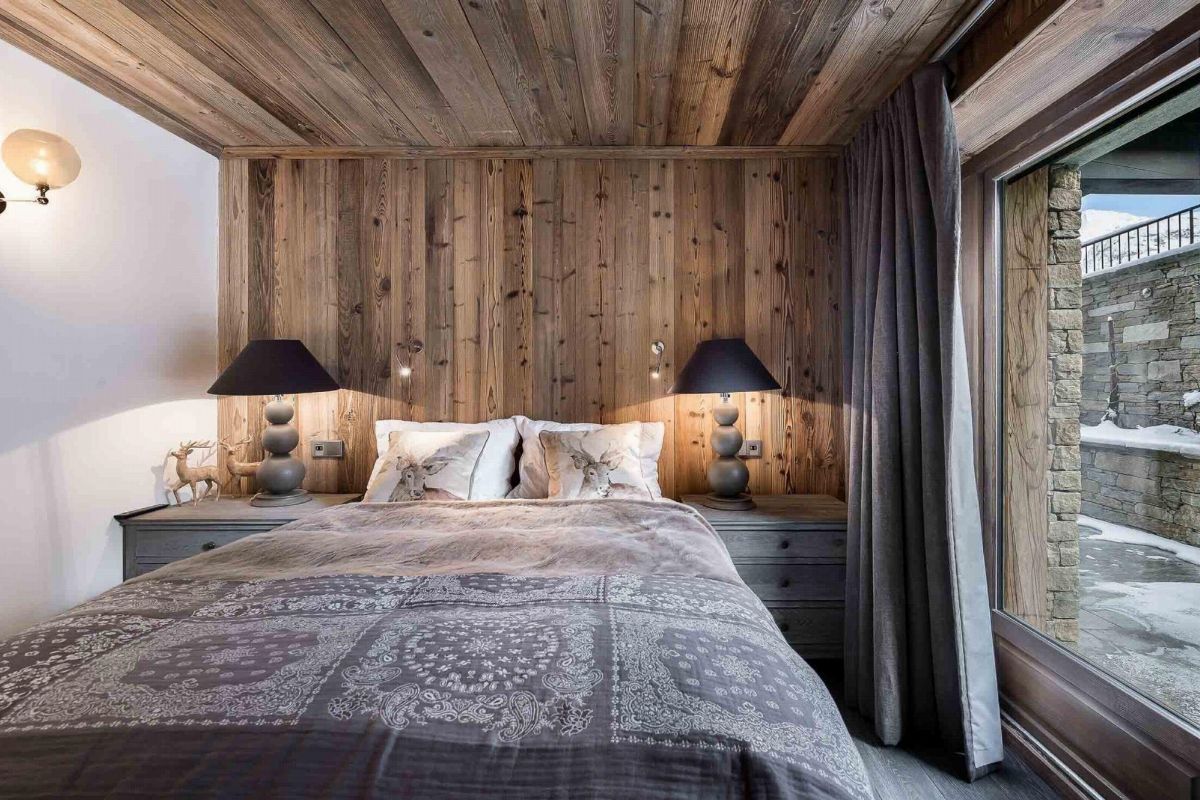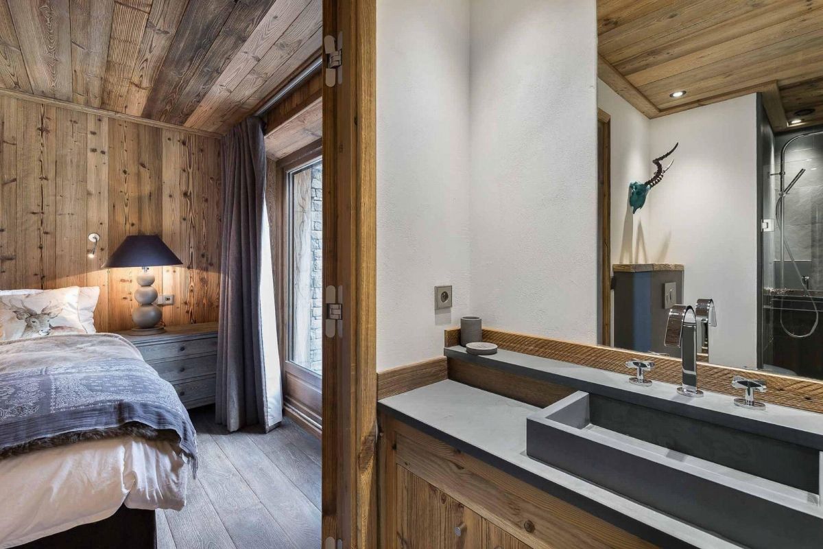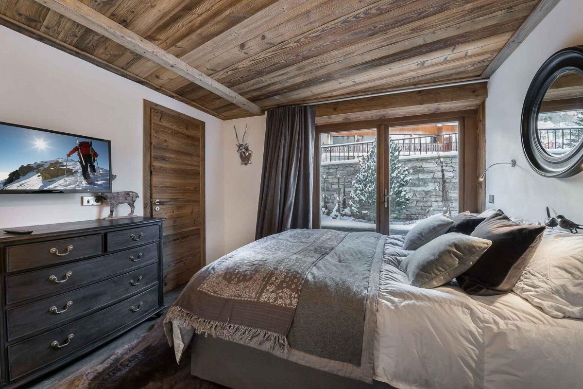The La Canadienne 2 apartment uses traditional Alpine materials such as fur, leather, metal, aged wood and stone, creating an inviting ambiance. With a fireplace, flat-screen TV and comfortable sofas, the open plan living room on the top floor is the perfect place to relax.