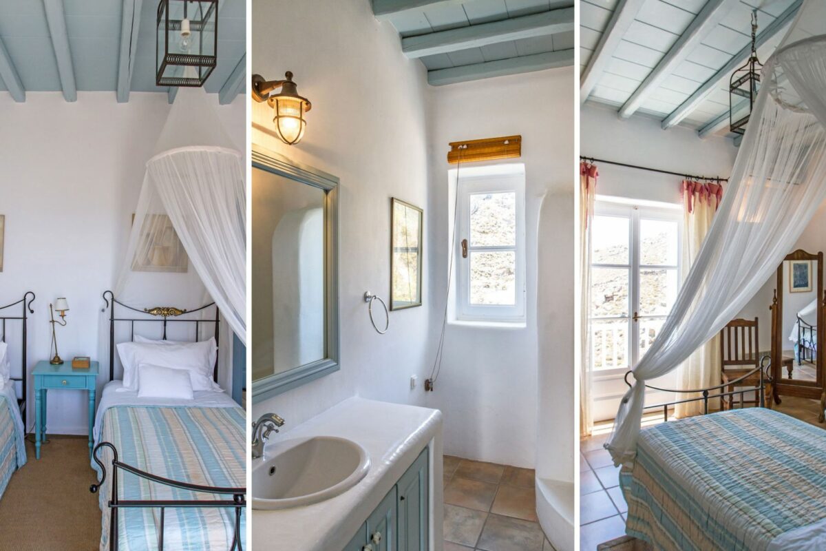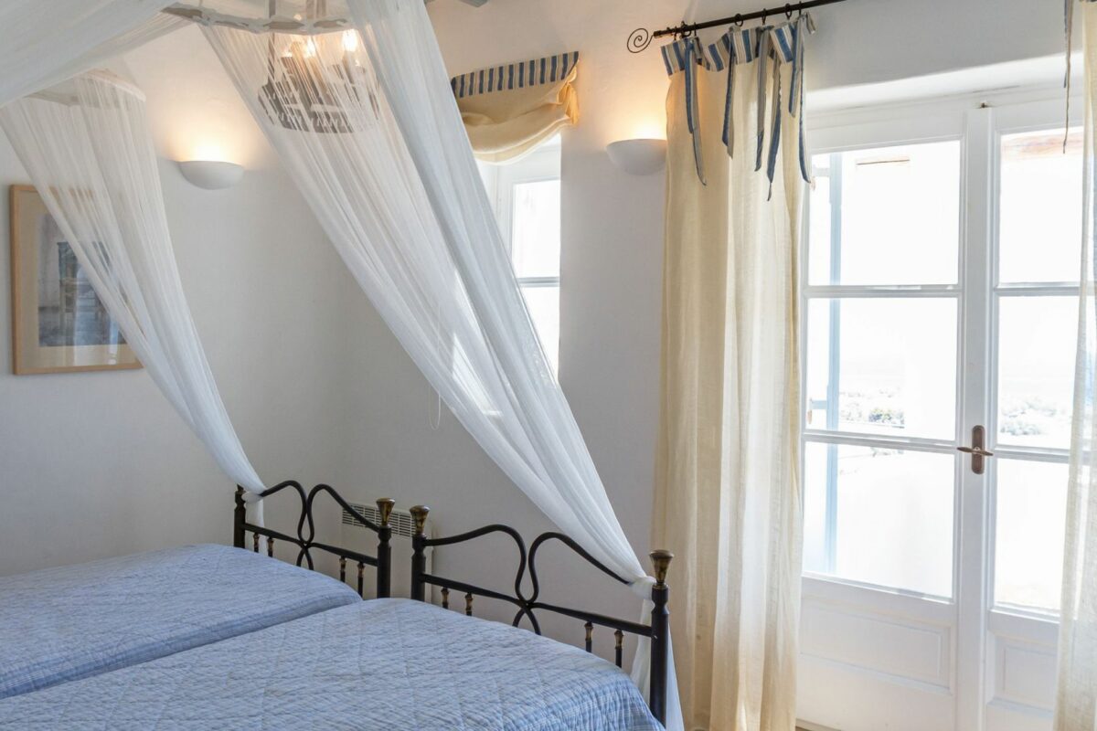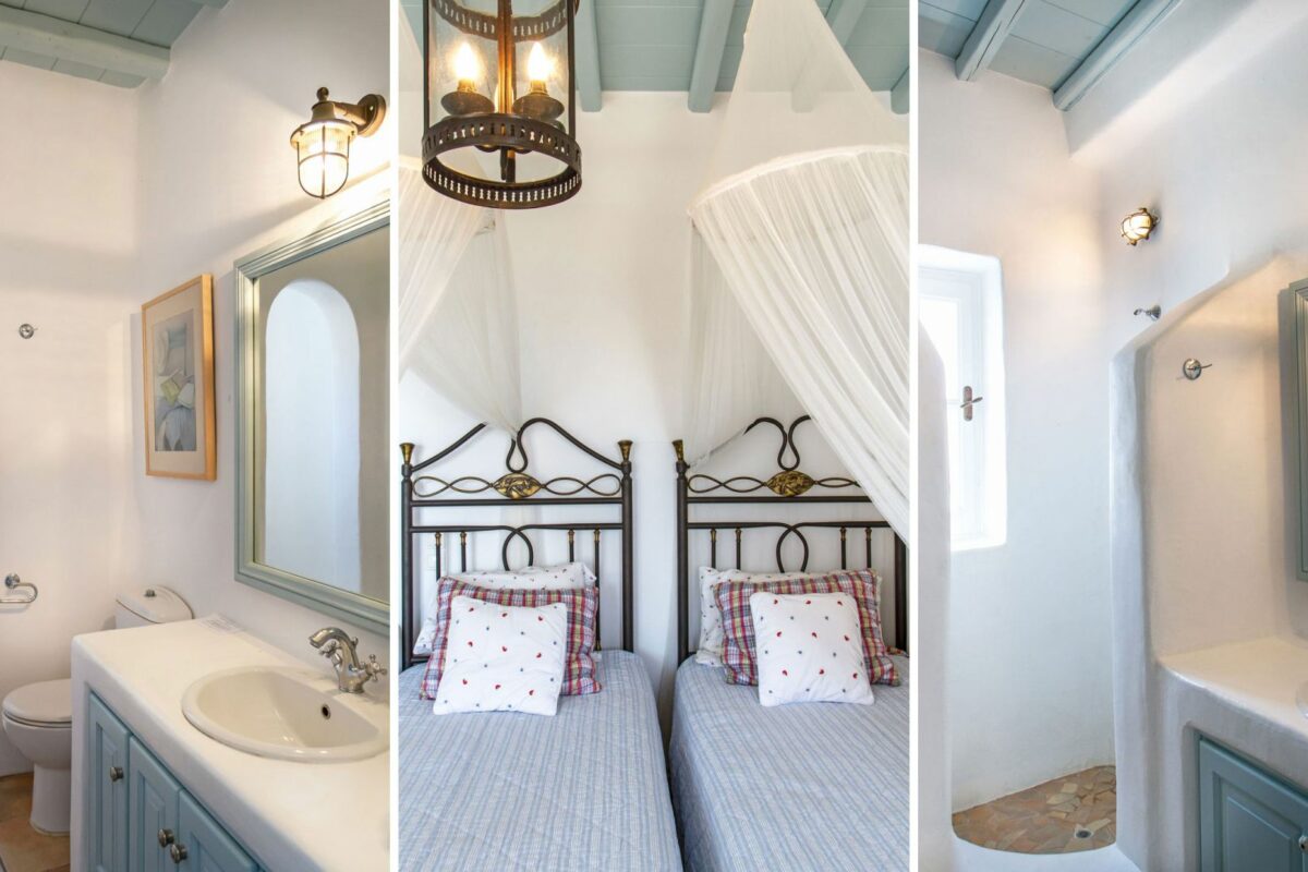 1 Guest Bedroom with twin beds, A/C, en-suite bathroom with shower, direct access to a small terrace with shaded pergola, sea view