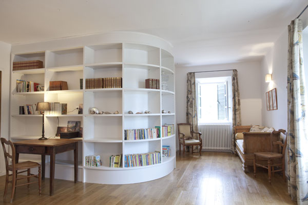 Dining area with fireplace; living room/library (40 m²) tech room,