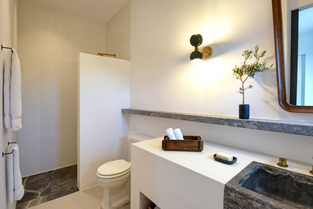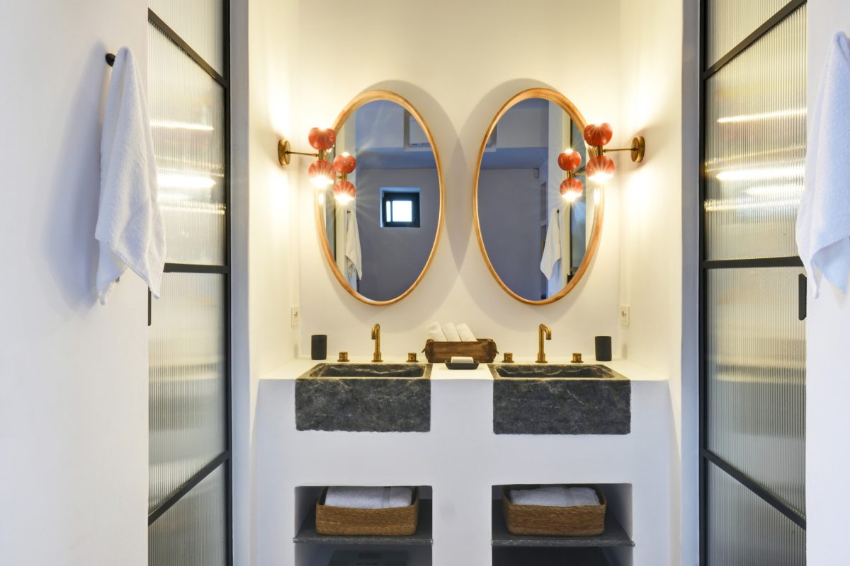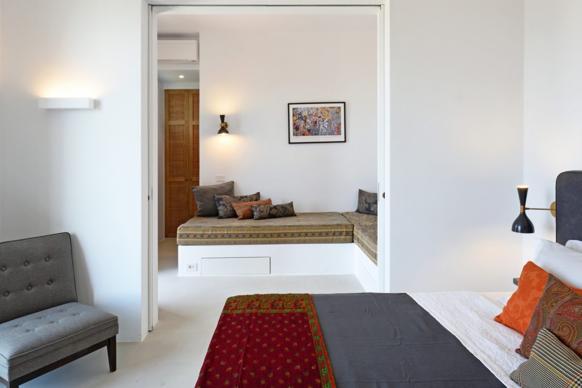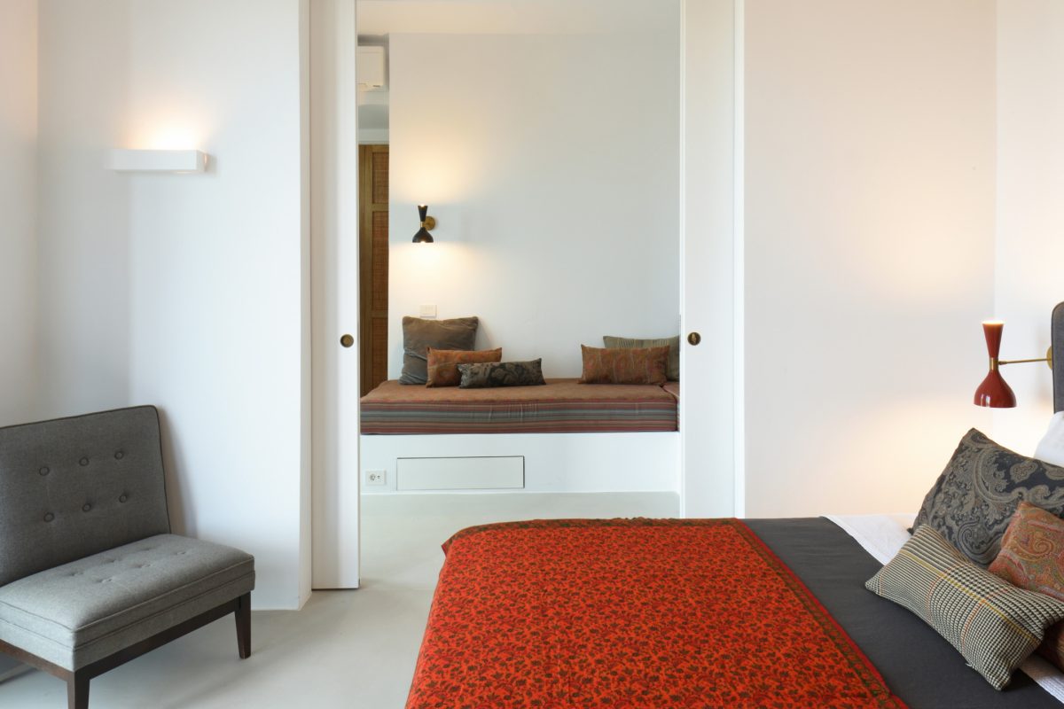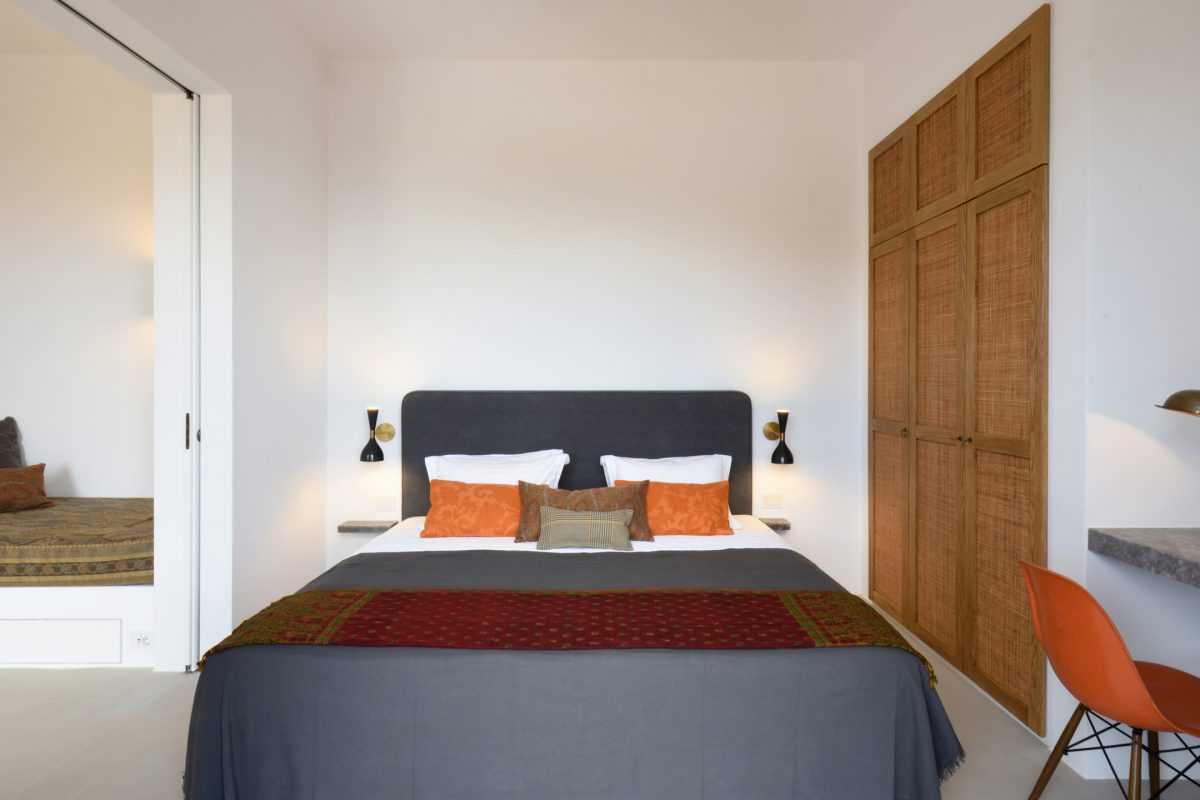 This same refined theme is masterfully carried indoors, where the chic and sophisticated ambiance is complemented by eclectic works of art thoughtfully placed throughout, and an undeniable overall quality that creates a truly unique experience. The configuration of the bedrooms is particularly distinctive: the master suite is entirely independent, occupying the highest level of the property, while the guest rooms are all located on the lower level beneath the pool. These guest accommodations deserve special mention, as each is a true mini-suite, featuring a main bedroom connected to a smaller adjoining room that can serve as a lounge or a children’s bedroom, offering the flexibility to increase capacity if needed.