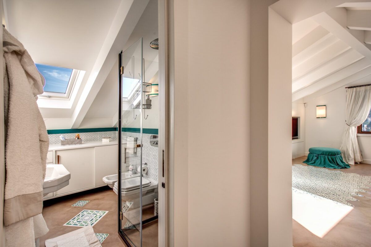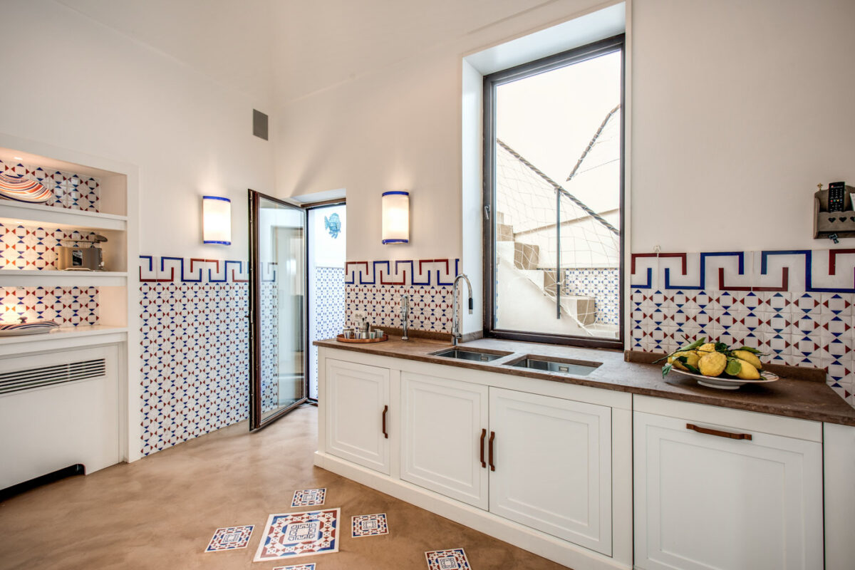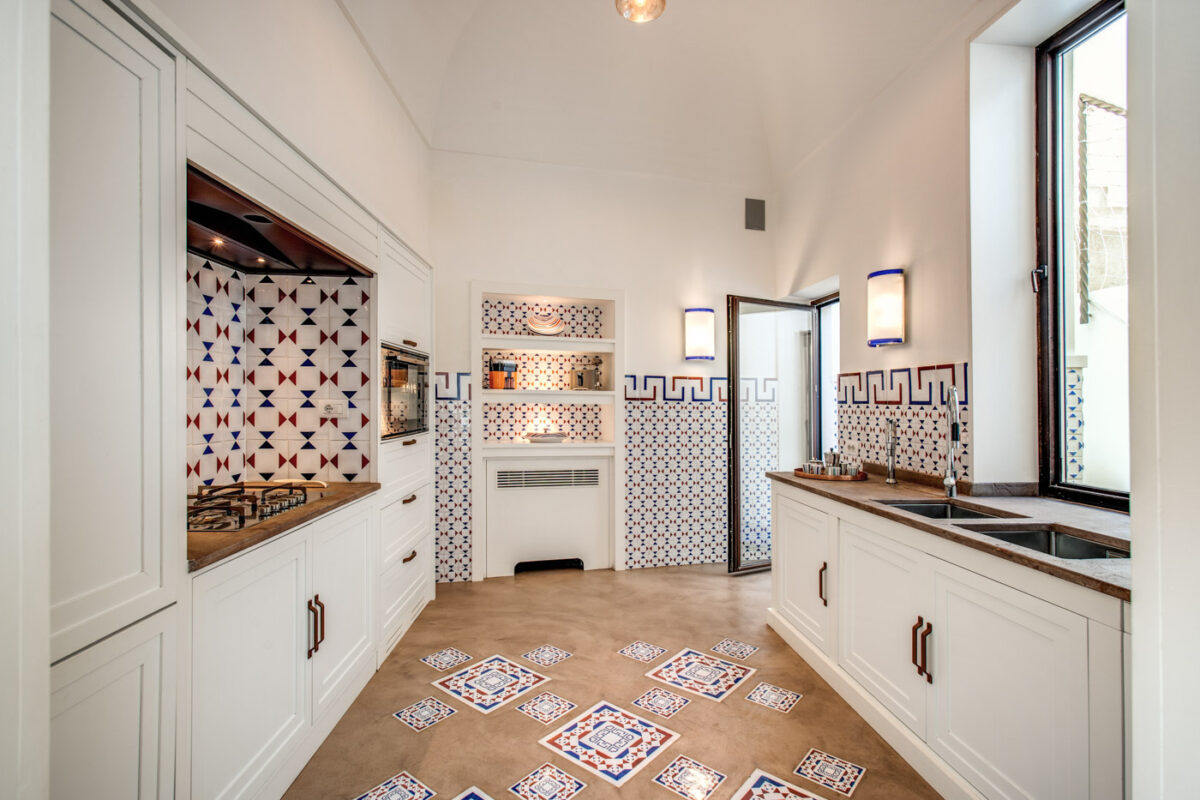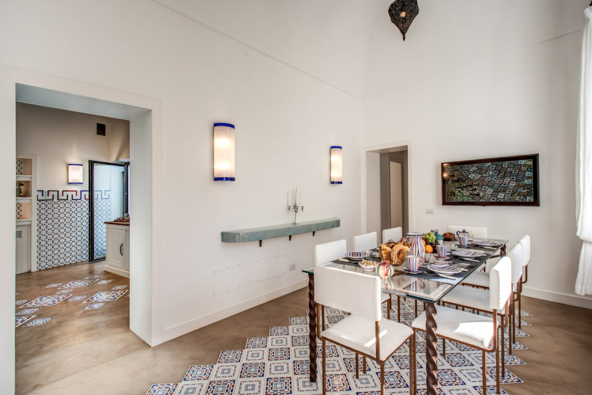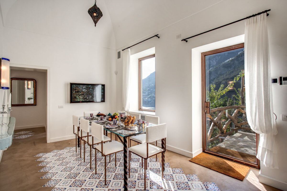 Nadiana renovated interiors beautifully balance modern architectural design with traditional Italian details. Resin flooring inlaid with hand-painted Vietri ceramic tiles is a perfect example of how this home marries the classical with the new. The living spaces are tastefully furnished in a soft white color pallet, complete with bright accented finishes. Architectural details such as exposed beams, sloped ceilings, and large windows and skylights create a bright and welcoming atmosphere. The fully equipped kitchen serves the adjacent dining space. With direct access to the terrace, it is ideal for enjoying the local cuisine al fresco. For the evenings you feel like staying in, the villa is equipped with all the modern comforts you could need.