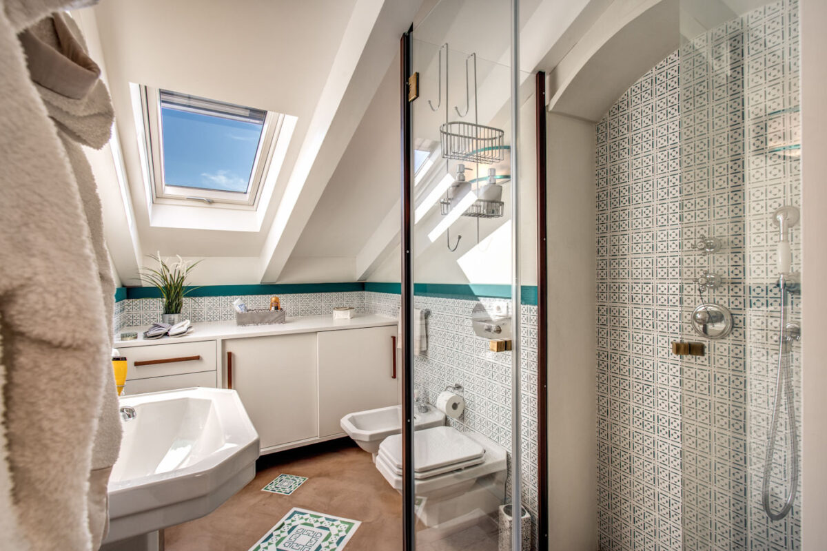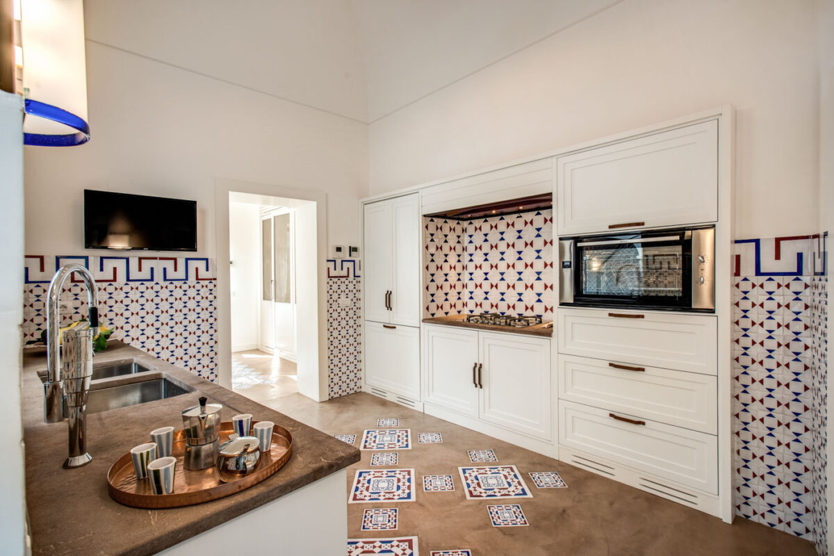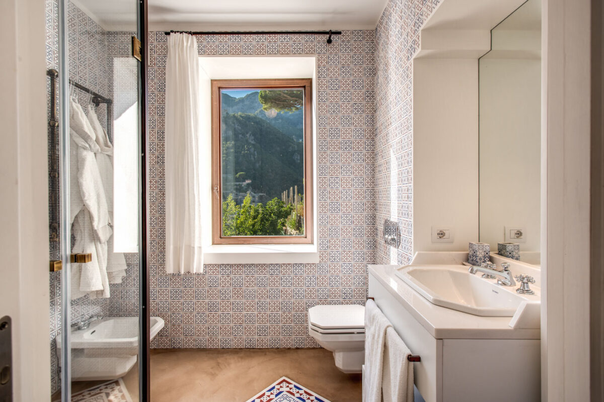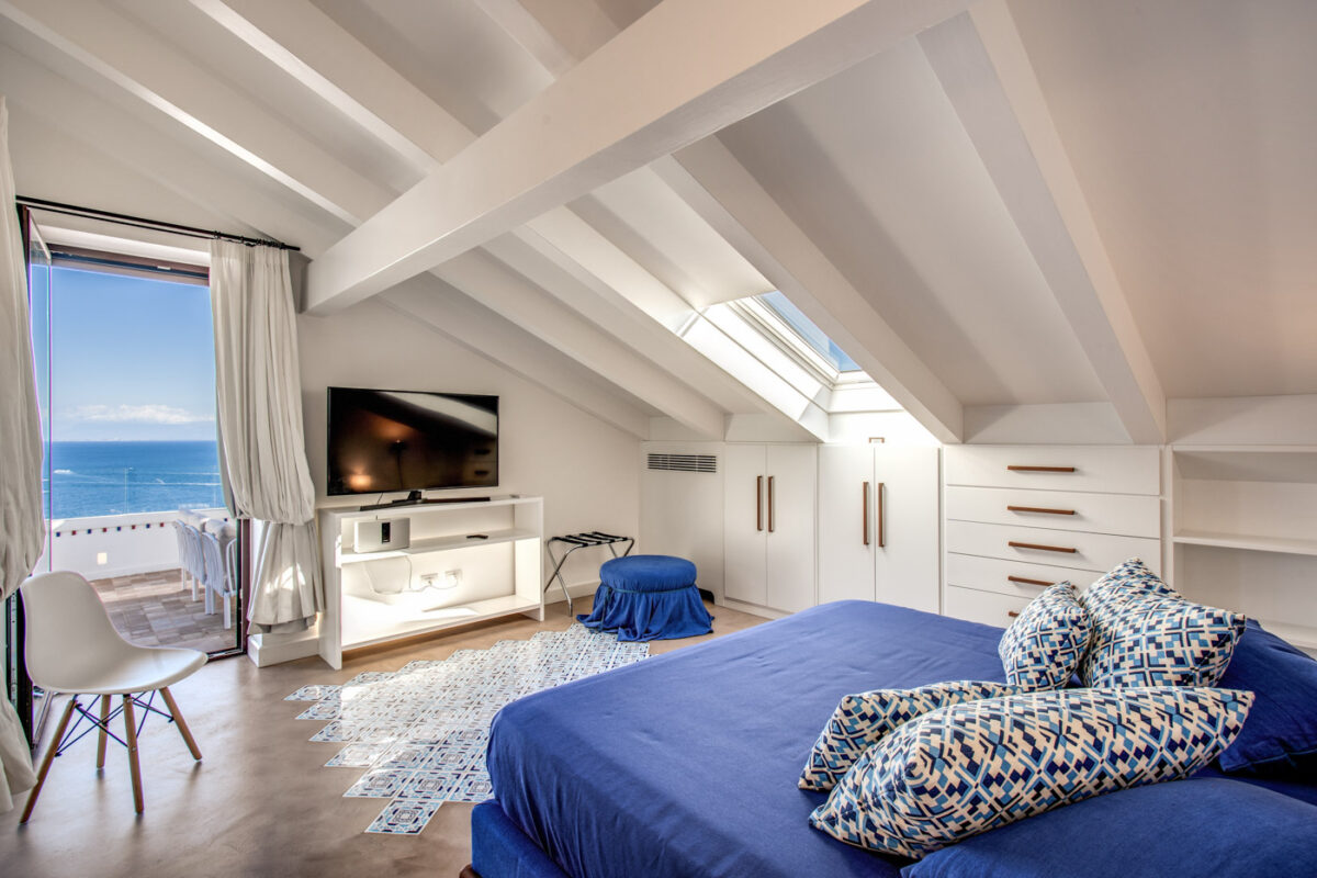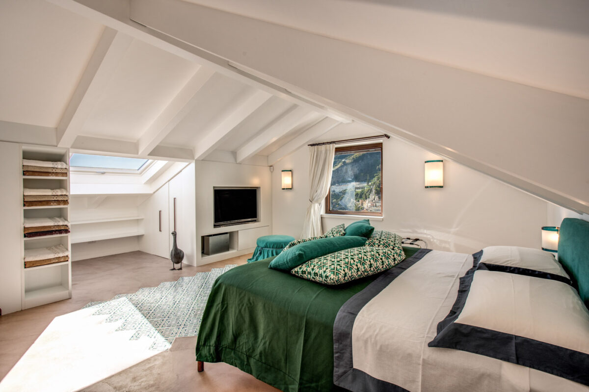 Nadiana renovated interiors beautifully balance modern architectural design with traditional Italian details. Resin flooring inlaid with hand-painted Vietri ceramic tiles is a perfect example of how this home marries the classical with the new. The living spaces are tastefully furnished in a soft white color pallet, complete with bright accented finishes. Architectural details such as exposed beams, sloped ceilings, and large windows and skylights create a bright and welcoming atmosphere. The fully equipped kitchen serves the adjacent dining space. With direct access to the terrace, it is ideal for enjoying the local cuisine al fresco. For the evenings you feel like staying in, the villa is equipped with all the modern comforts you could need.