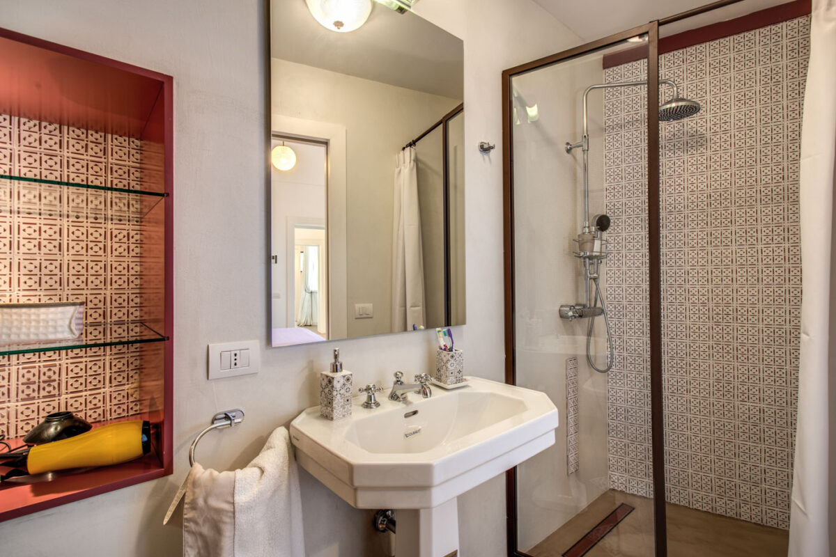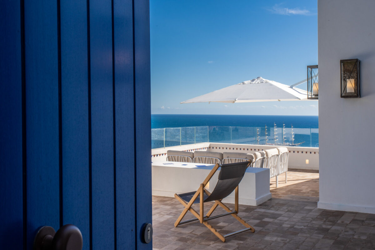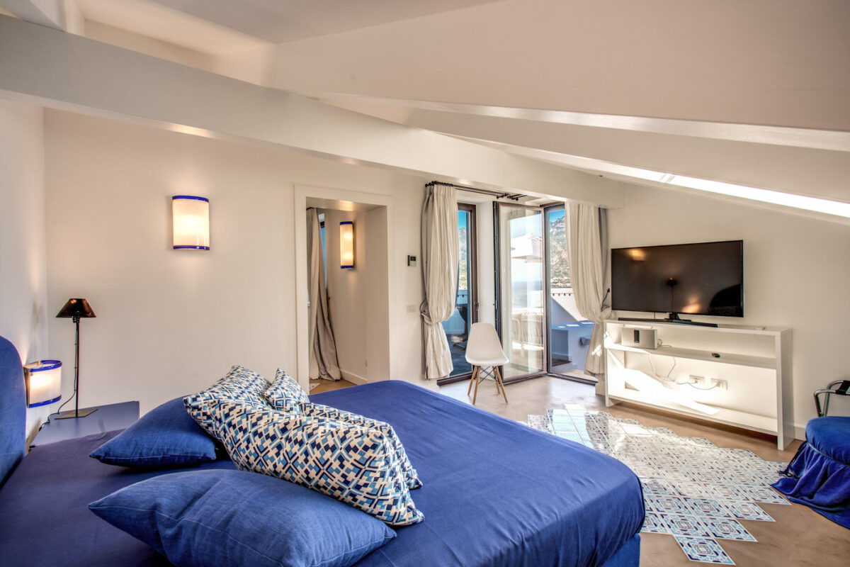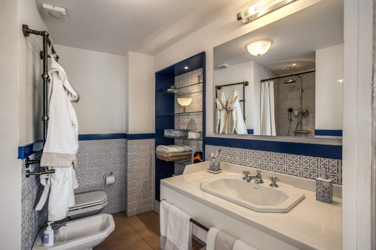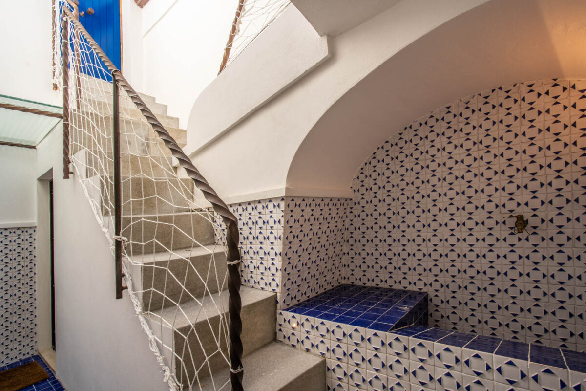 Nadiana renovated interiors beautifully balance modern architectural design with traditional Italian details. Resin flooring inlaid with hand-painted Vietri ceramic tiles is a perfect example of how this home marries the classical with the new. The living spaces are tastefully furnished in a soft white color pallet, complete with bright accented finishes. Architectural details such as exposed beams, sloped ceilings, and large windows and skylights create a bright and welcoming atmosphere. The fully equipped kitchen serves the adjacent dining space. With direct access to the terrace, it is ideal for enjoying the local cuisine al fresco. For the evenings you feel like staying in, the villa is equipped with all the modern comforts you could need.