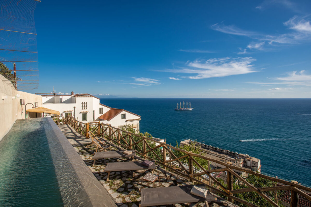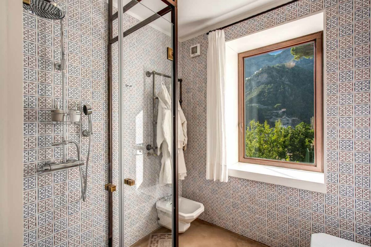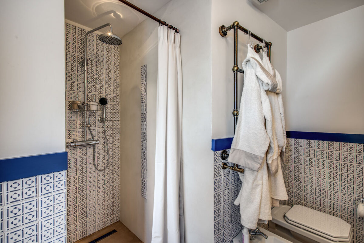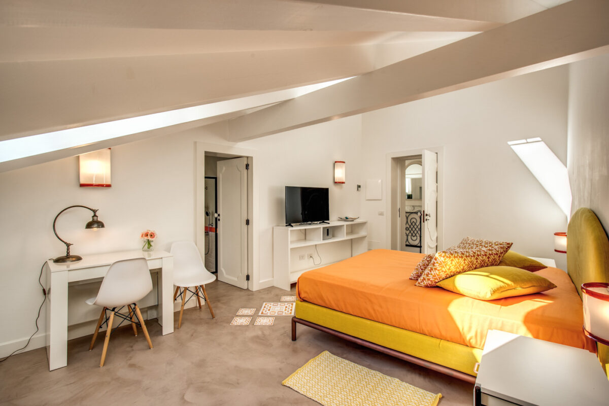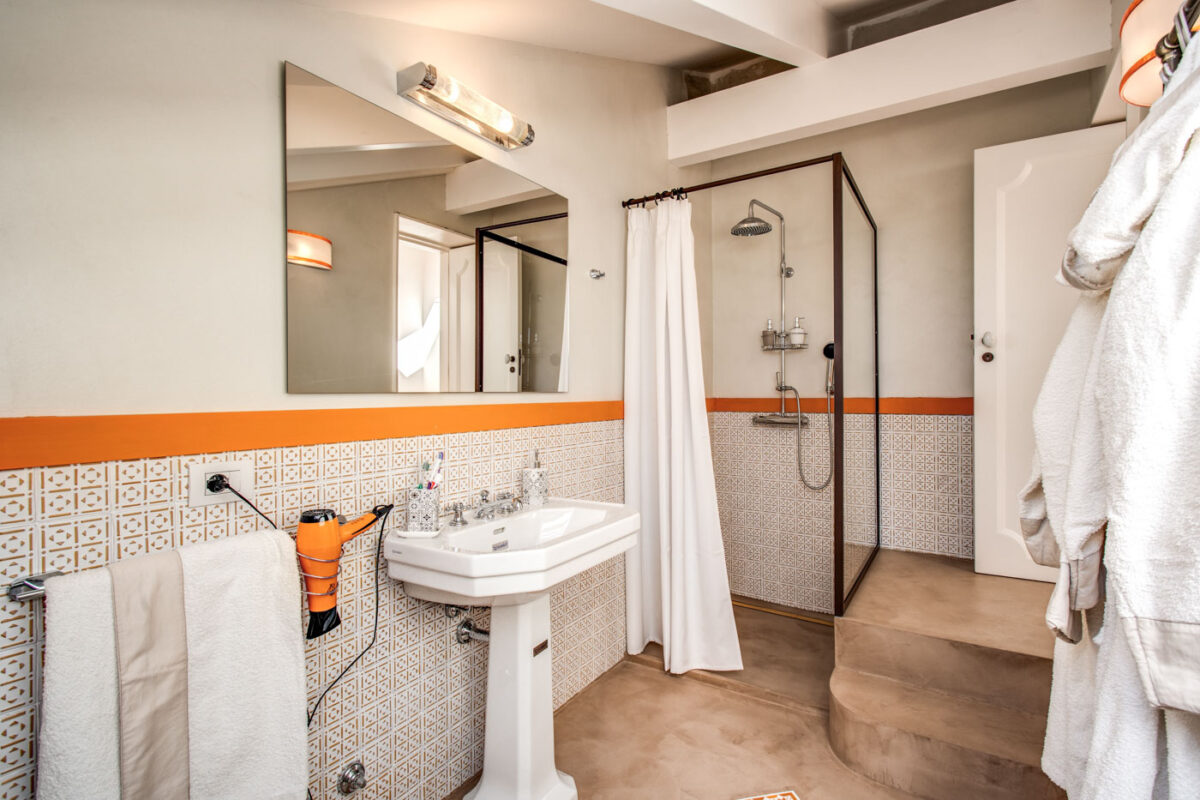 Nadiana renovated interiors beautifully balance modern architectural design with traditional Italian details. Resin flooring inlaid with hand-painted Vietri ceramic tiles is a perfect example of how this home marries the classical with the new. The living spaces are tastefully furnished in a soft white color pallet, complete with bright accented finishes. Architectural details such as exposed beams, sloped ceilings, and large windows and skylights create a bright and welcoming atmosphere. The fully equipped kitchen serves the adjacent dining space. With direct access to the terrace, it is ideal for enjoying the local cuisine al fresco. For the evenings you feel like staying in, the villa is equipped with all the modern comforts you could need.