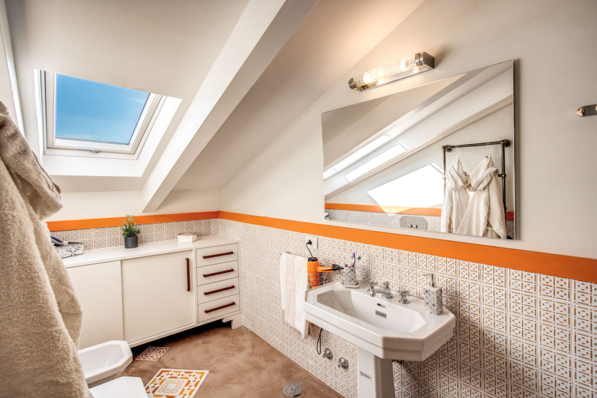 Orange king bedroom with sloped ceiling, en-suite bathroom