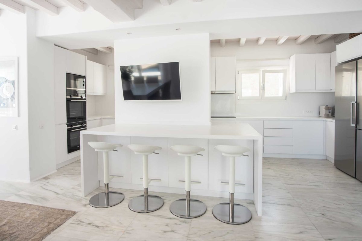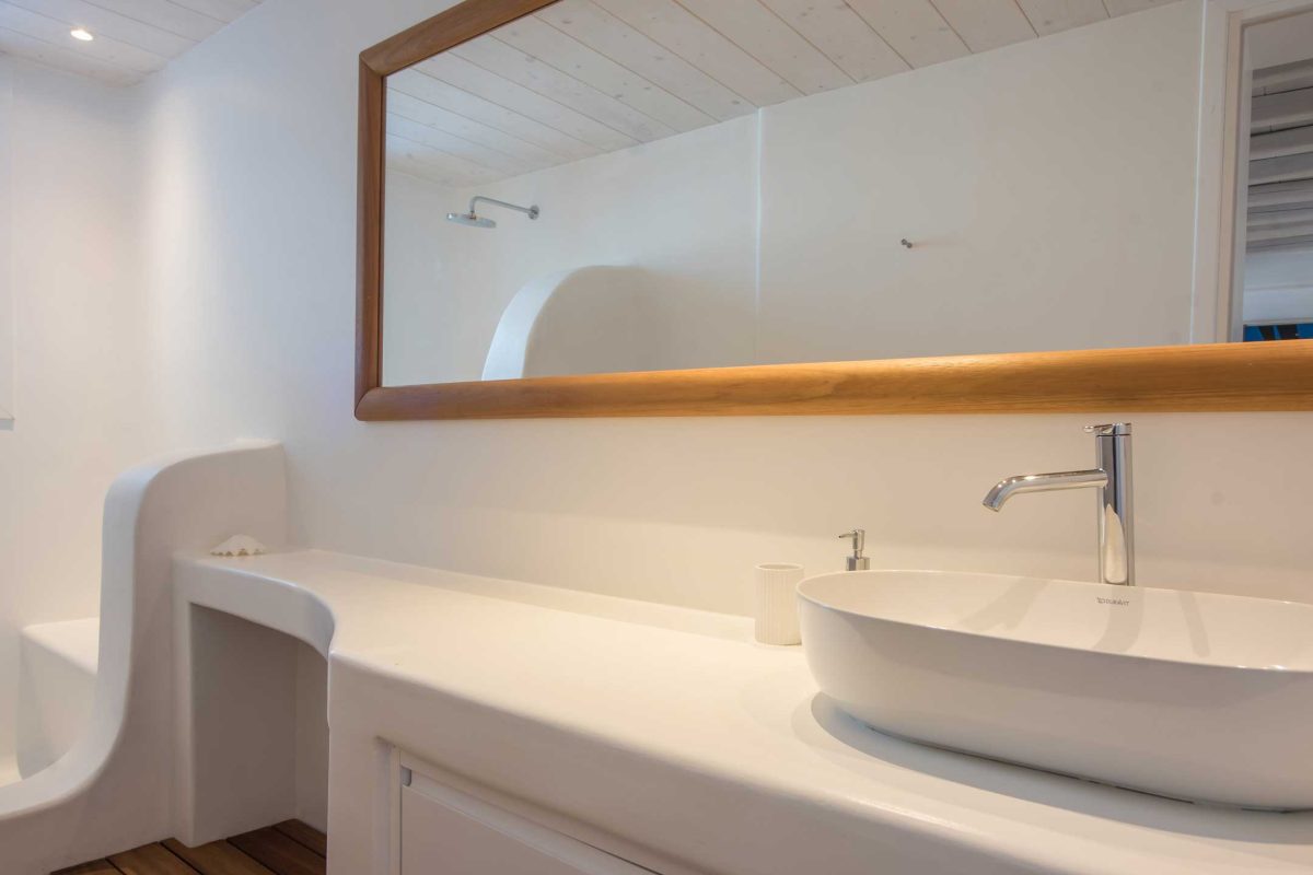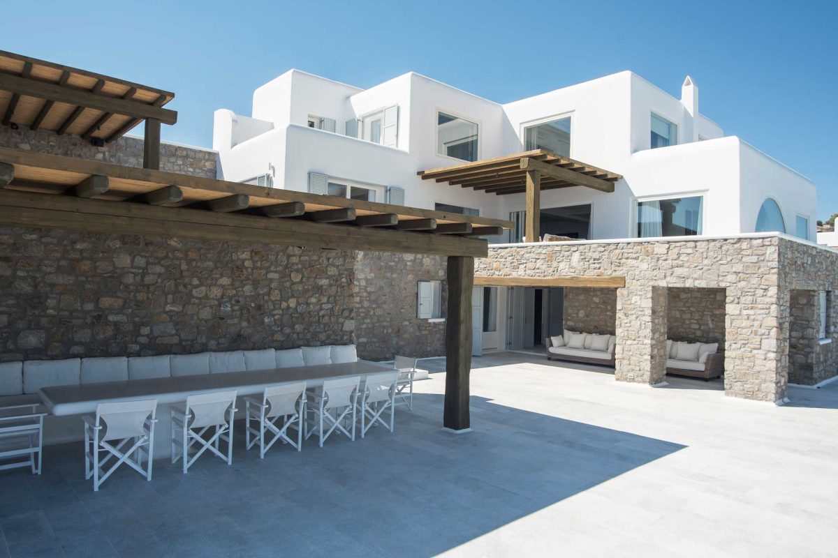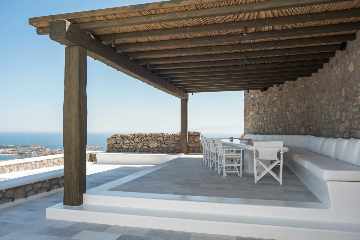 The villa boasts extensive outdoor spaces, including large terraces furnished with sun loungers and inviting sofas, where the centerpiece is the sublime pool, complemented by a heated Jacuzzi, a shaded bar area, and two dining tables under pergolas. Whether you want to relax, party, or simply enjoy the stunning surroundings, Villa nafsica provides the perfect summer retreat.