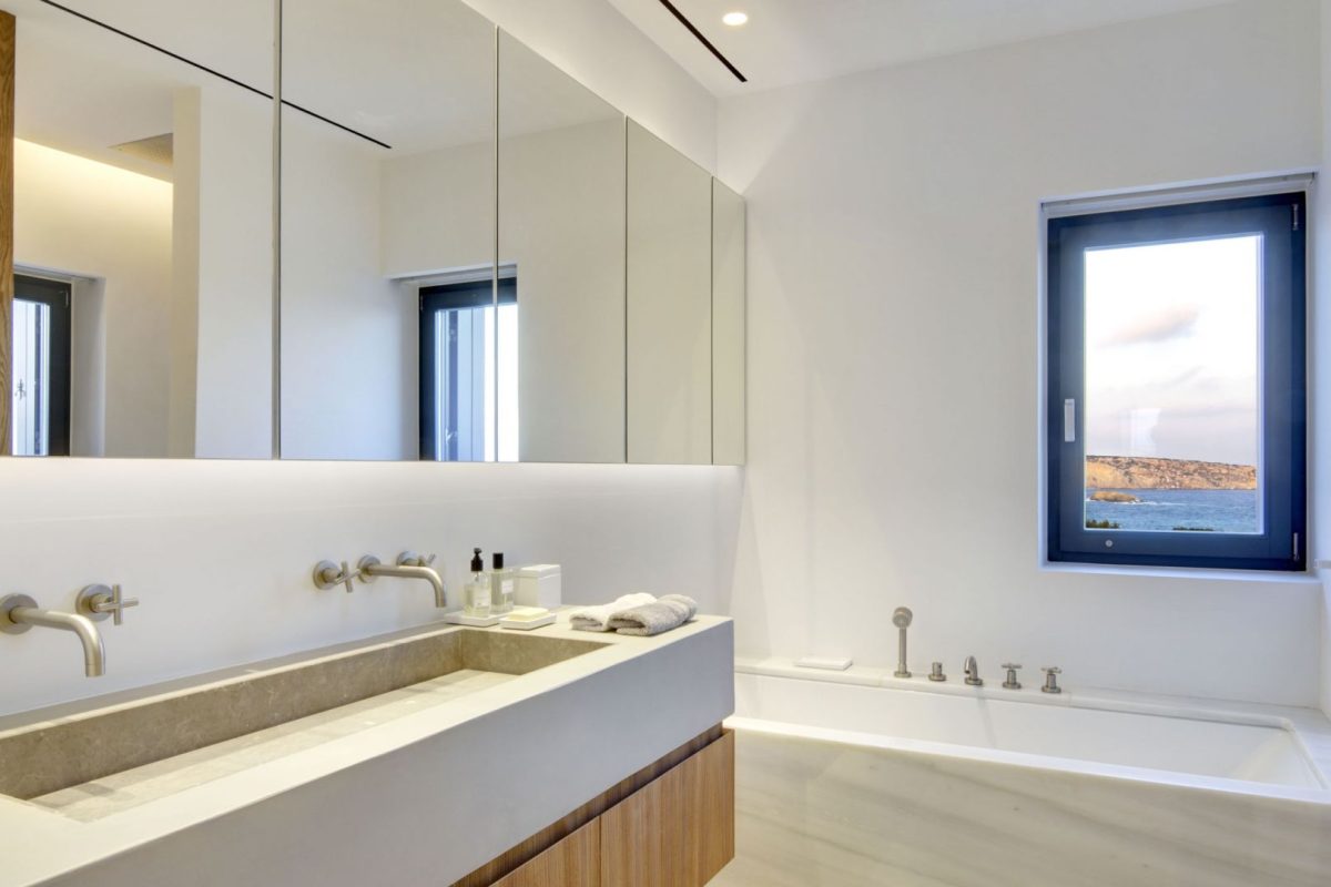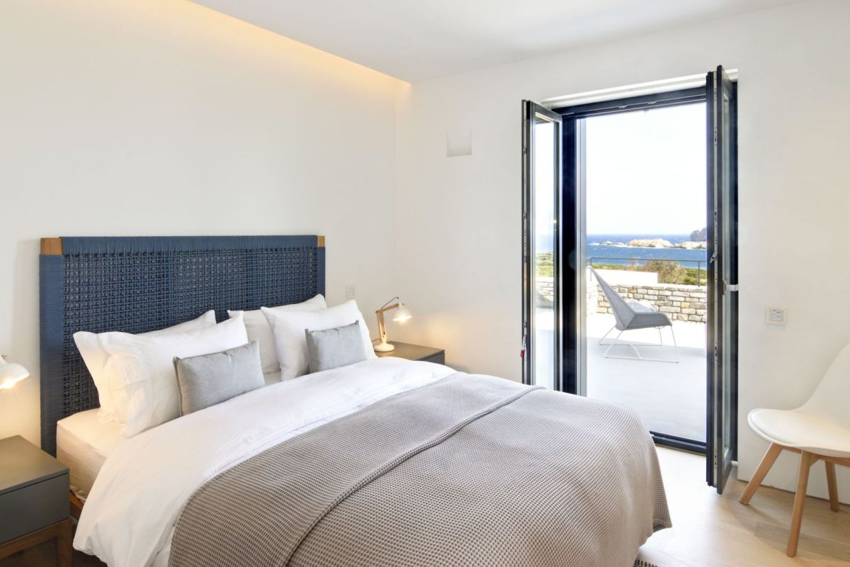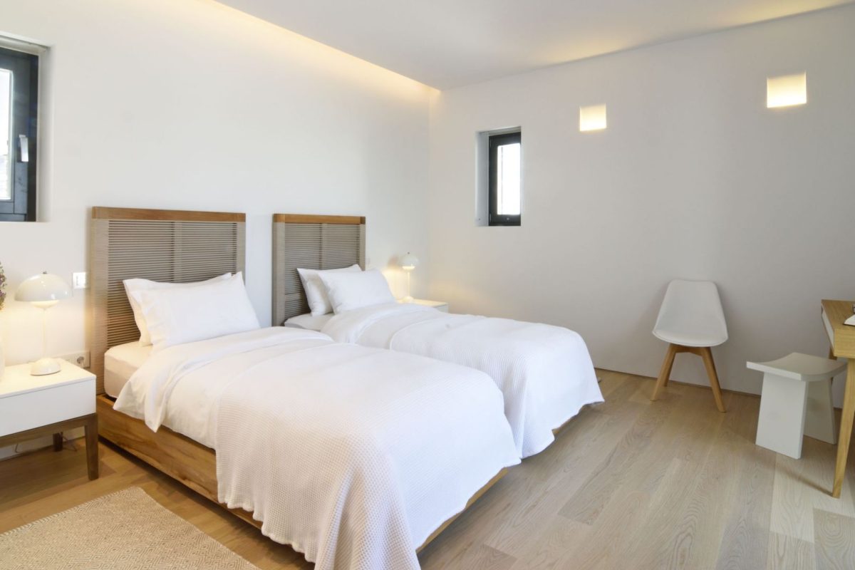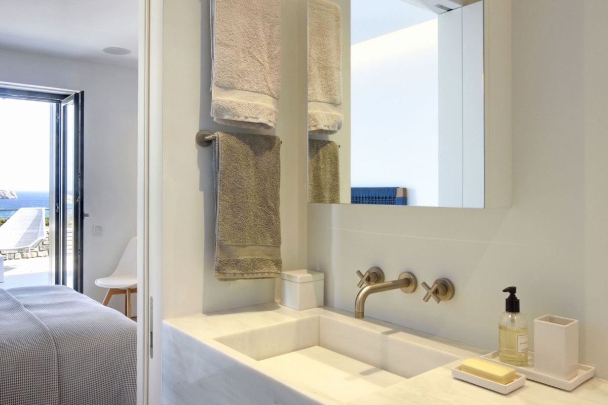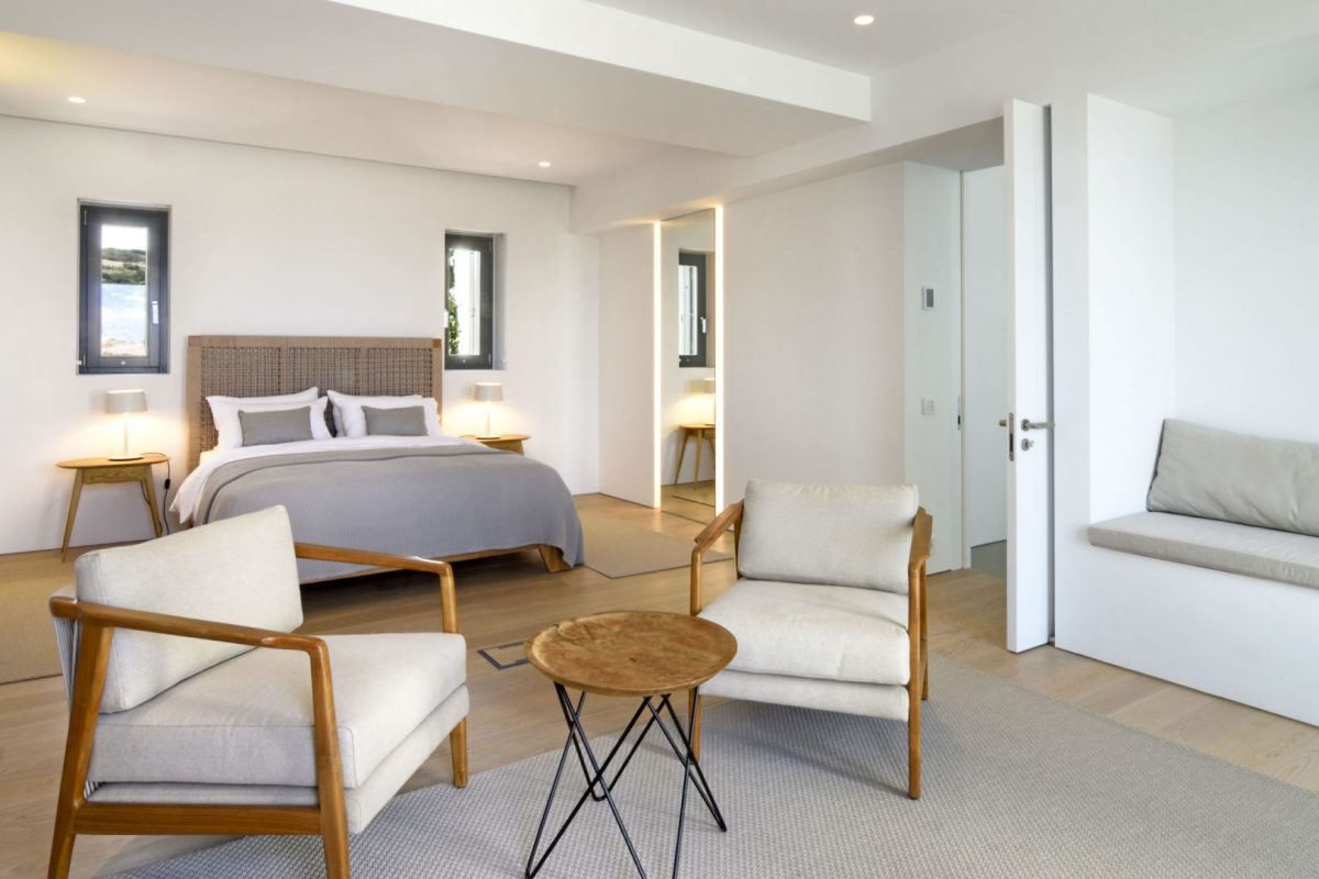 The five bedrooms, each with ensuite, are spread across two levels. The master bedroom, along with two guest bedrooms are located on the upper level. Each bedroom on the upper level enjoys its own private balcony in order to maximise the beautiful Aegean Sea views. The further two guest bedrooms are located on the ground level and are accompanied by a staff bedroom.