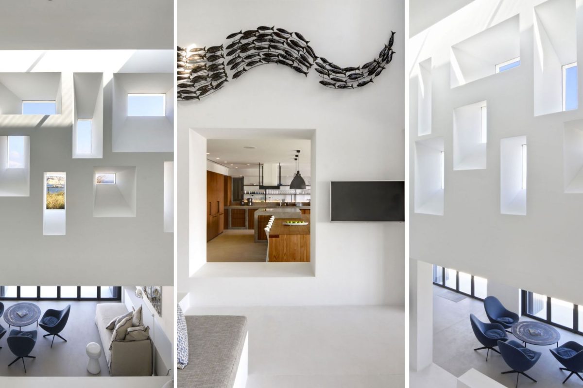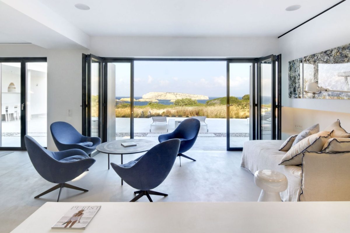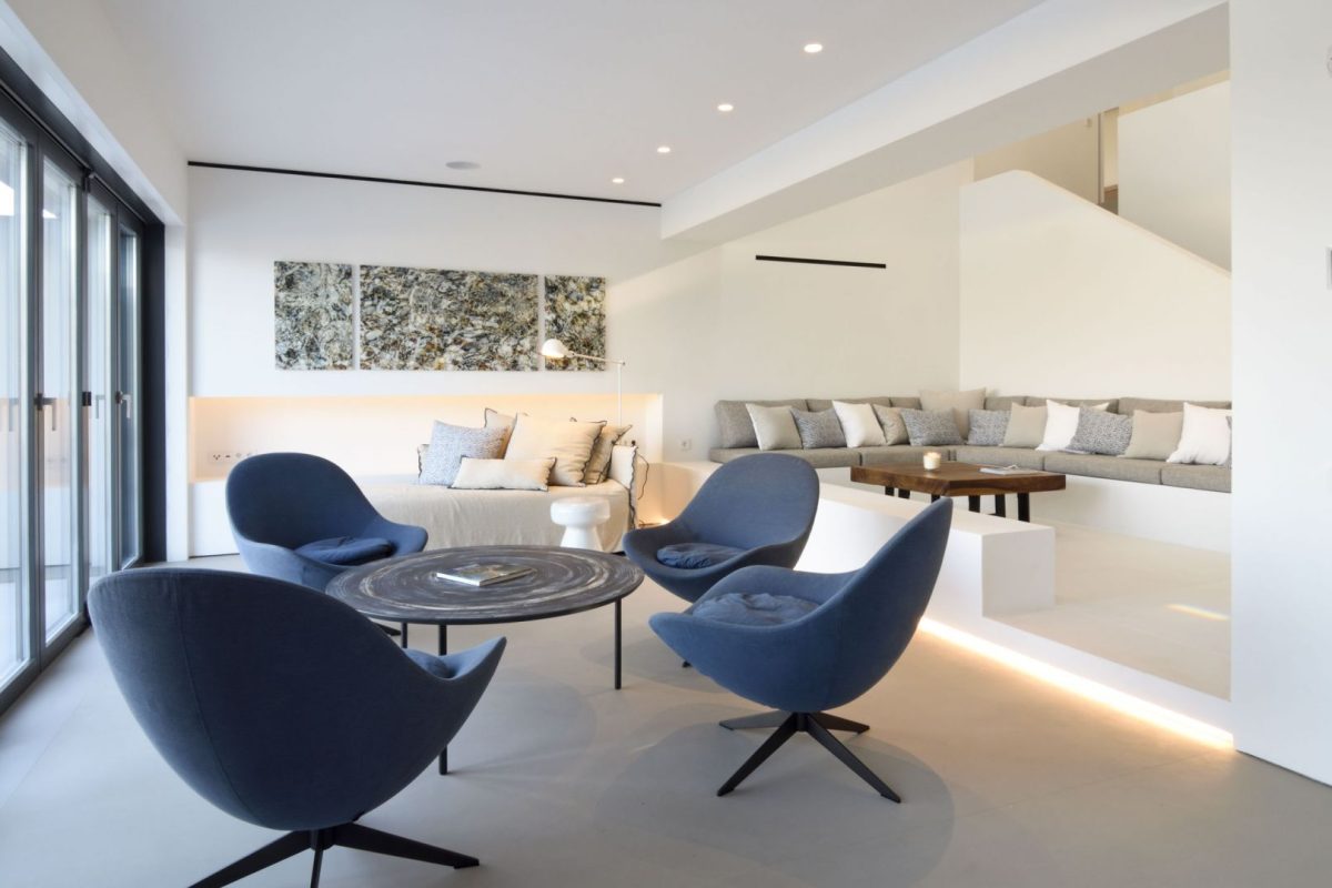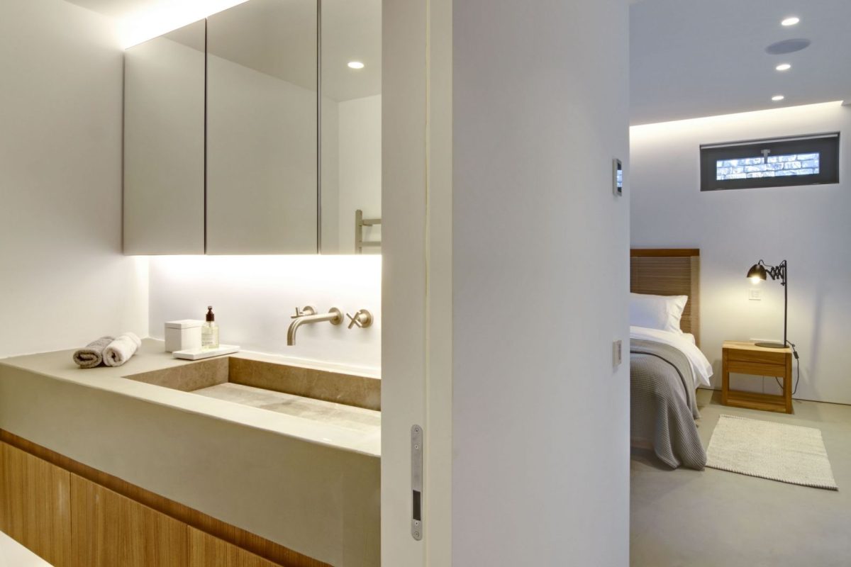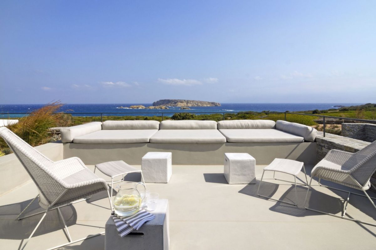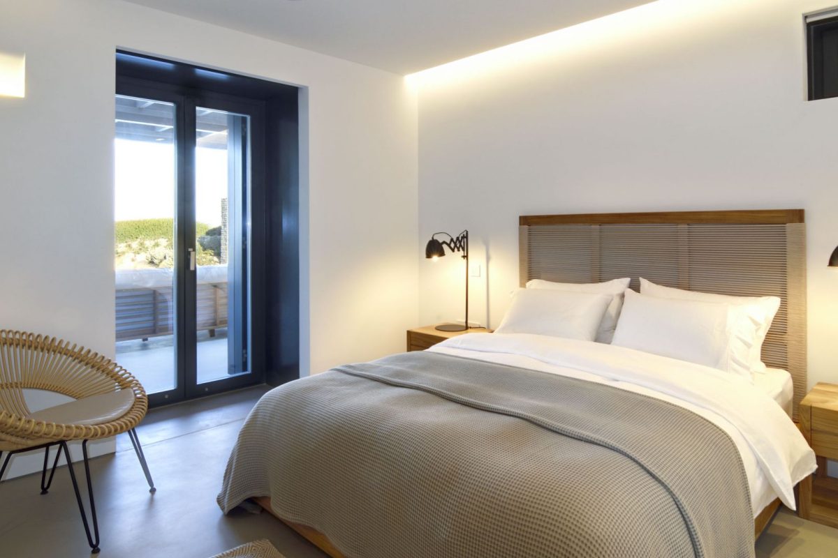 The five bedrooms, each with ensuite, are spread across two levels. The master bedroom, along with two guest bedrooms are located on the upper level. Each bedroom on the upper level enjoys its own private balcony in order to maximise the beautiful Aegean Sea views. The further two guest bedrooms are located on the ground level and are accompanied by a staff bedroom.