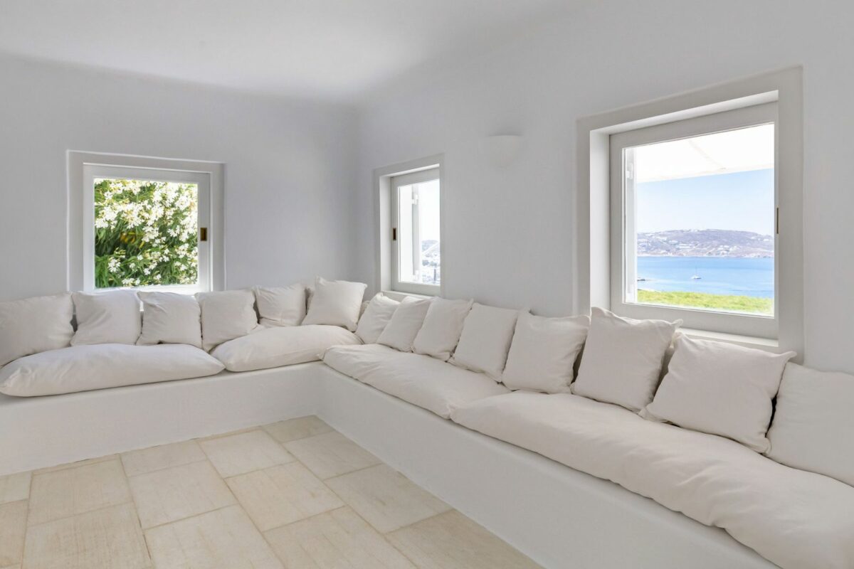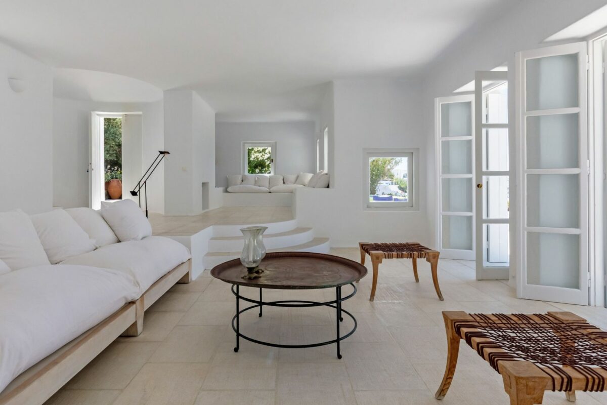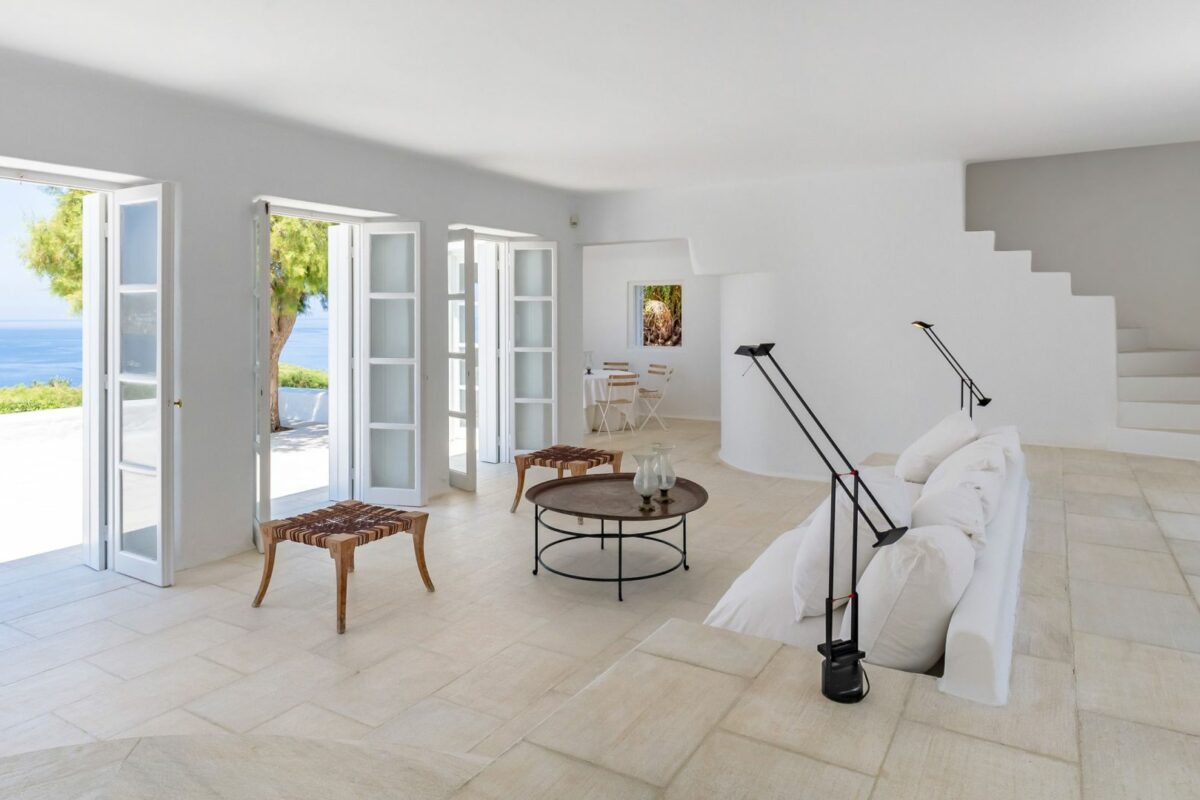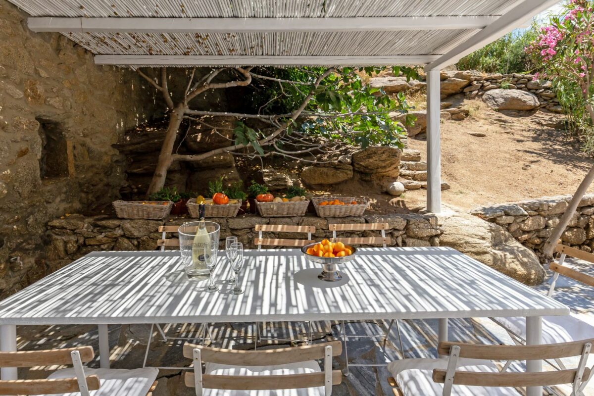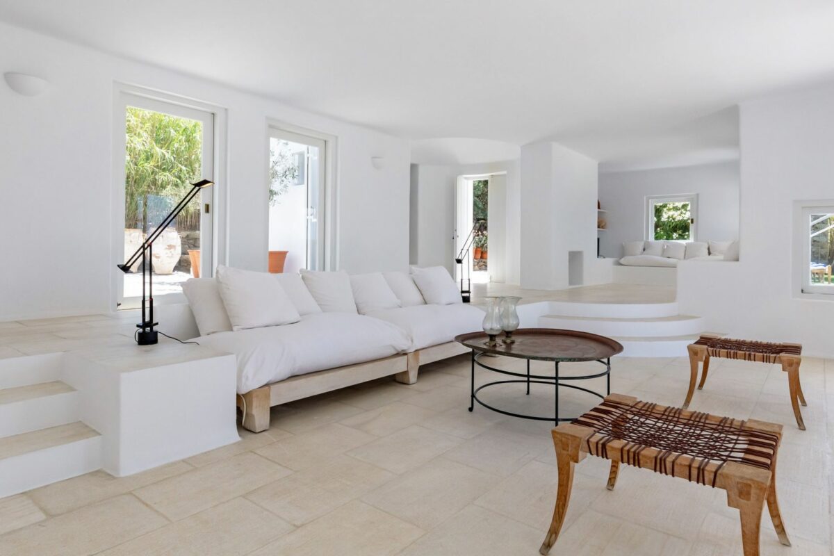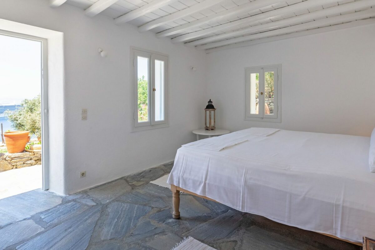 The villa’s terraced garden and patio offer many outdoor living areas, all enhanced with an array of cushions, director’s chairs, coffee tables and wood-woven sun-beds. Views stretch from the old harbor of Mykonos to the tip of the Ano Diakoftis peninsula which can be enjoyed from any point of the olive grove and terrace where a plunge pool has recently been added for guests' pleasure.