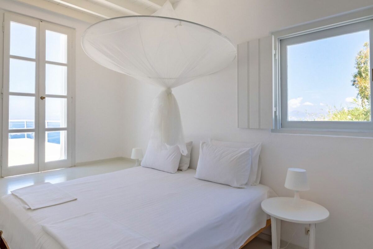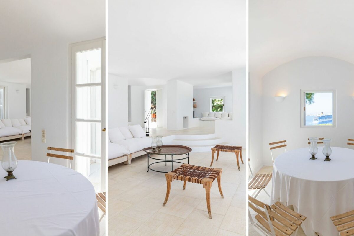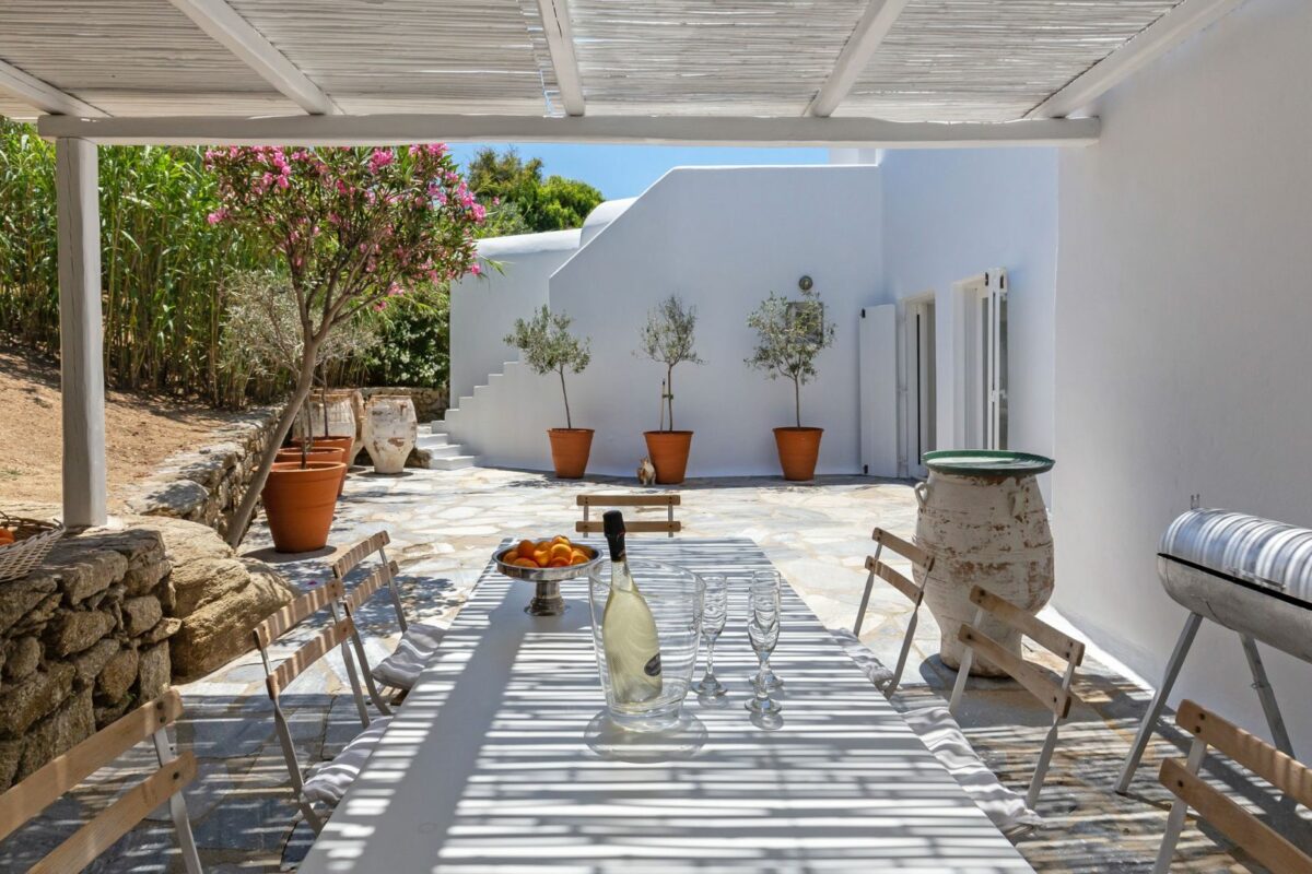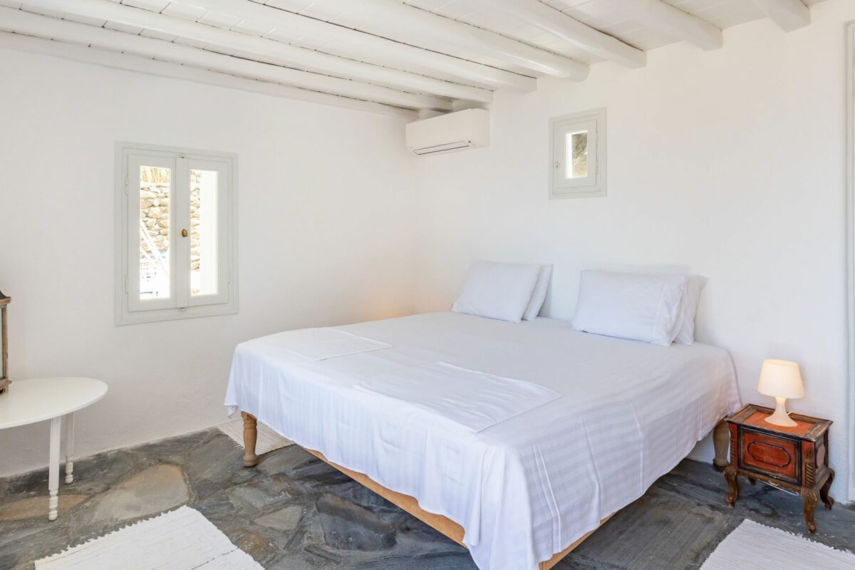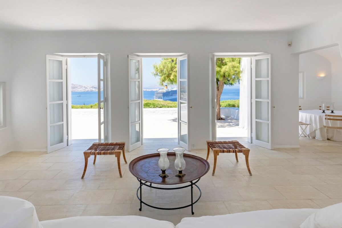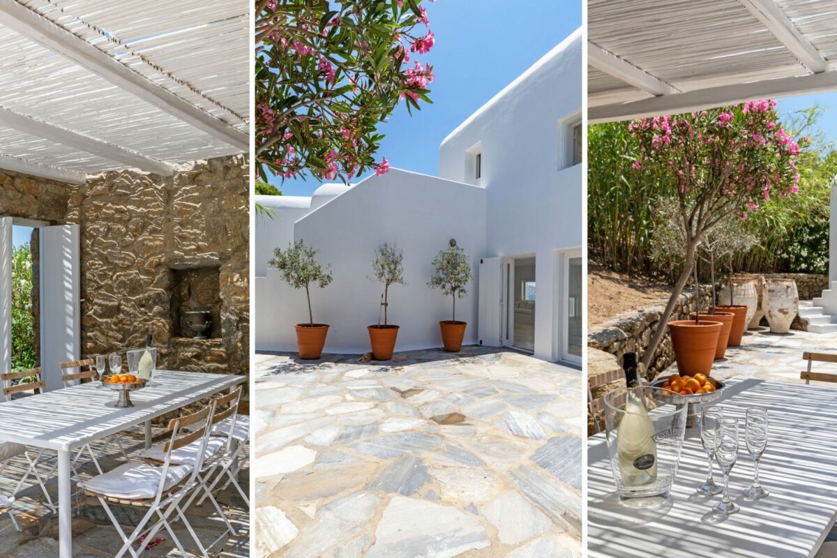 The villa’s terraced garden and patio offer many outdoor living areas, all enhanced with an array of cushions, director’s chairs, coffee tables and wood-woven sun-beds. Views stretch from the old harbor of Mykonos to the tip of the Ano Diakoftis peninsula which can be enjoyed from any point of the olive grove and terrace where a plunge pool has recently been added for guests' pleasure.