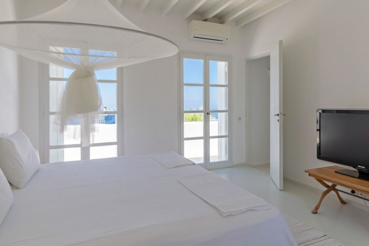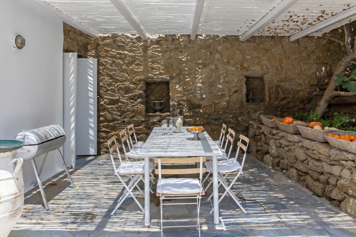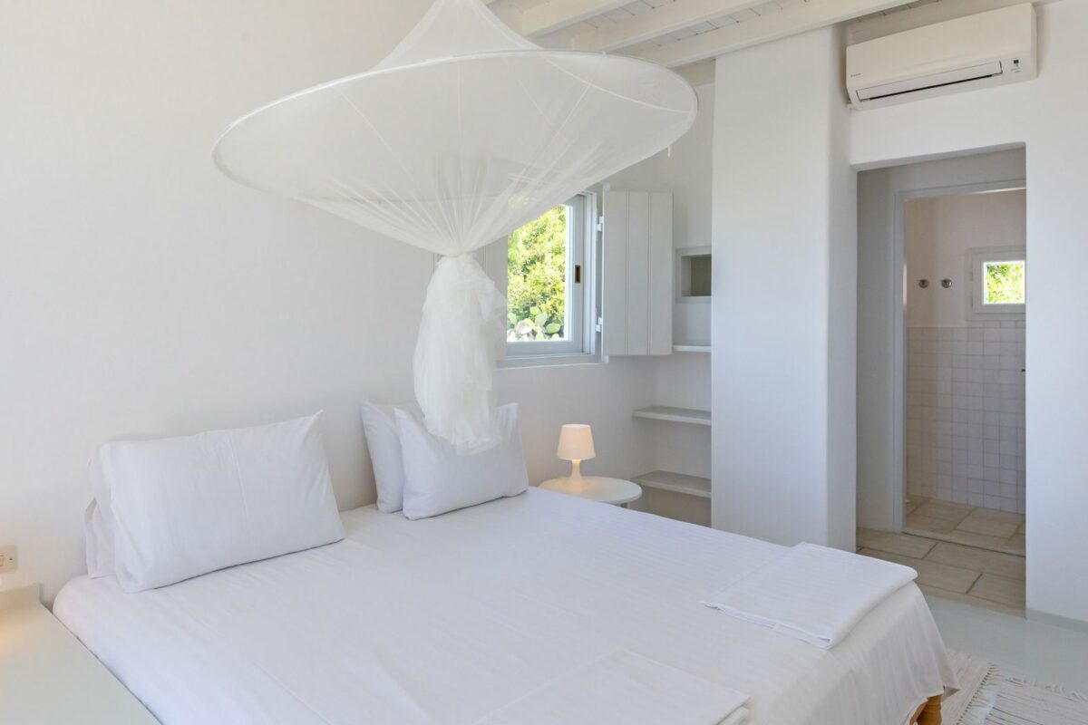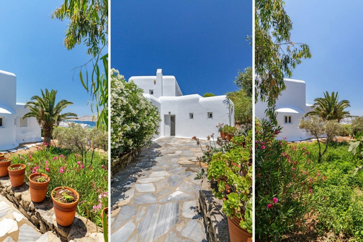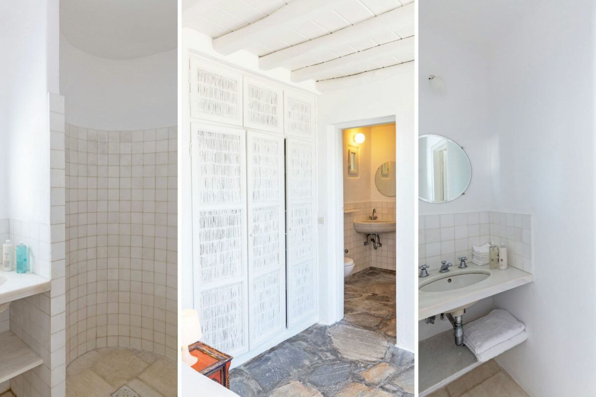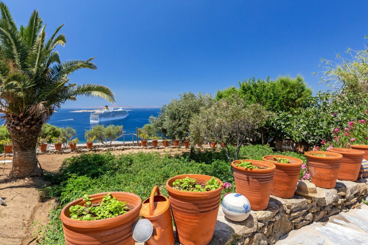 The villa’s terraced garden and patio offer many outdoor living areas, all enhanced with an array of cushions, director’s chairs, coffee tables and wood-woven sun-beds. Views stretch from the old harbor of Mykonos to the tip of the Ano Diakoftis peninsula which can be enjoyed from any point of the olive grove and terrace where a plunge pool has recently been added for guests' pleasure.