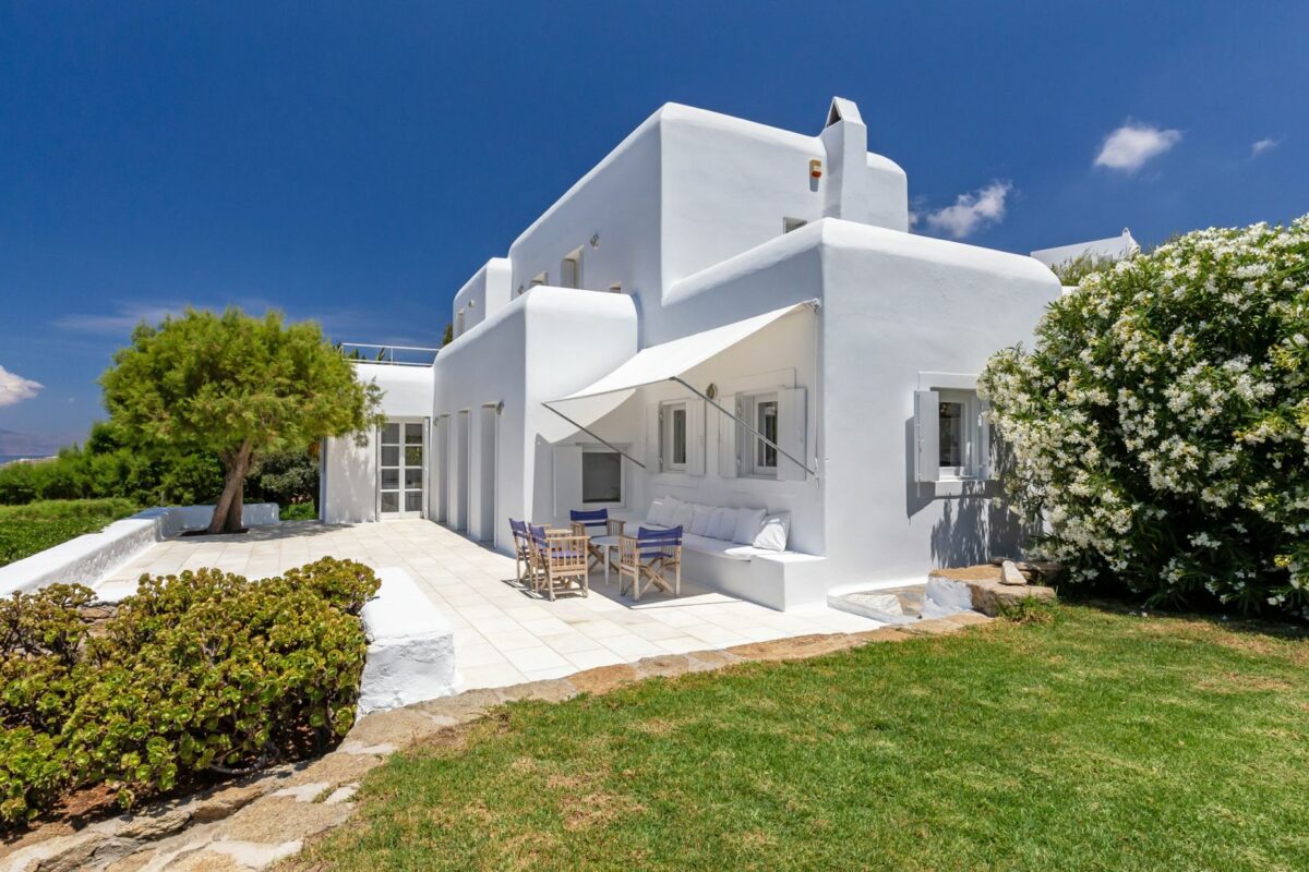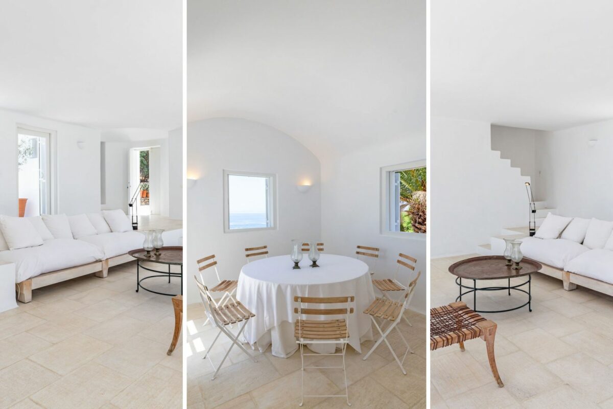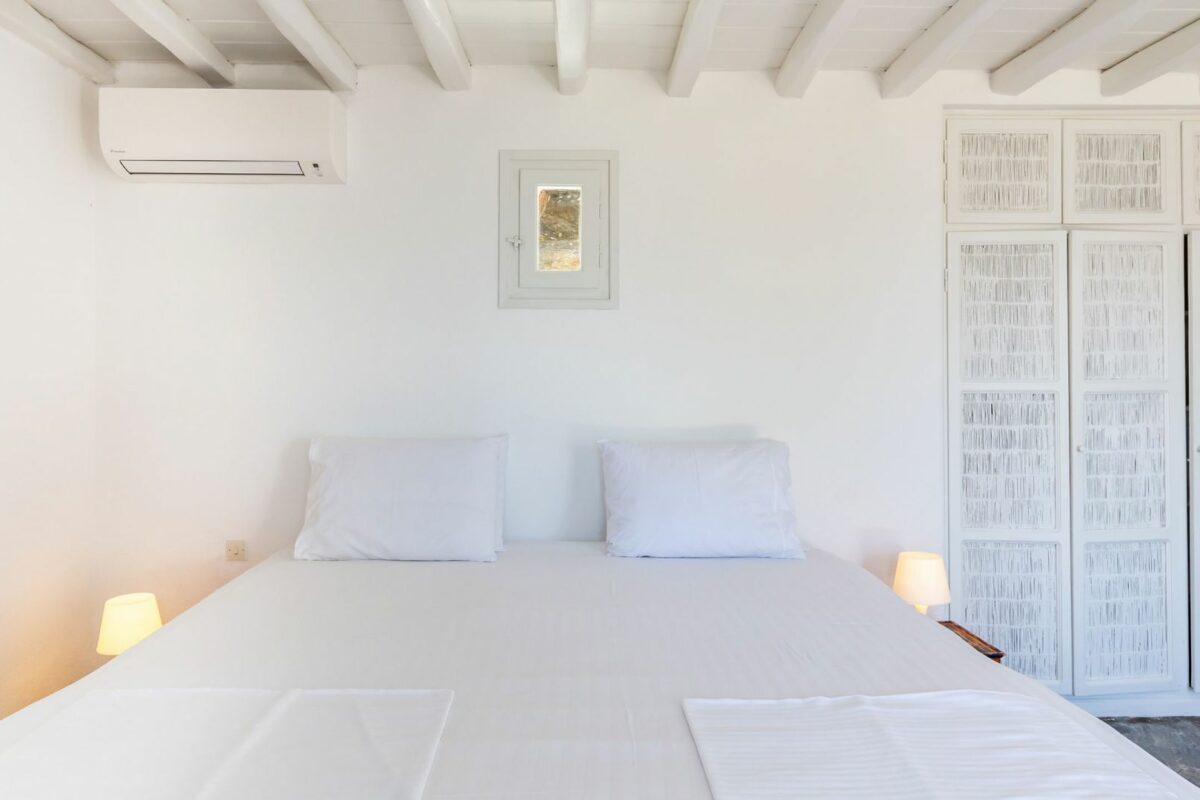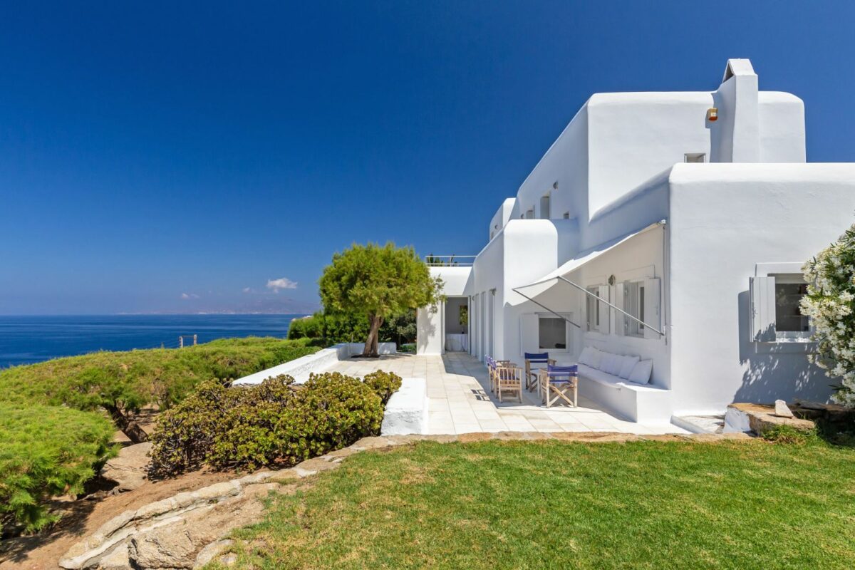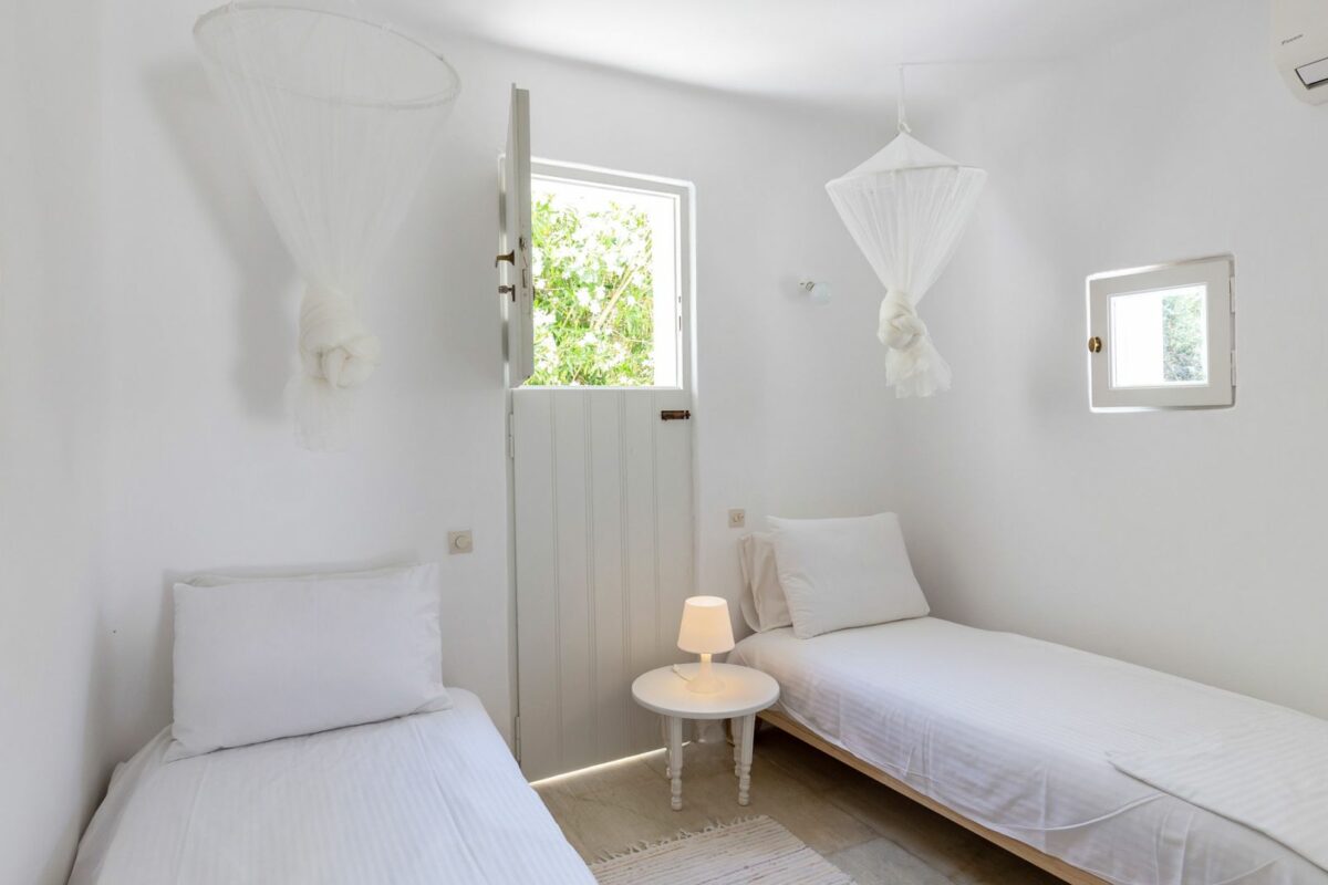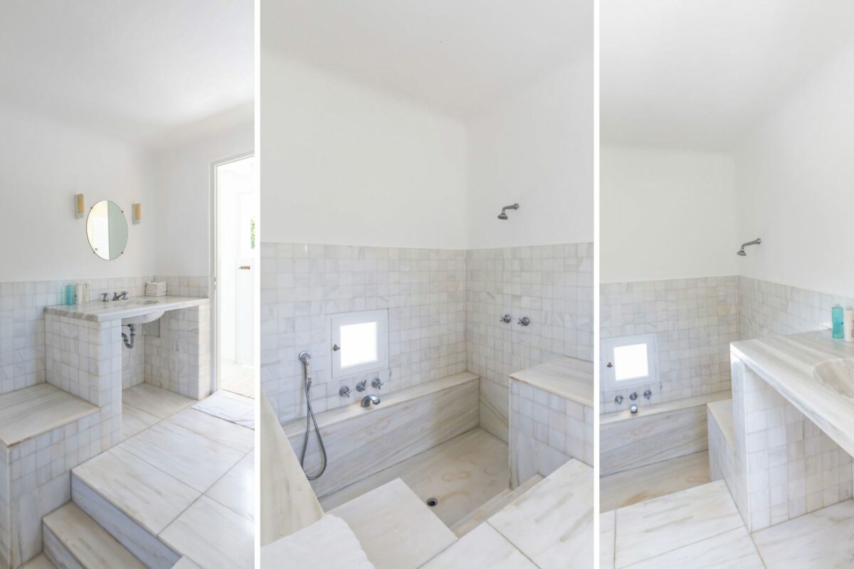 The villa’s terraced garden and patio offer many outdoor living areas, all enhanced with an array of cushions, director’s chairs, coffee tables and wood-woven sun-beds. Views stretch from the old harbor of Mykonos to the tip of the Ano Diakoftis peninsula which can be enjoyed from any point of the olive grove and terrace where a plunge pool has recently been added for guests' pleasure.