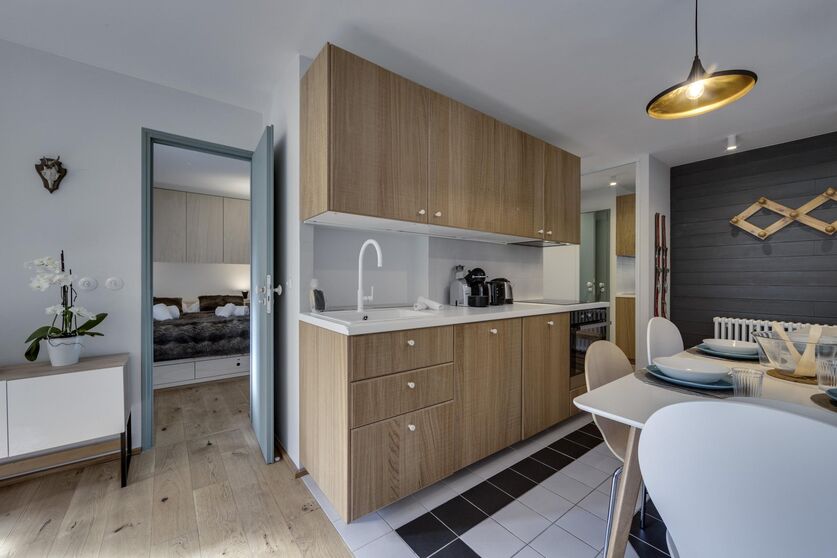 Superbement rénové dans un style scandinave lumineux et minimaliste, l'appartement Les Oréades 101 offre un environnement à la fois pratique et relaxant. La cuisine entièrement équipée fait face à un espace repas convivial. Le salon, baigné de lumière grâce à une grande baie vitrée, s'ouvre sur un balcon. L'espace nuit comprend une chambre double et une chambre adaptable avec deux lits simples et un lit suspendu. Une salle d'eau avec une vaste douche à l'italienne et une double vasque complète les installations.