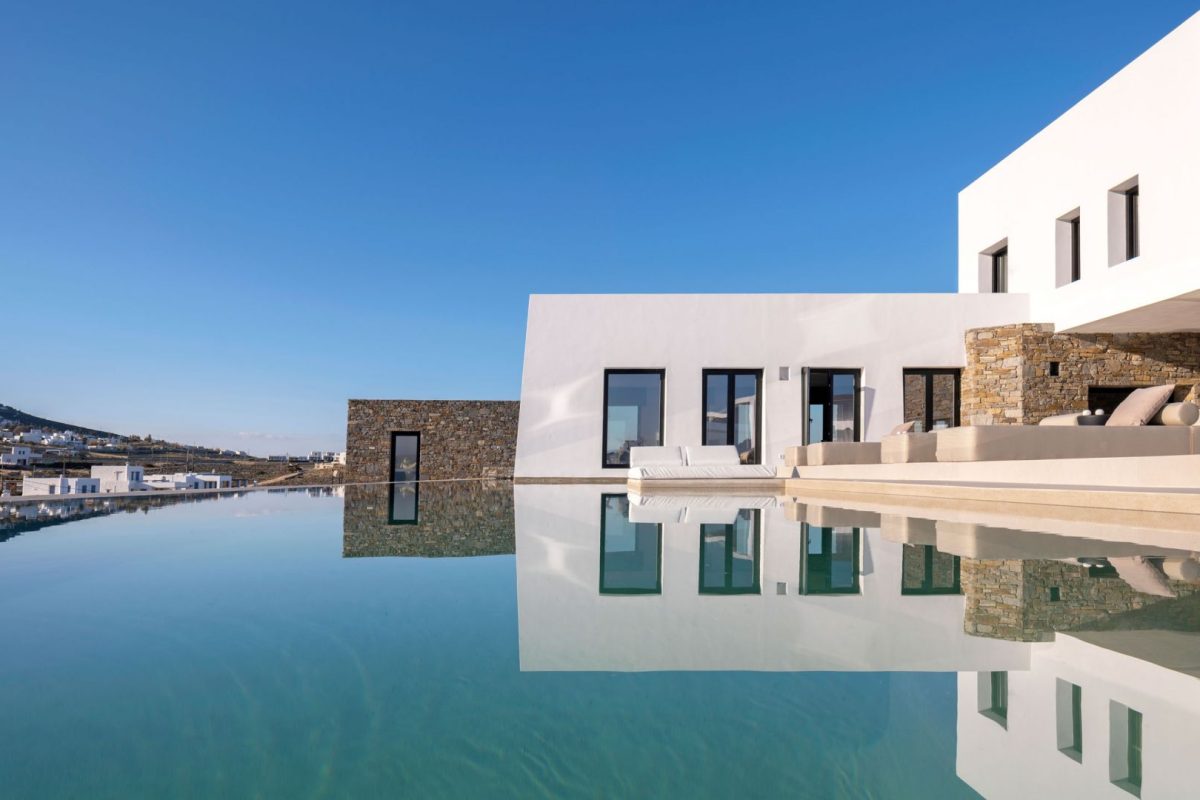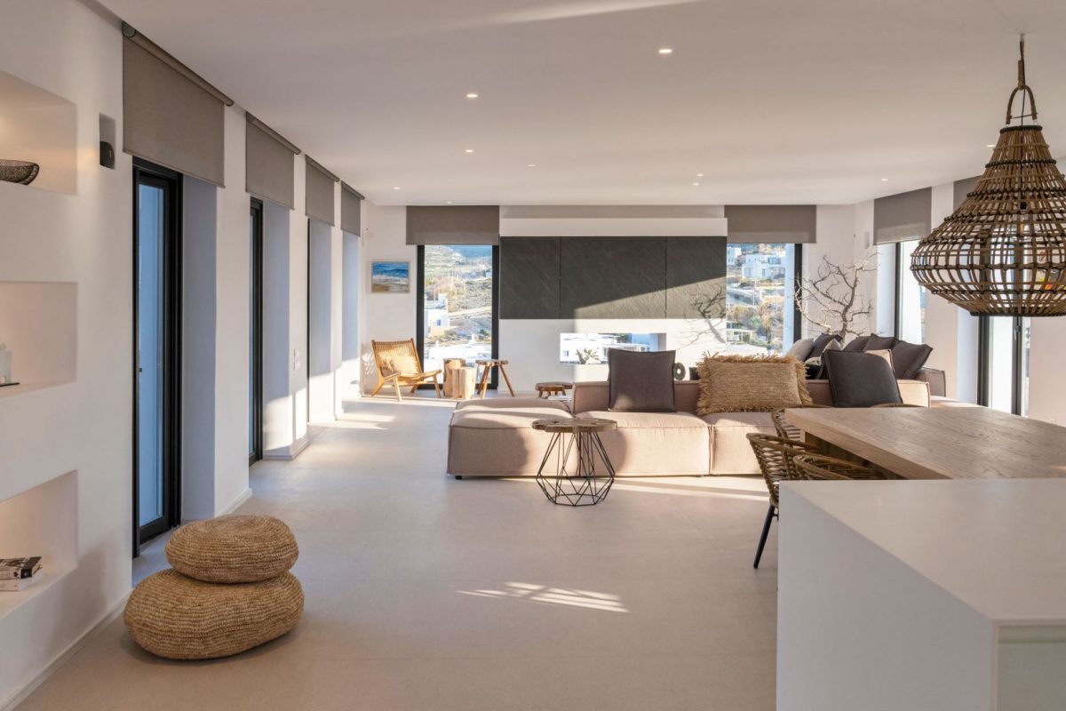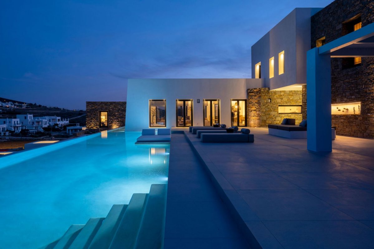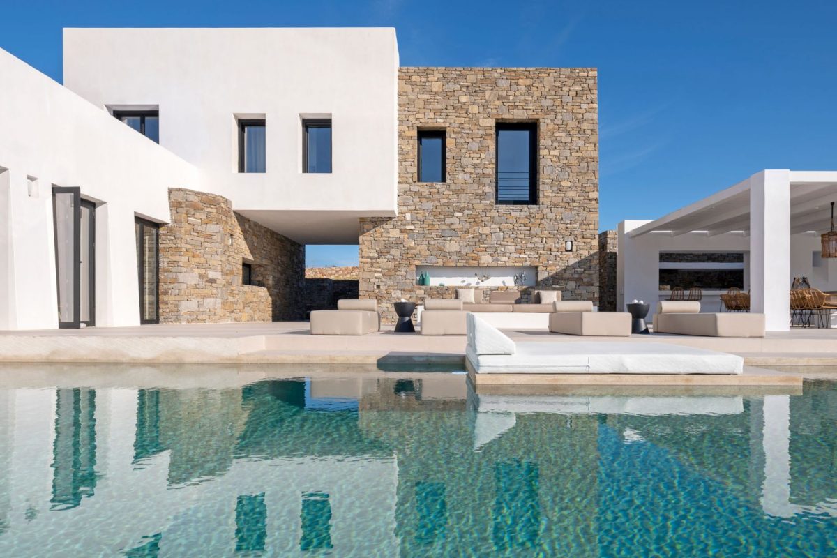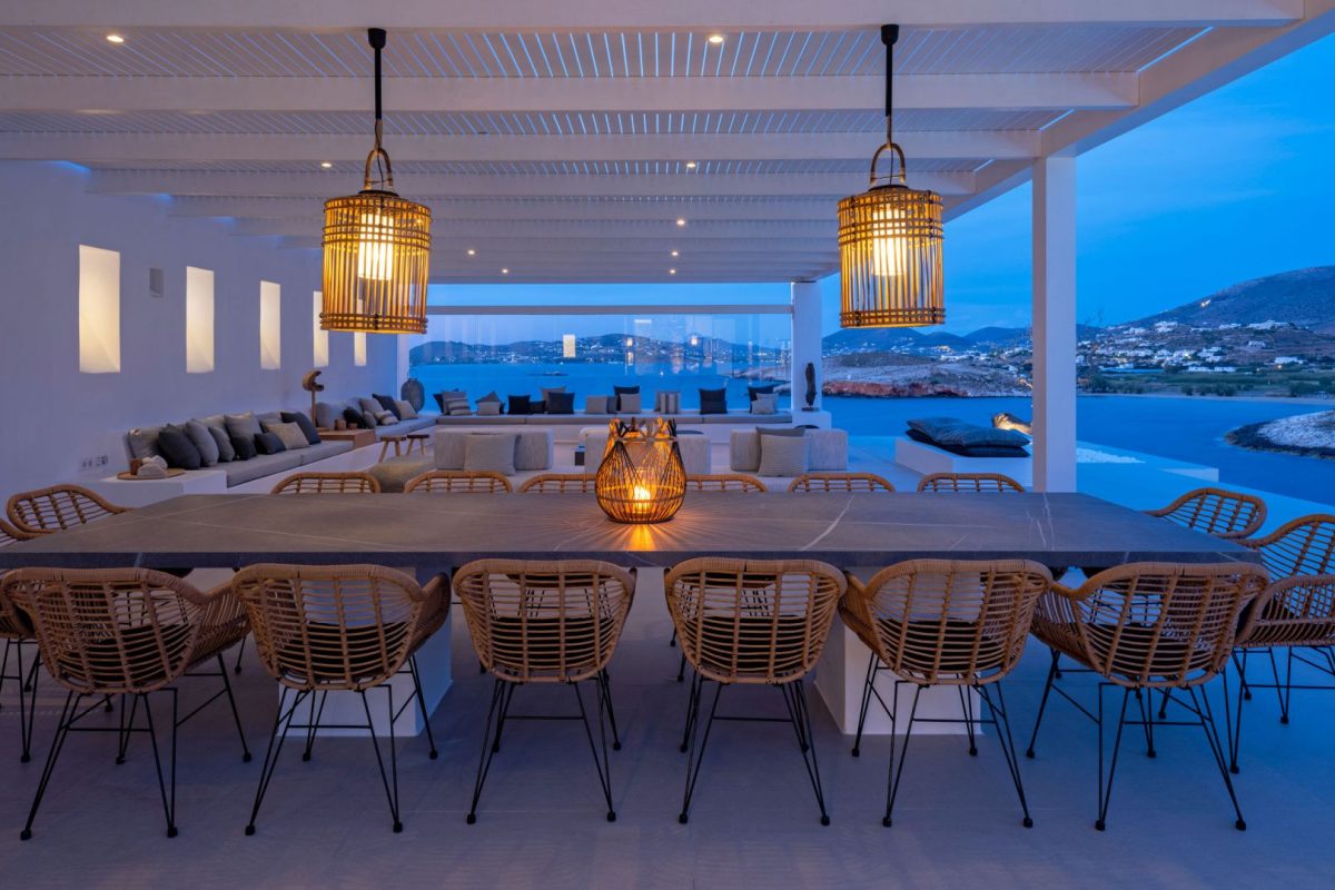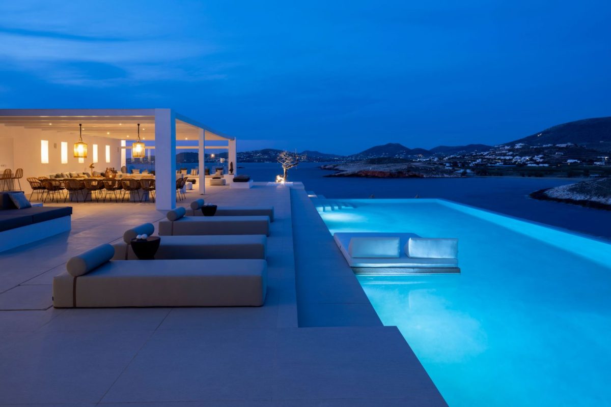 The magnificent Villa Orizzonte, recently completed, occupies a dominant position on Parasporos Bay. This large villa enjoys an unobstructed view of the sea and the coast with Antiparos in the background. The location is enhanced by the direct access to the sea just below the property and the proximity to the popular beach of Parasporos. The charming town of Parikia, with numerous restaurants and shops for all tastes, is just a short drive away. The architecture of the property highlights a contemporary approach that is perfectly balanced with natural stone elements, alternating with the typical all-white walls. Beyond the large infinity pool that winds its way onto the property's main terrace, guests will be attracted by the large, covered outdoor lounge and dining area – providing an extremely enjoyable environment, designed to accommodate large groups in maximum comfort.
