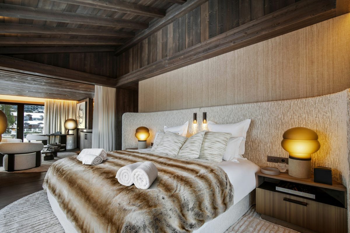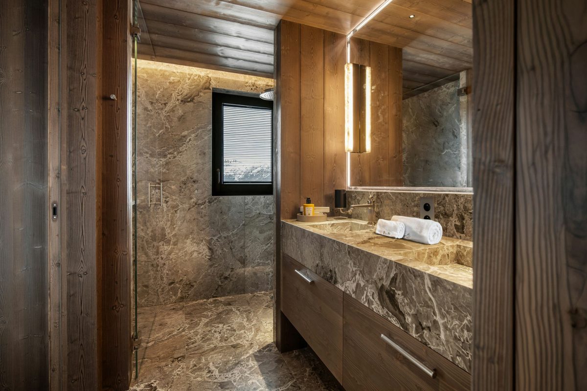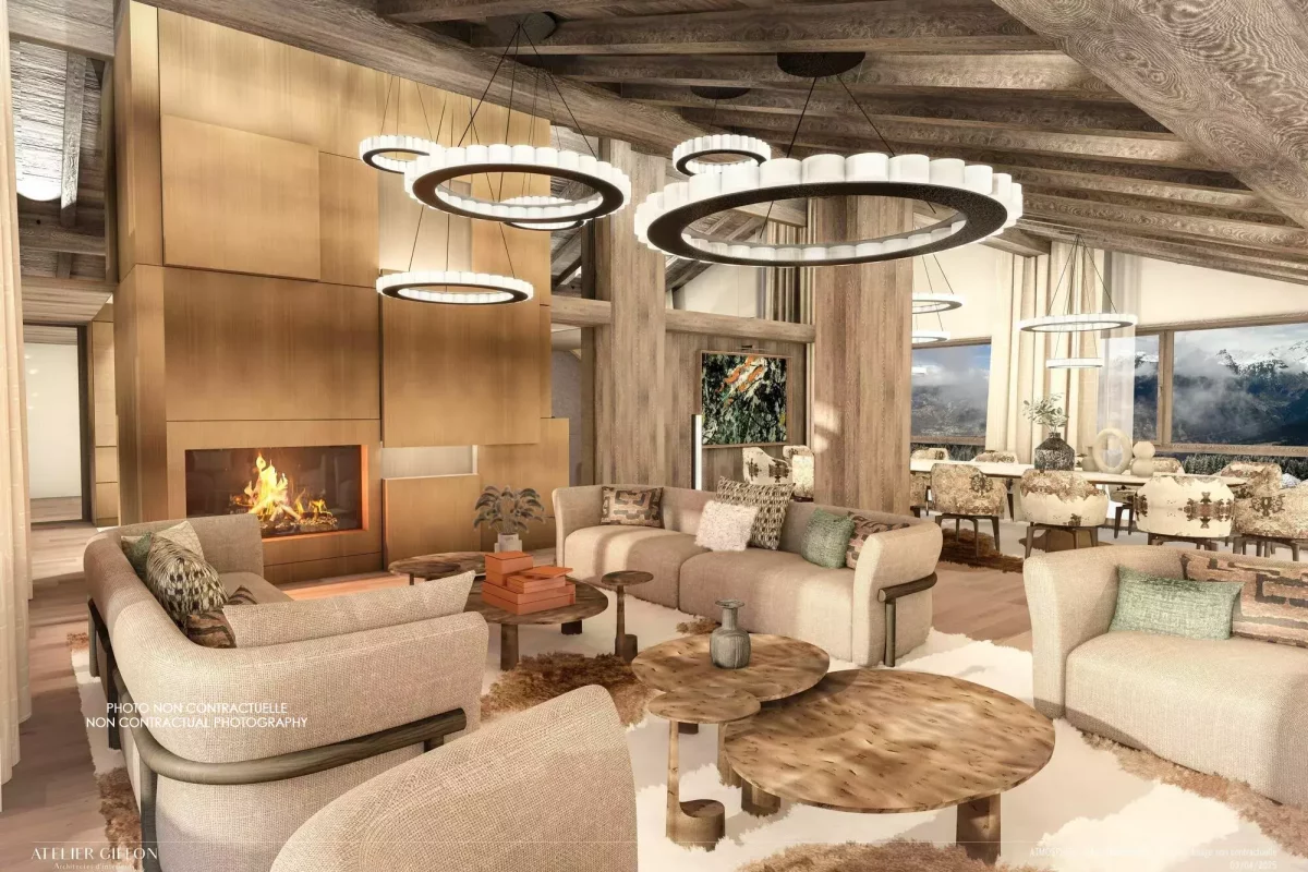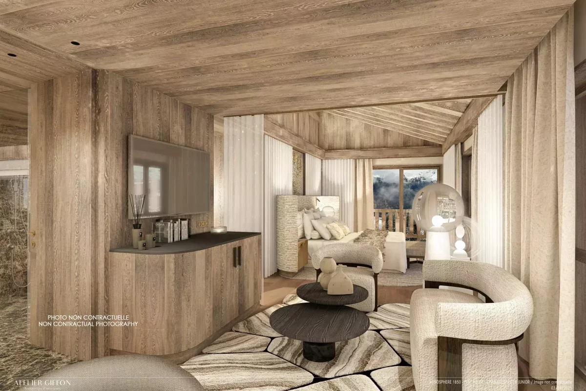 The interior embodies modern design while retaining the mountain spirit, thanks to the fireplace. It features a sauna, a jacuzzi, and a massage room.