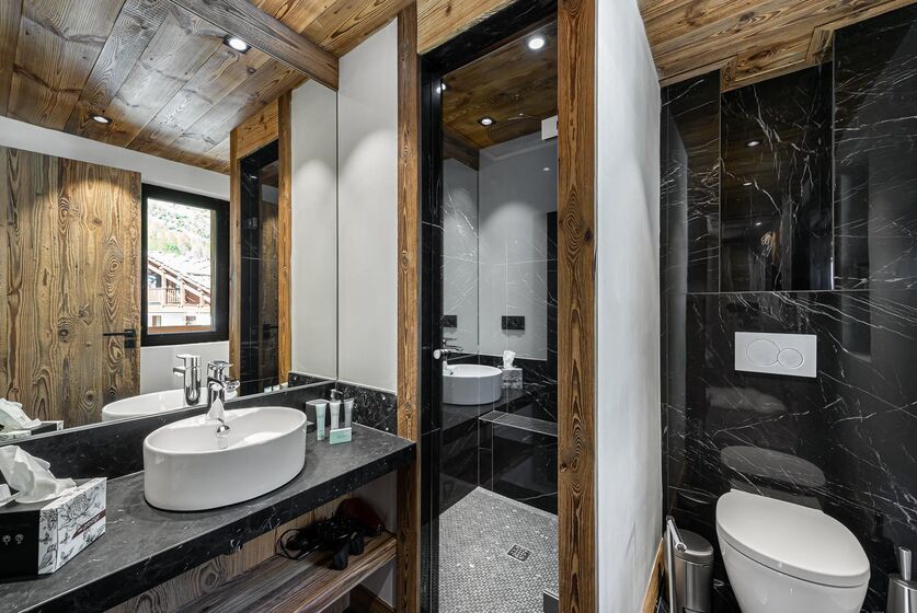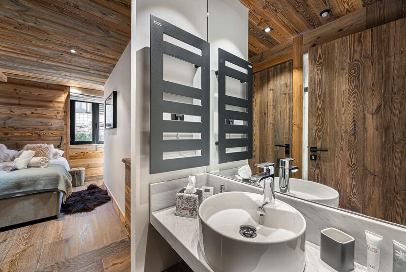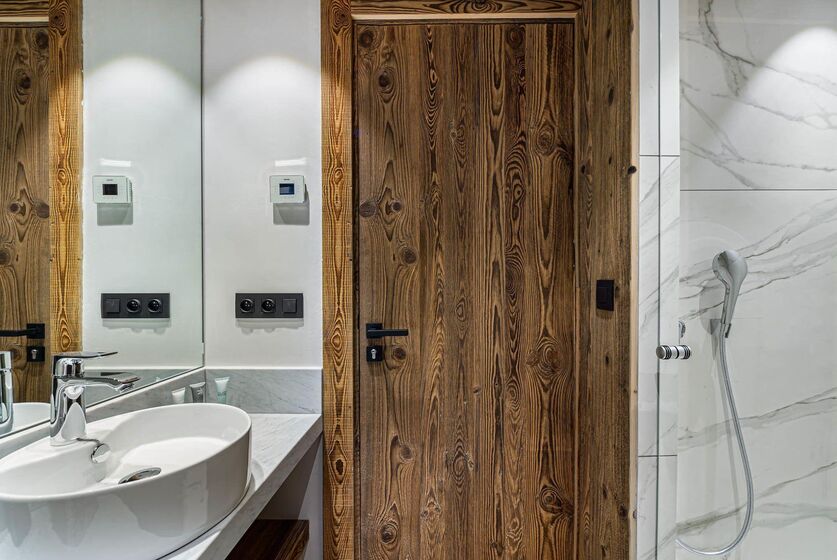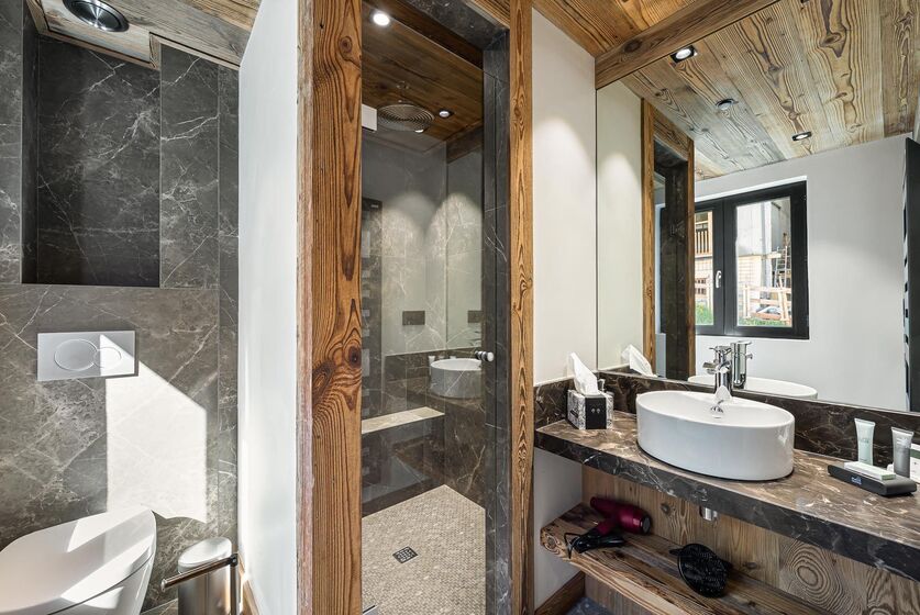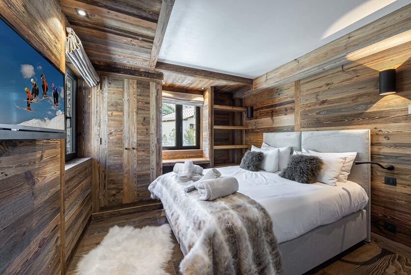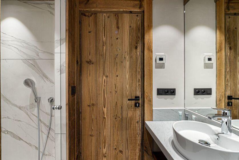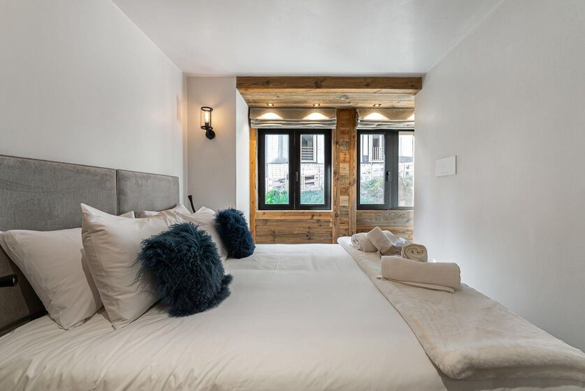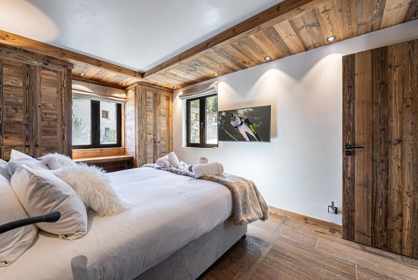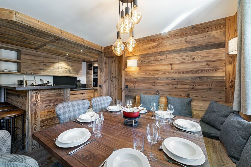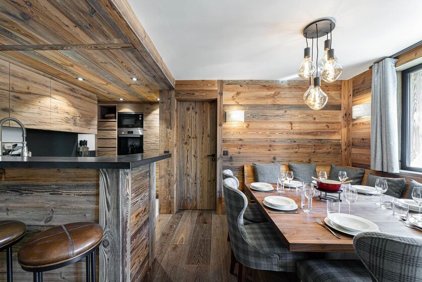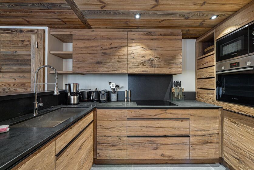 The apartment has been designed with perfect respect for the Alpine construction style, where wood reigns supreme. From the parquet floors to the walls including the superb open kitchen, this natural nobility is omnipresent. The different types of wood harmonize perfectly with the magnificent stone fireplace. The living room seating offers divine comfort, ideal for relaxing after a day of pure fun on the slopes. Their gray color brings a touch of softness and tranquility, accentuating the already abundant light thanks to the numerous windows opening onto the exterior landscape.