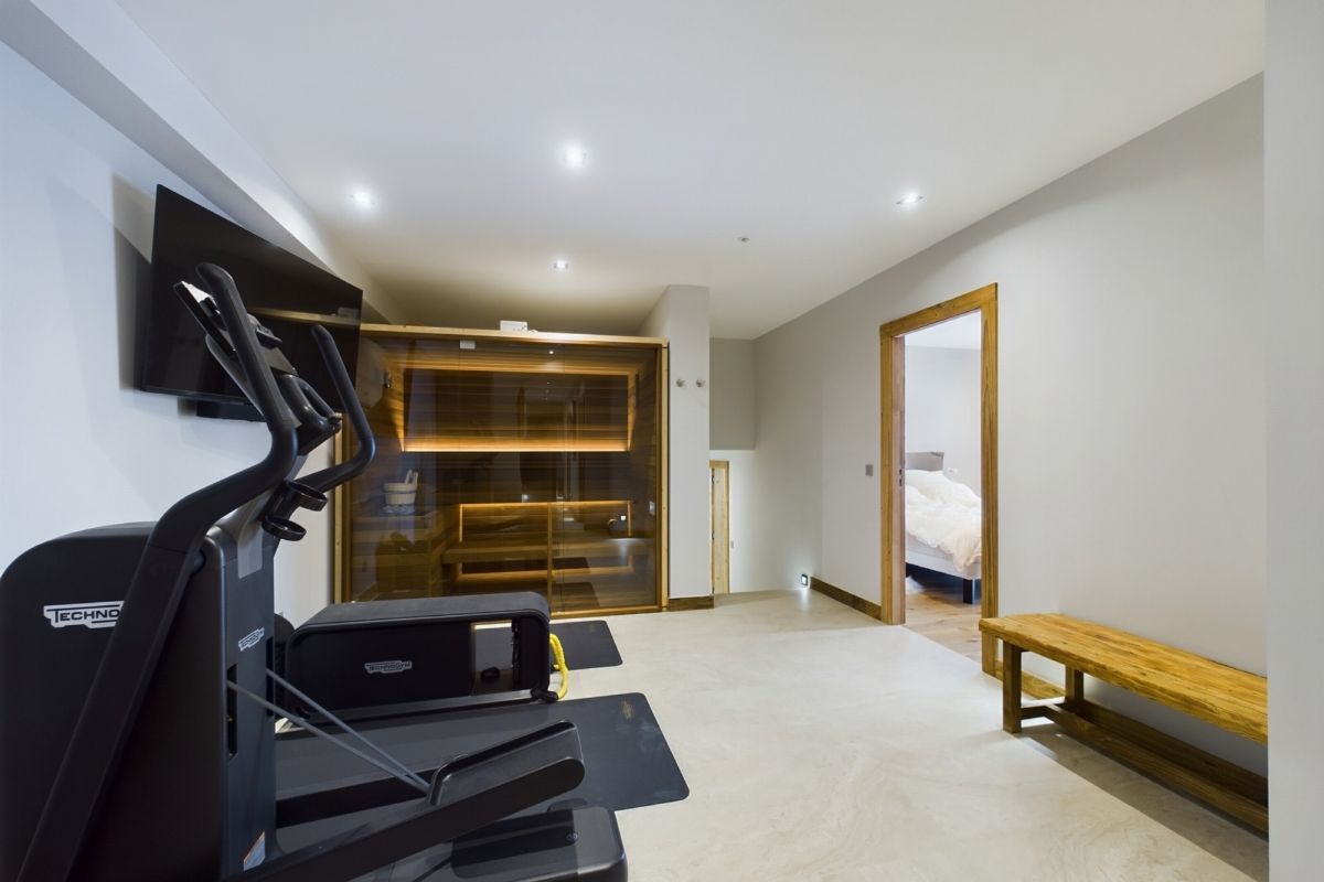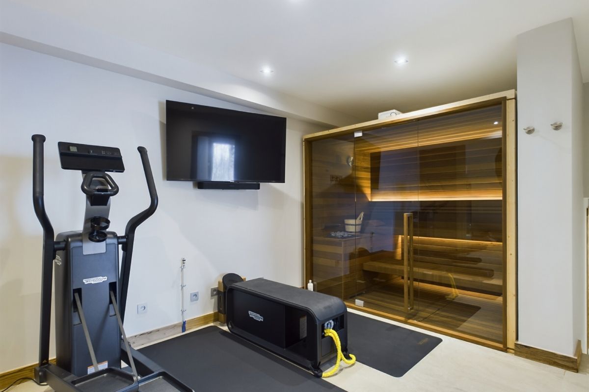 > Espace gym avec vélo elliptique, poids, tapis et TV