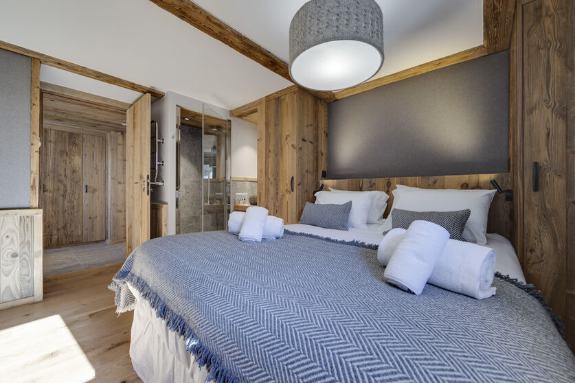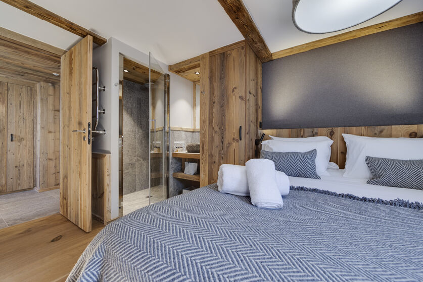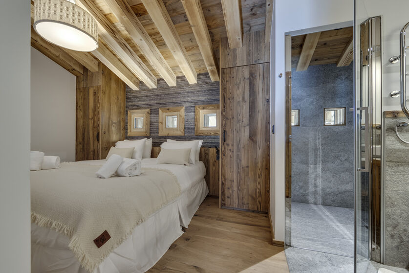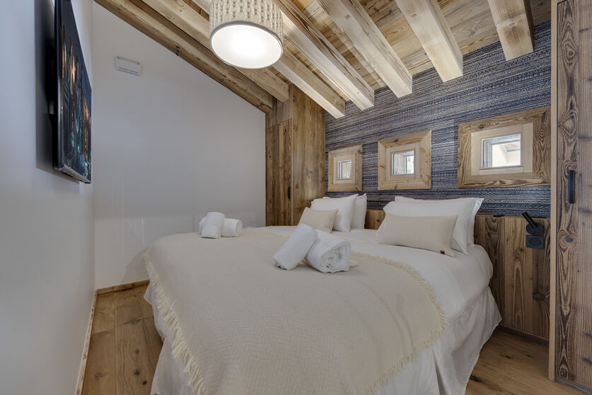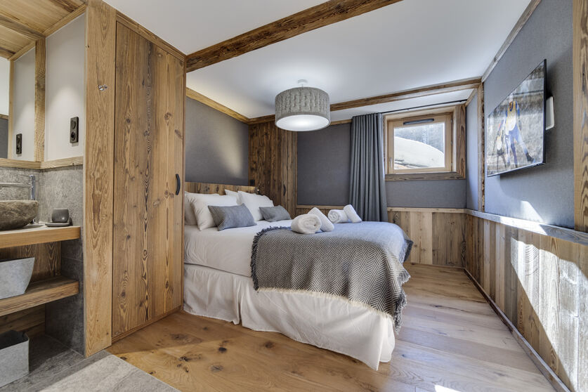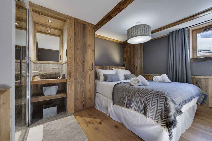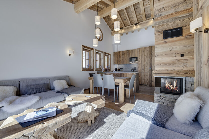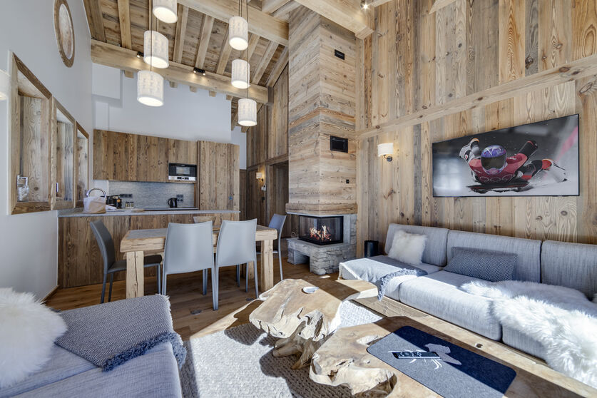 The Rives de l'Isère 6 apartment boasts a warm yet modern decor. It features two double bedrooms with private bathrooms, a children's bedroom with bunk beds, and a spacious living area. The living room, featuring a fireplace, a dining area, and an open-plan kitchen, opens onto a balcony offering stunning views of the picturesque hamlet of Le Fornet and the Isère Valley.