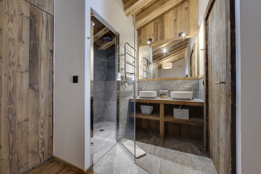 ensuite bathroom with Italian shower, double sinks, towel dryer,