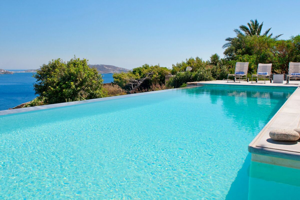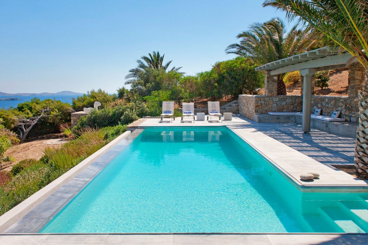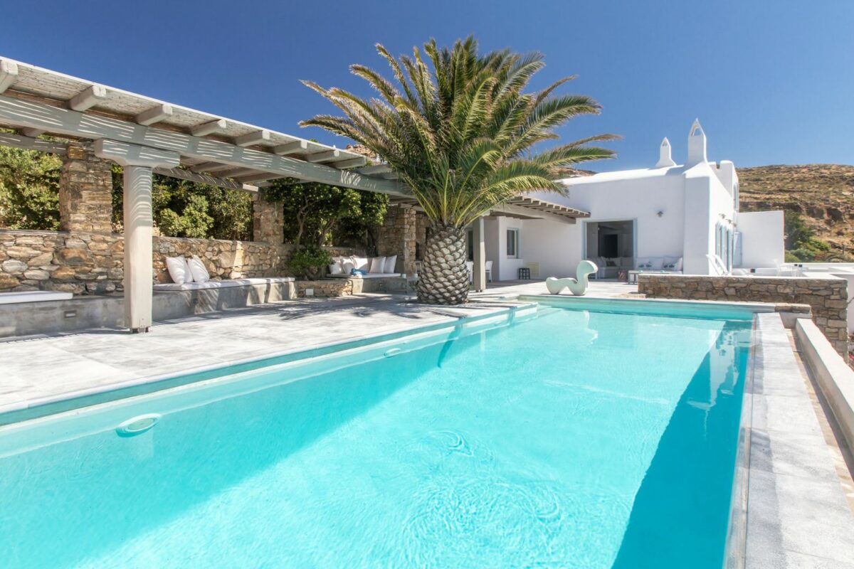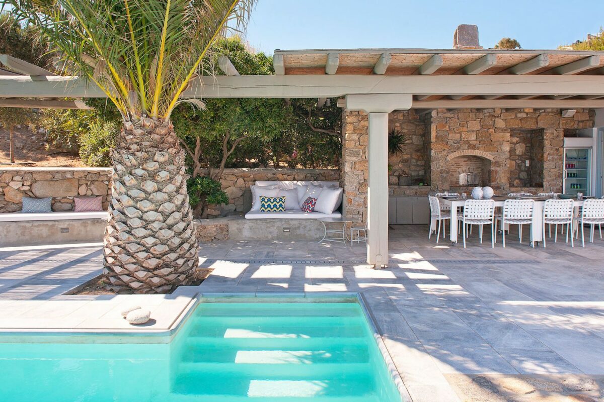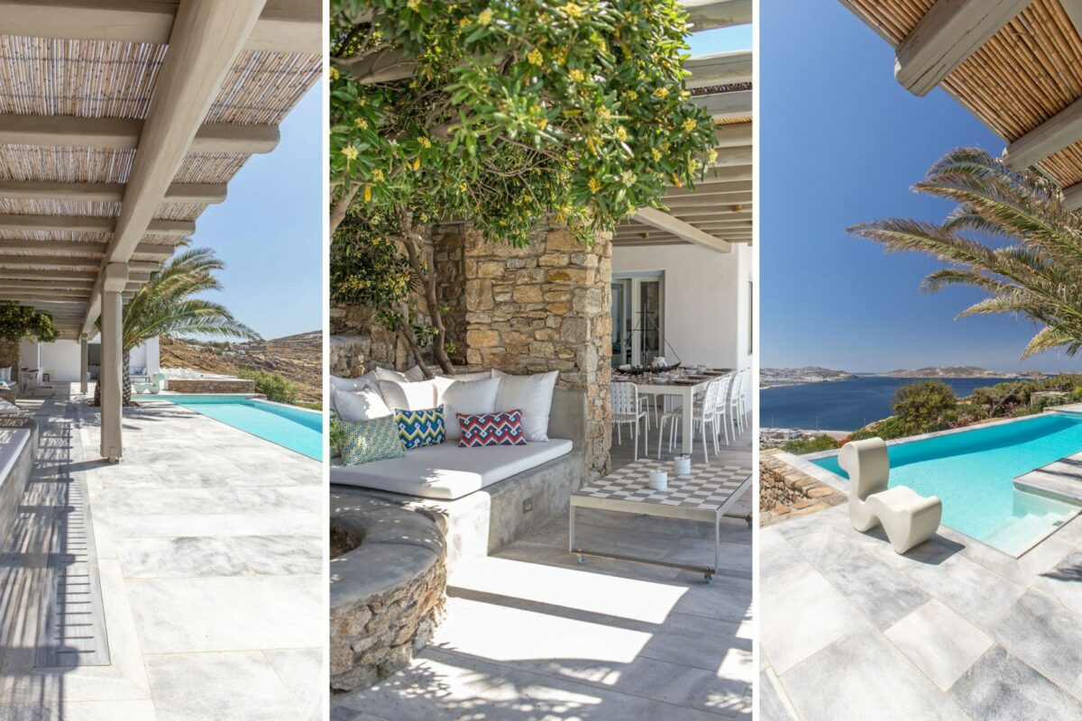 The garden is one of the first things that set Villa 9581 apart. This is one of the greenest villas on Mykonos with trees and bushes surrounding the property - some of them adding a unique touch to the extensive pool-side pergola. Your overflow pool looks out towards the panorama and is a refreshing interlude in lazy days at the villa. Satisfy your appetite in the al-fresco dining area, fitted with a BBQ grill and outdoor fridge for your vintage Rosé. The perfect spot to jump-start your day or tone it down before a big night out.