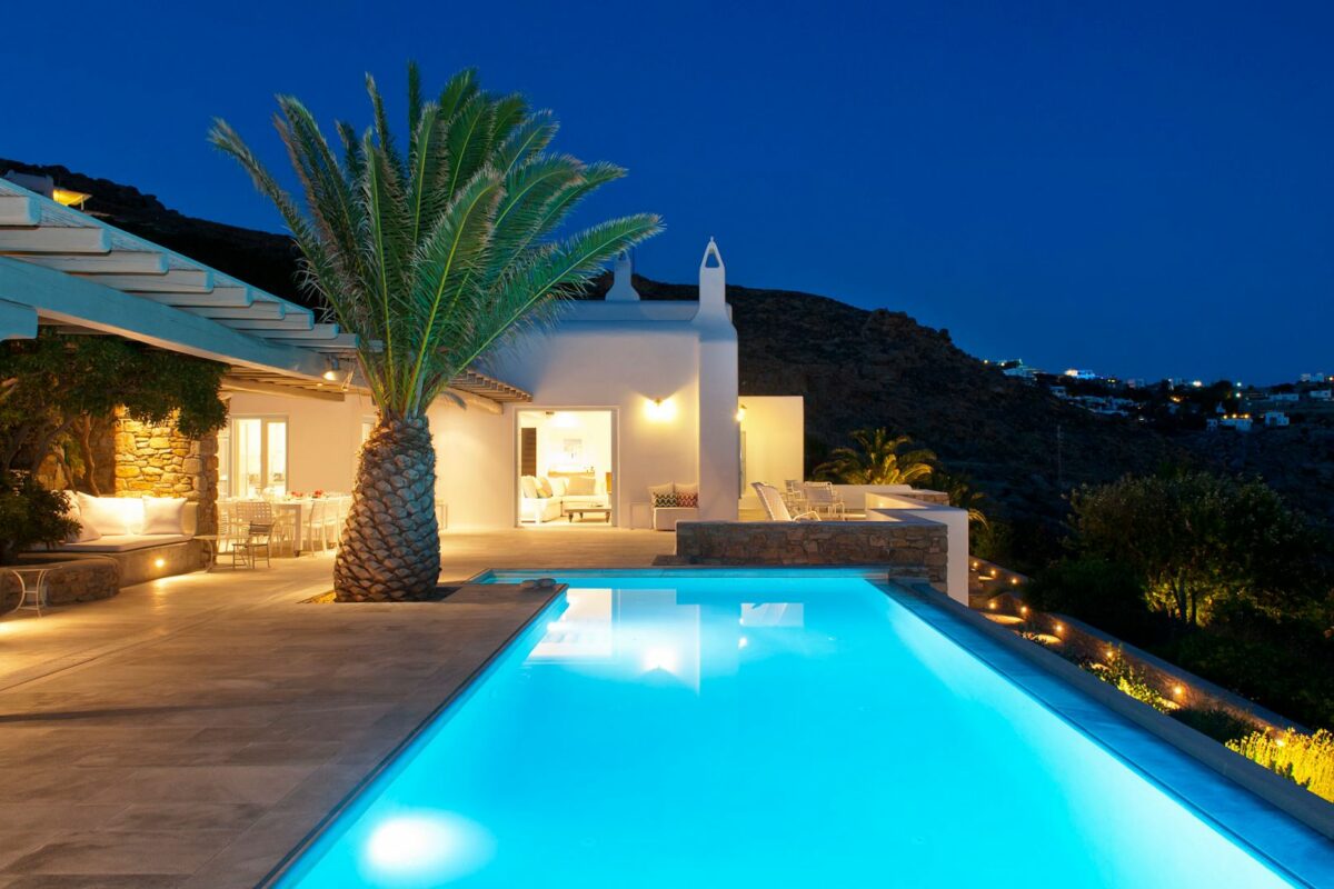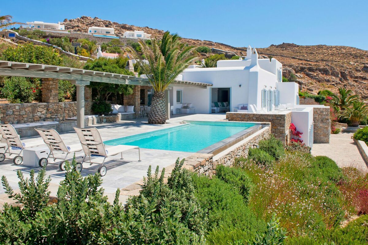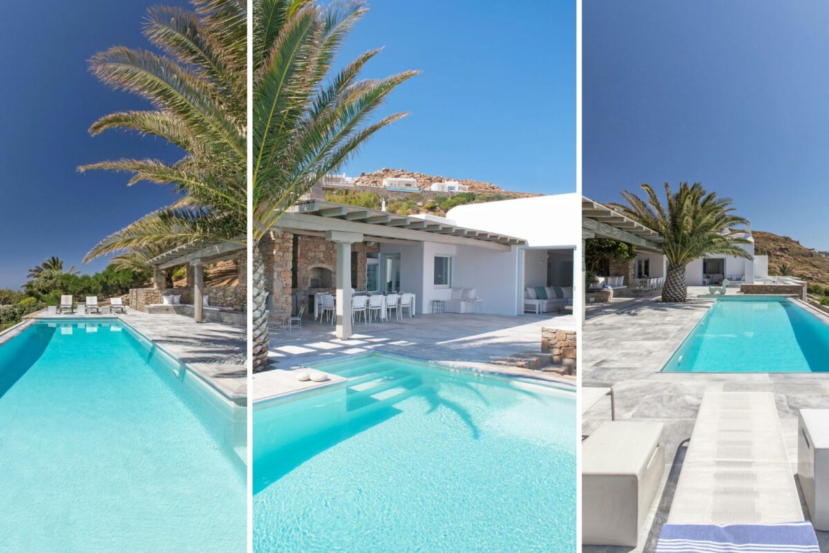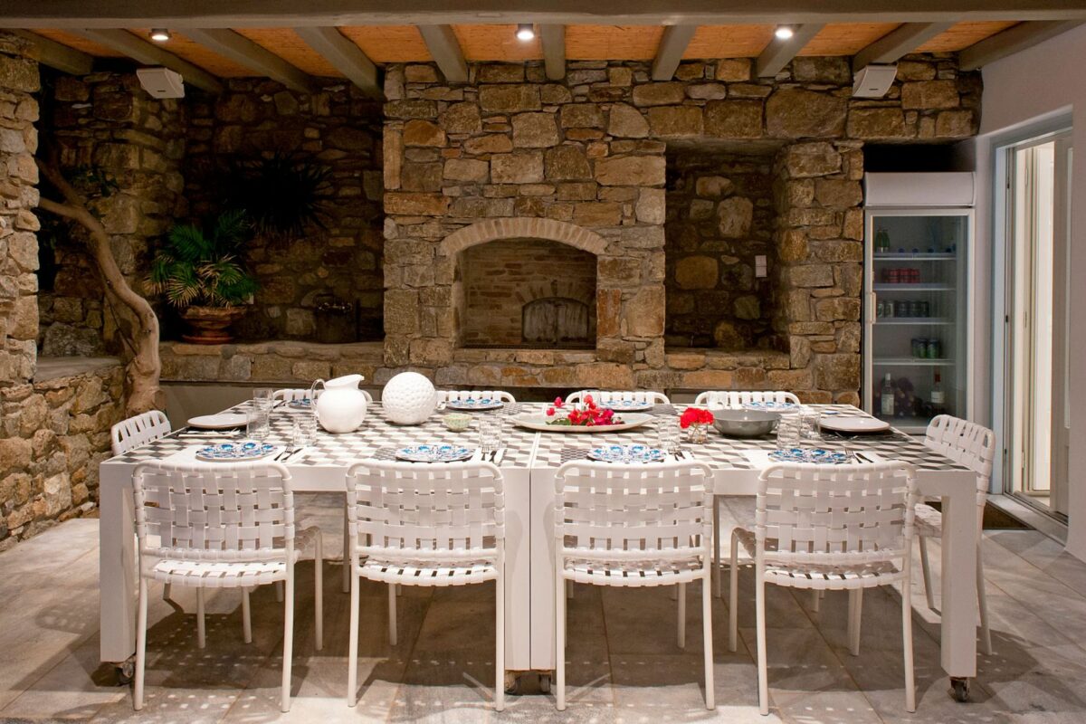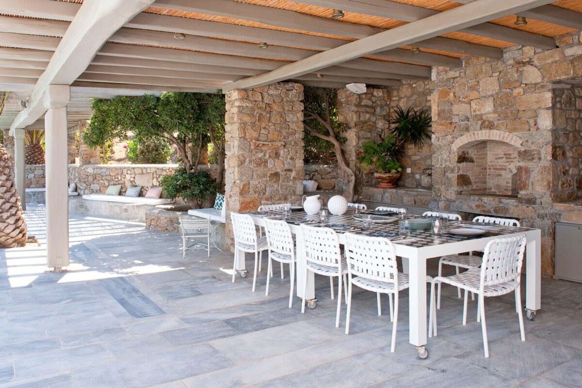 The garden is one of the first things that set Villa 9581 apart. This is one of the greenest villas on Mykonos with trees and bushes surrounding the property - some of them adding a unique touch to the extensive pool-side pergola. Your overflow pool looks out towards the panorama and is a refreshing interlude in lazy days at the villa. Satisfy your appetite in the al-fresco dining area, fitted with a BBQ grill and outdoor fridge for your vintage Rosé. The perfect spot to jump-start your day or tone it down before a big night out.