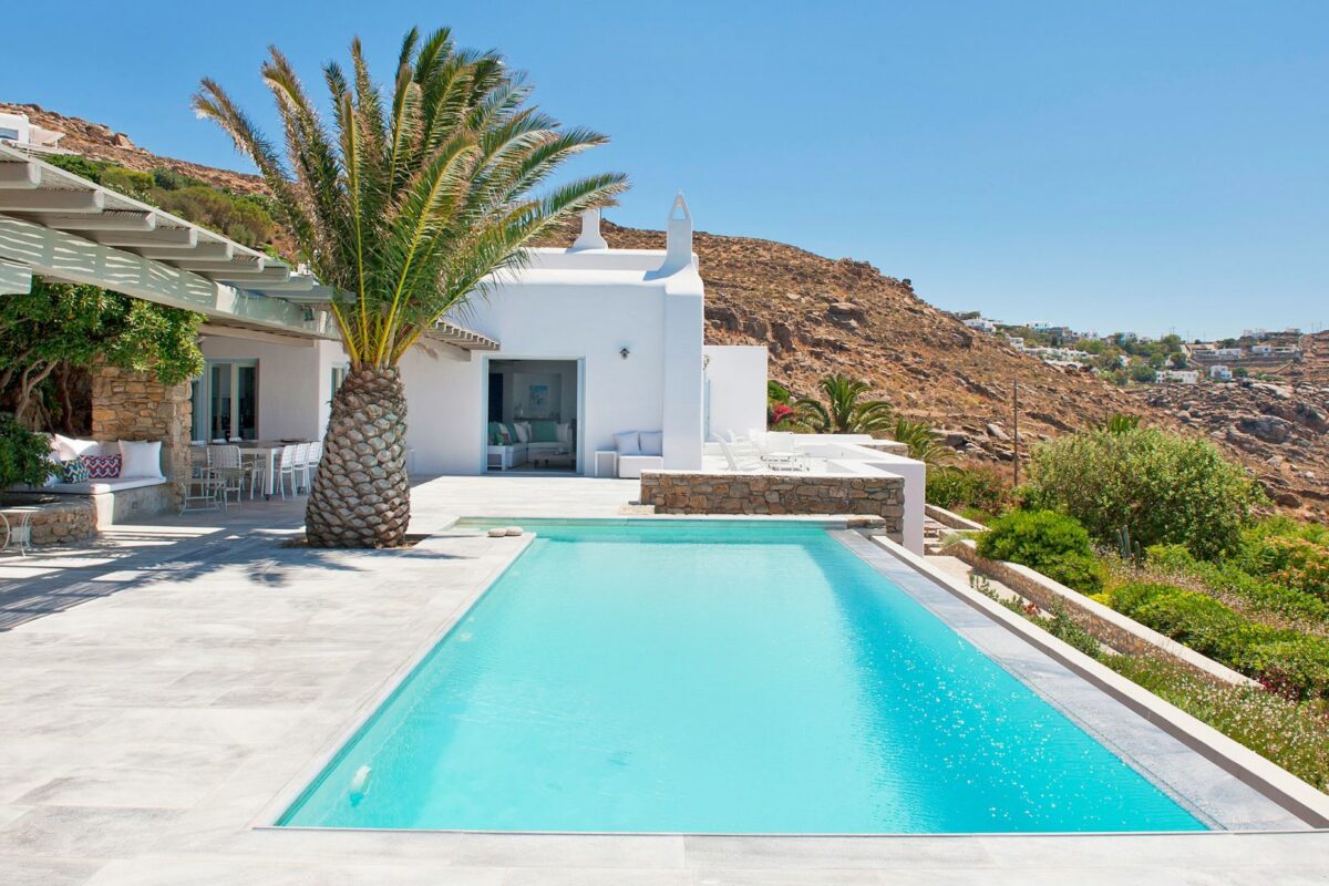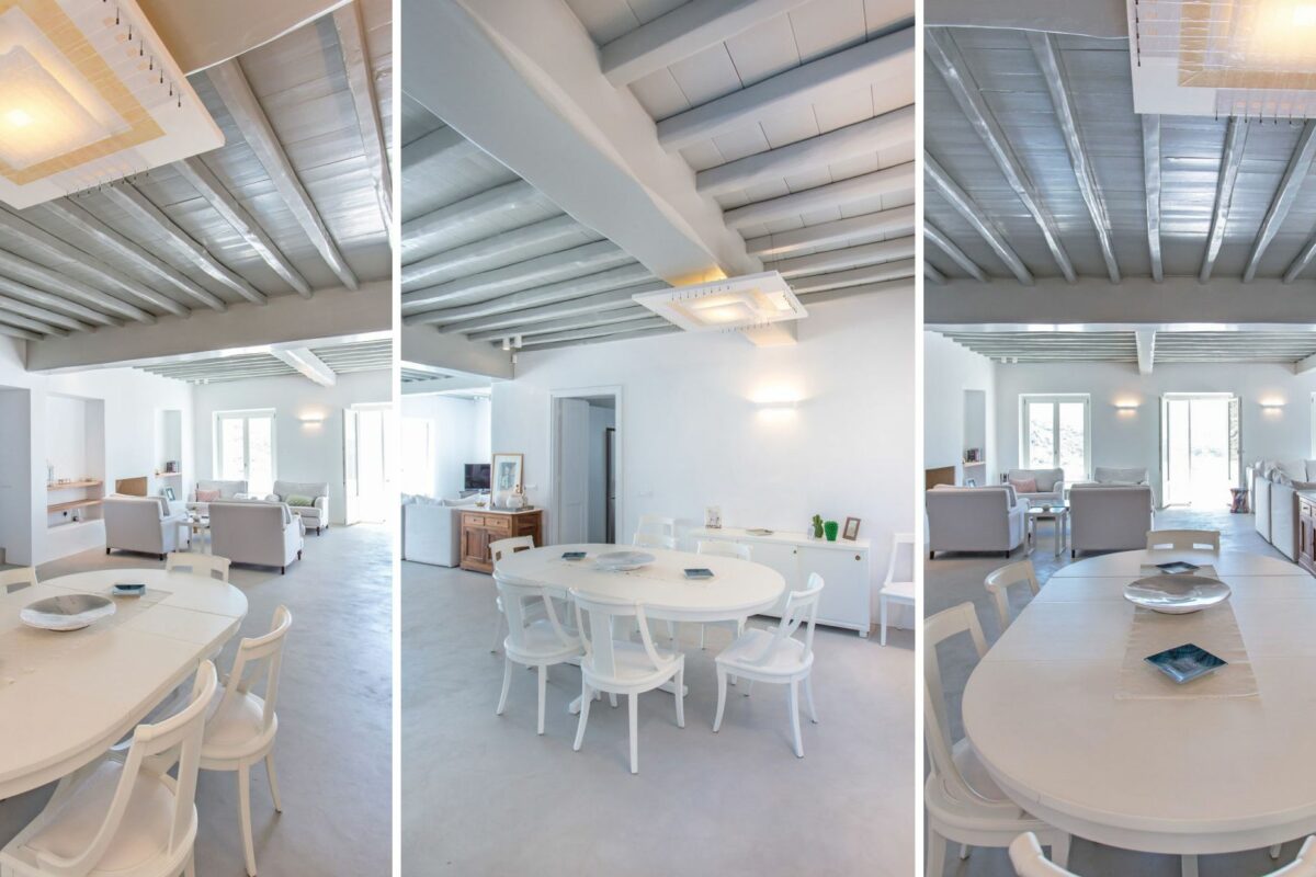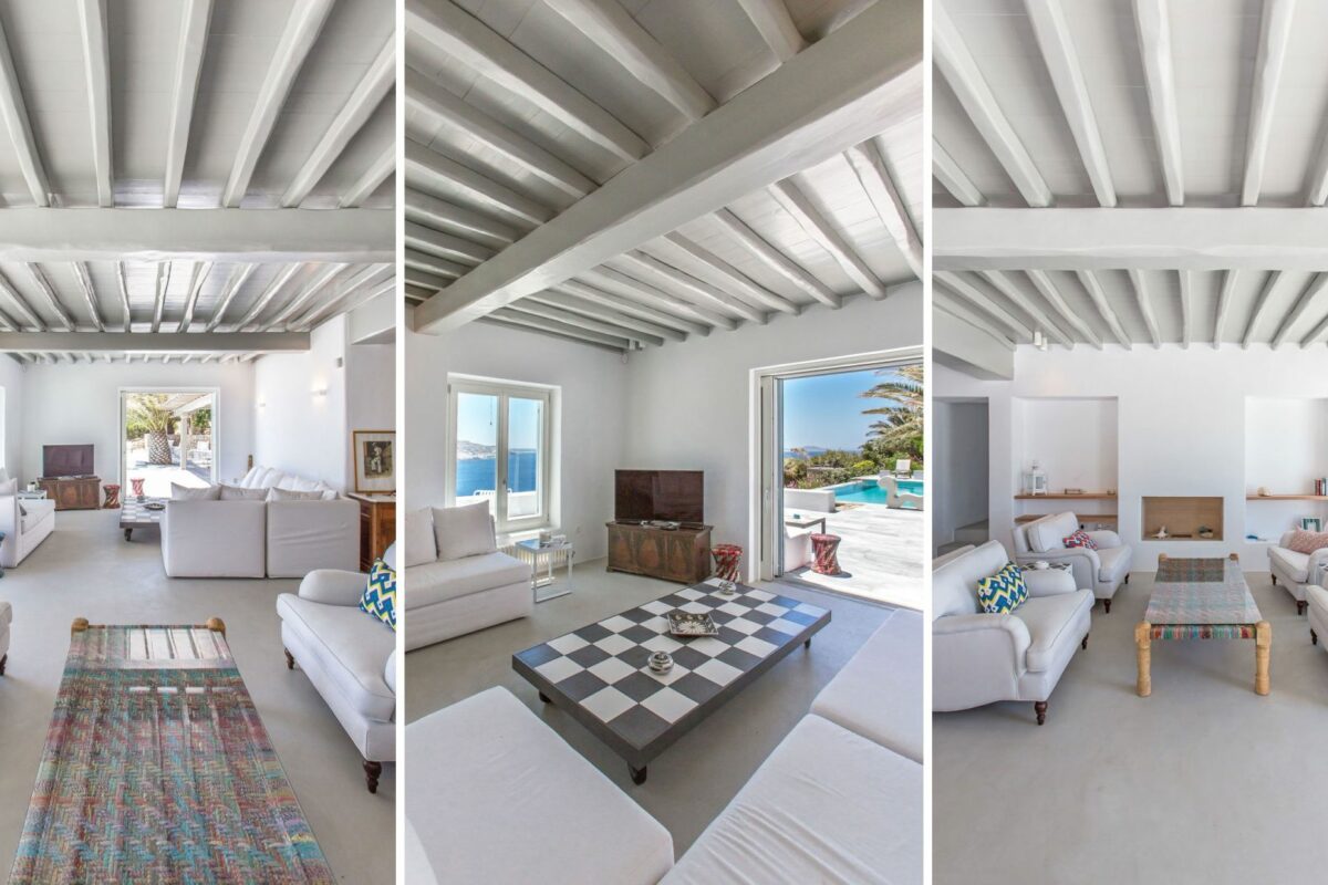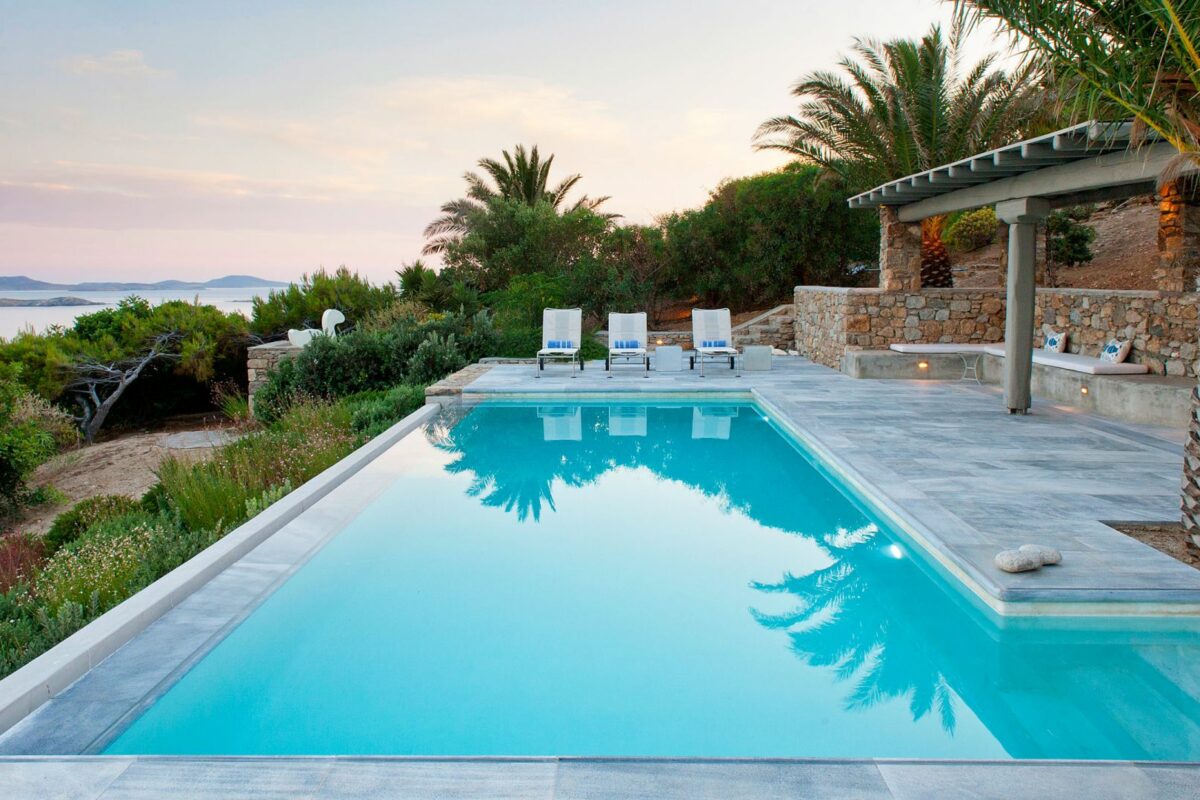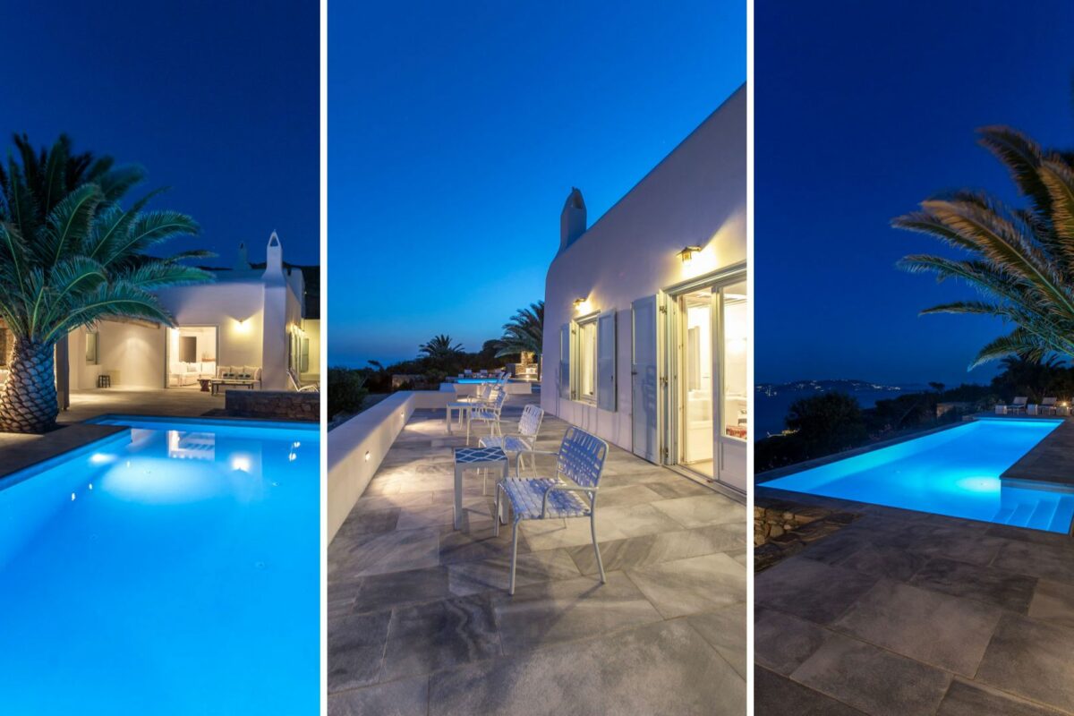 The garden is one of the first things that set Villa 9581 apart. This is one of the greenest villas on Mykonos with trees and bushes surrounding the property - some of them adding a unique touch to the extensive pool-side pergola. Your overflow pool looks out towards the panorama and is a refreshing interlude in lazy days at the villa. Satisfy your appetite in the al-fresco dining area, fitted with a BBQ grill and outdoor fridge for your vintage Rosé. The perfect spot to jump-start your day or tone it down before a big night out.