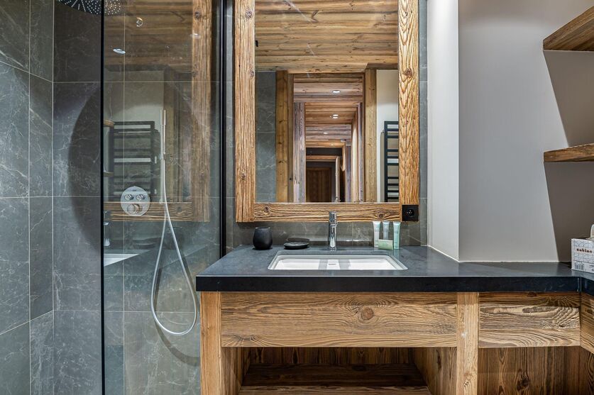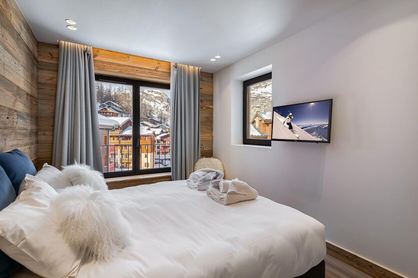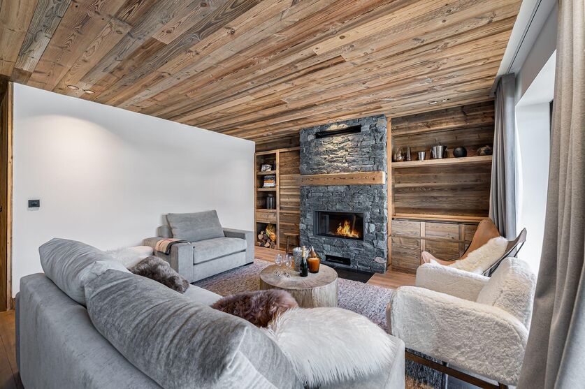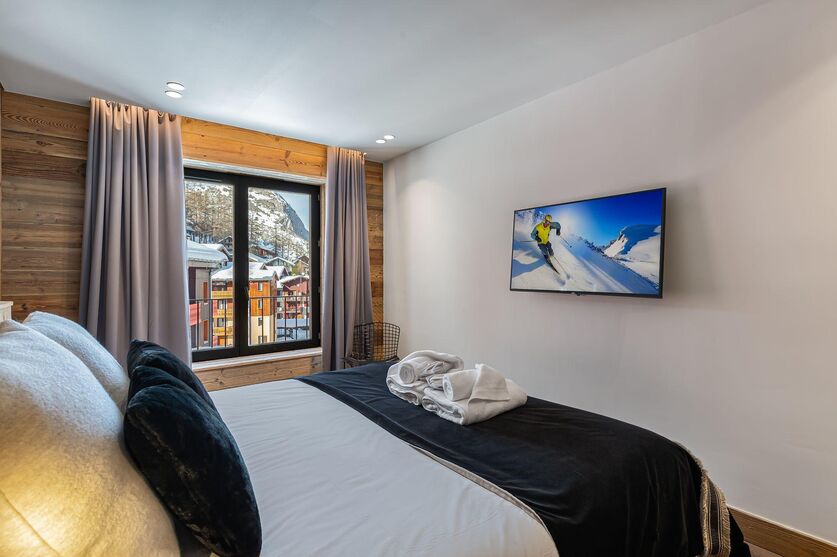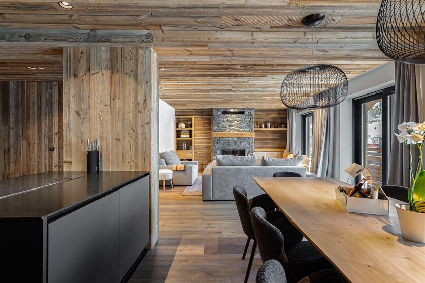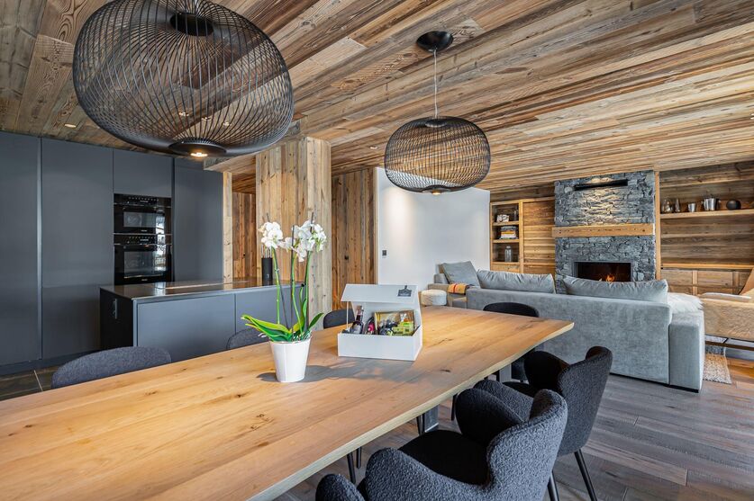 Le vaste espace de séjour propose un salon tourné vers la cheminée, un espace repas et une cuisine avec îlot. Equipé de baies vitrées sur toute sa longueur, cet espace ouvre sur un balcon depuis lequel vous ne vous lasserez pas d'admirer la vue. La décoration est fidèle au style alpin chic de Val d'Isère, mêlant vieux bois, parquet et matières douillettes.