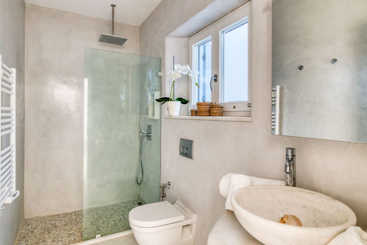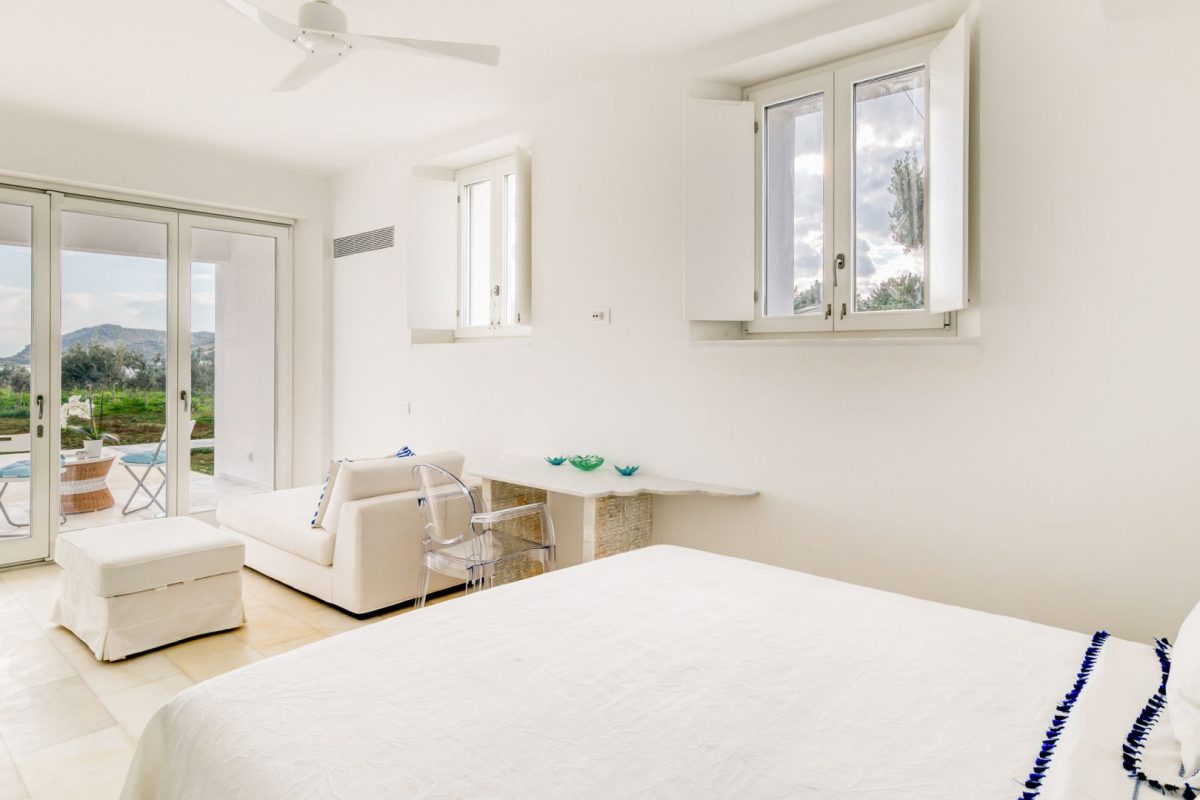 1 Guest Bedroom with pull out double sofa bed (1,5 mt), en-suite bathroom with WC, adjoining shower in massage room next door, direct access to private terrace and pool area