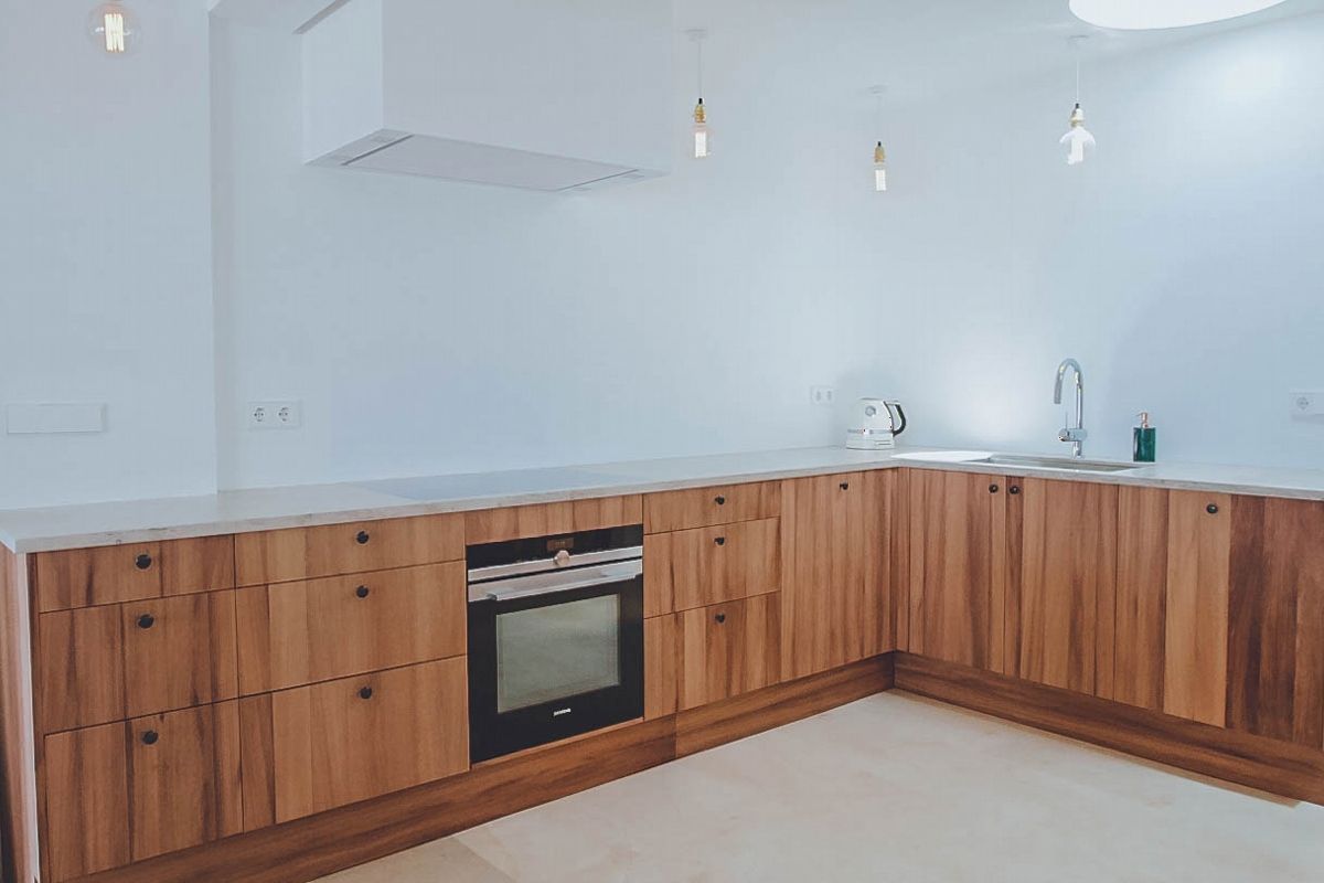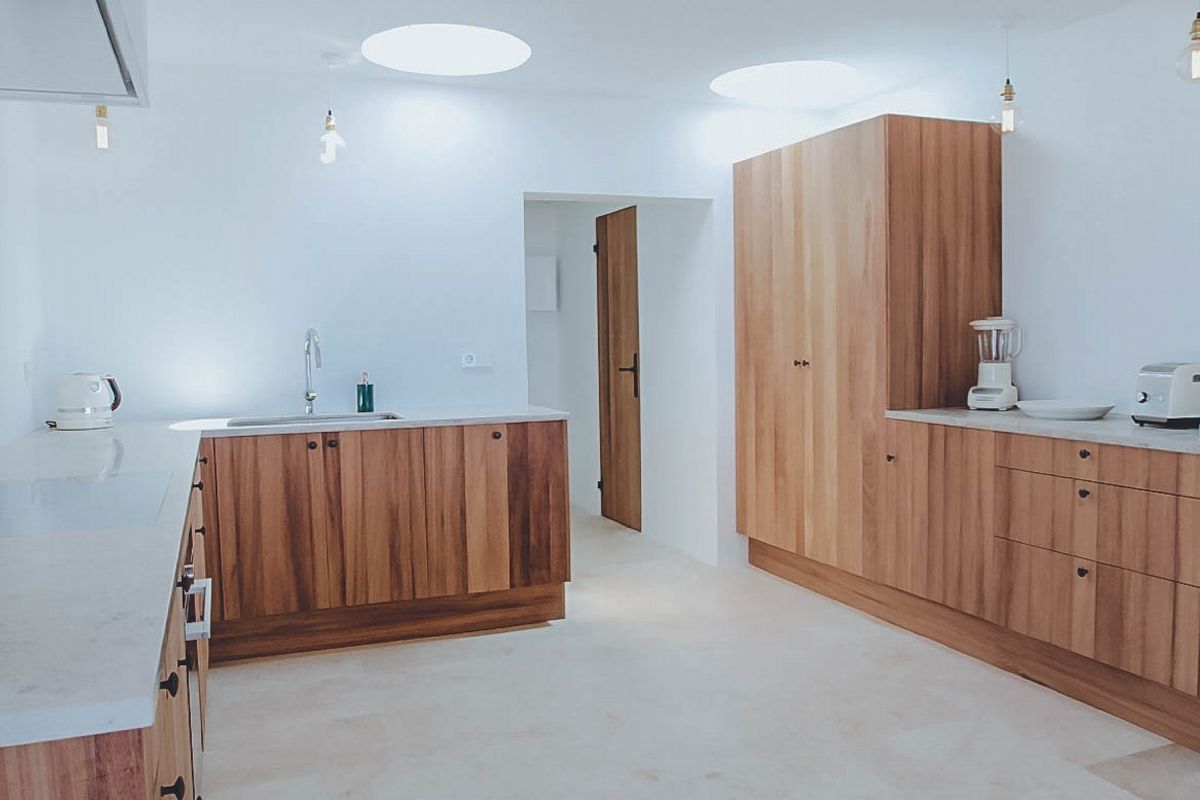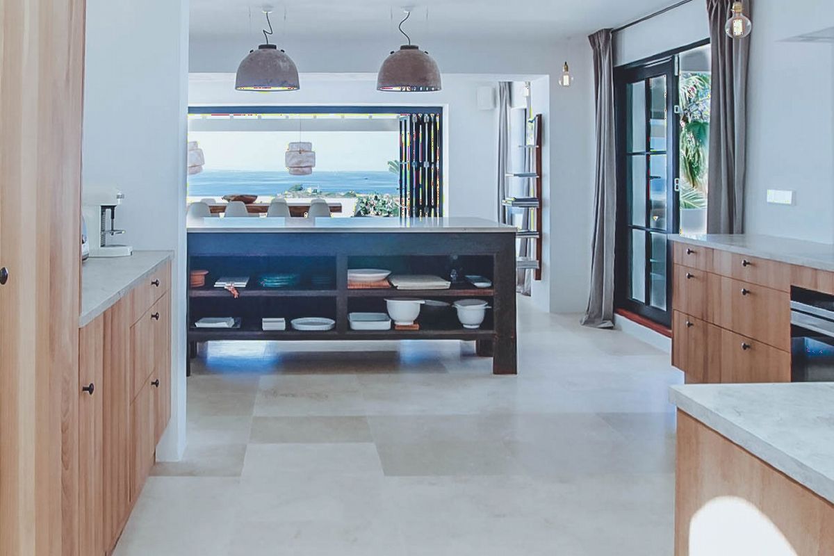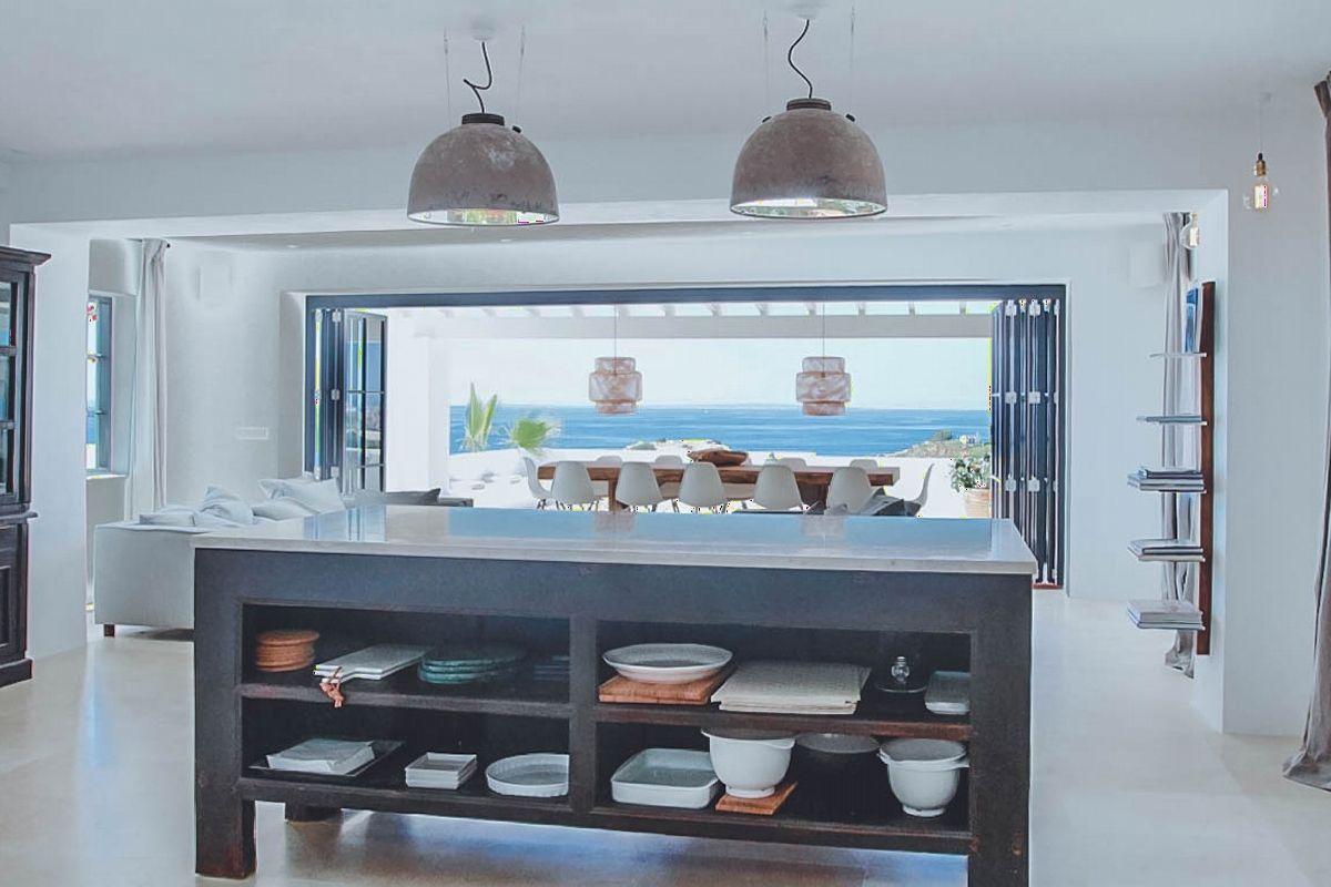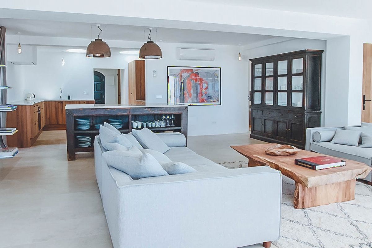 Inside, the villa offers sleek, minimalist interiors, with an open-plan design that maximizes natural light and seamlessly connects the living areas with the surrounding terraces. The main living space is designed for comfort and style, featuring generous pale sofas arranged to enhance the incredible sea views. The open-plan layout extends into the spacious dining area and well-equipped kitchen, which combines pale wood and cool marble countertops, offering both elegance and functionality for those who enjoy cooking.