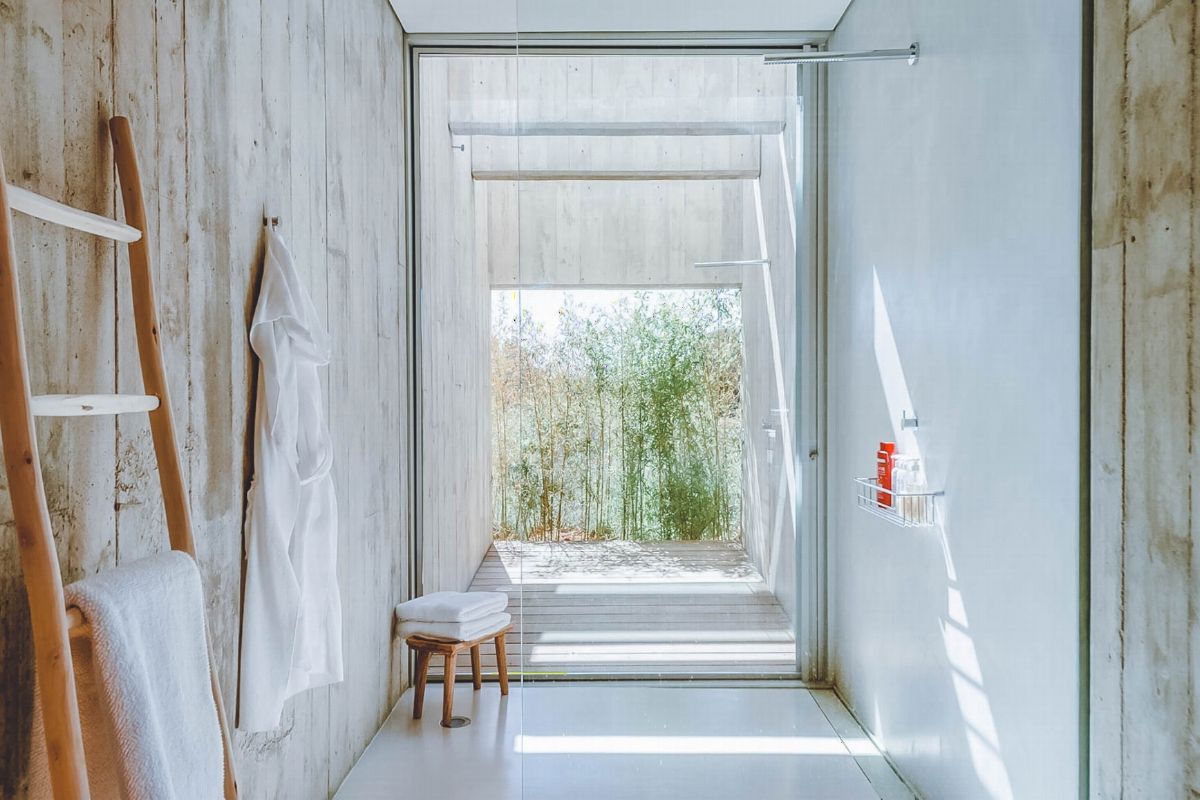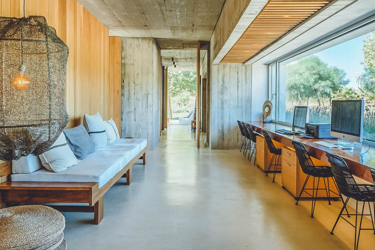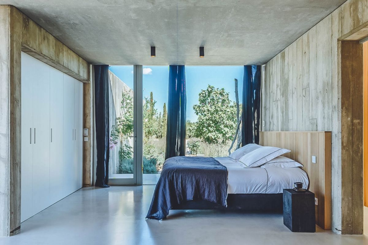 Inside the interiors, designed by the French owner reflect her own bohemian chic style. Concrete floors and ceilings meet warm cool Scandi wood while accents of smudgy black charcoal mix with natural linens, wicker and rattan.