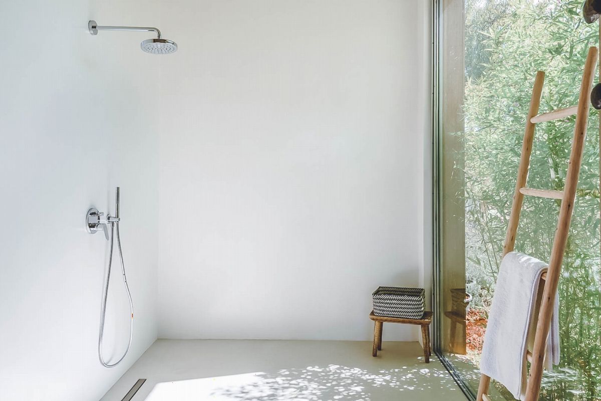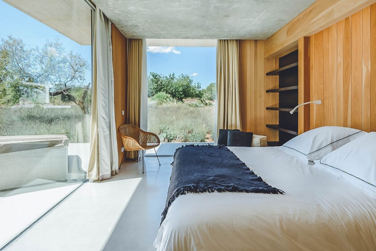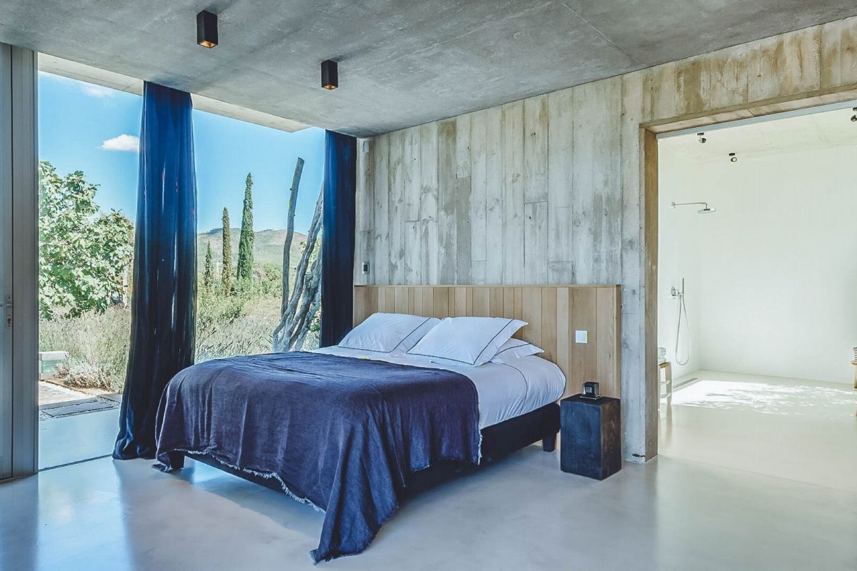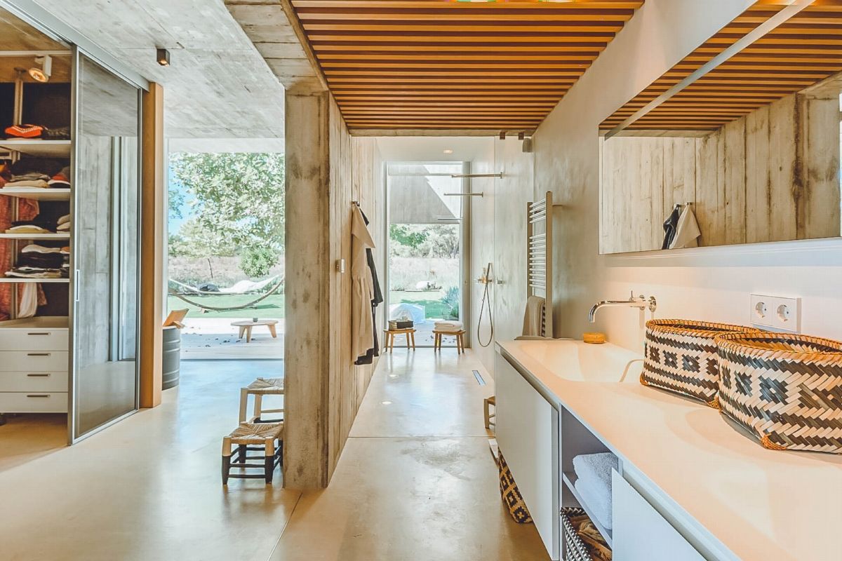 Inside the interiors, designed by the French owner reflect her own bohemian chic style. Concrete floors and ceilings meet warm cool Scandi wood while accents of smudgy black charcoal mix with natural linens, wicker and rattan.