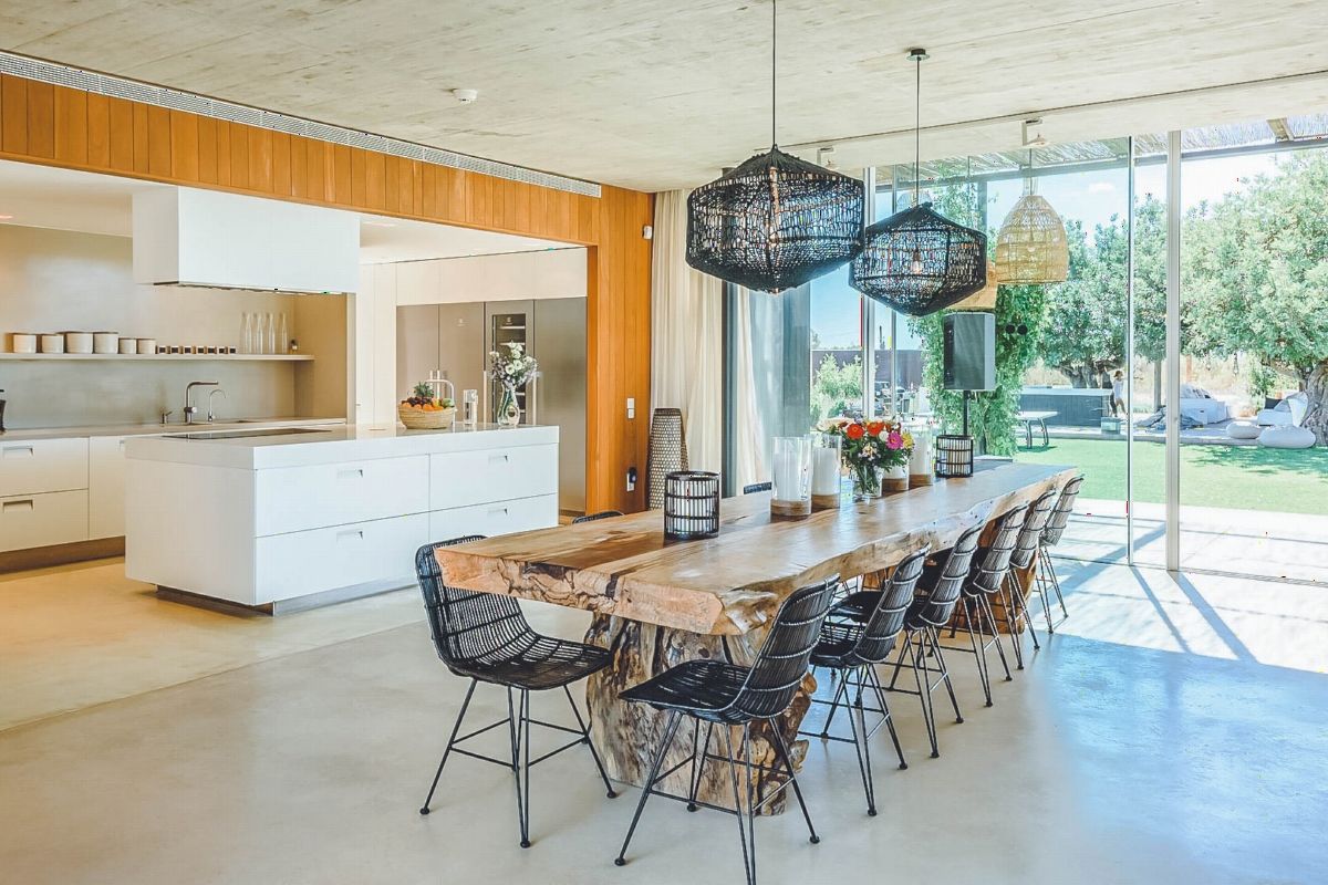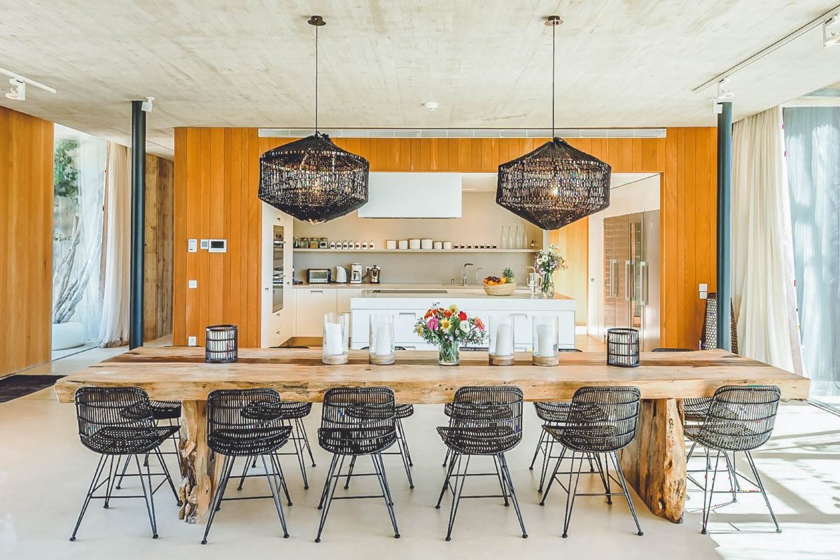 A large open plan living room, kitchen and dining area appear light and airy thanks to the large glass windows that run the length of the room. Black columns give the room an edgy industrial feel that is softened by the creamy beige concrete floor and ceiling. Light gingerbread coloured wood exudes warmth in the room. This is a room for serious gatherings, with so many sumptuous seats to sink into. A large reclaimed wooden table with ancient gnarled legs is flanked by modern black wicker dining chairs and suspended lights.