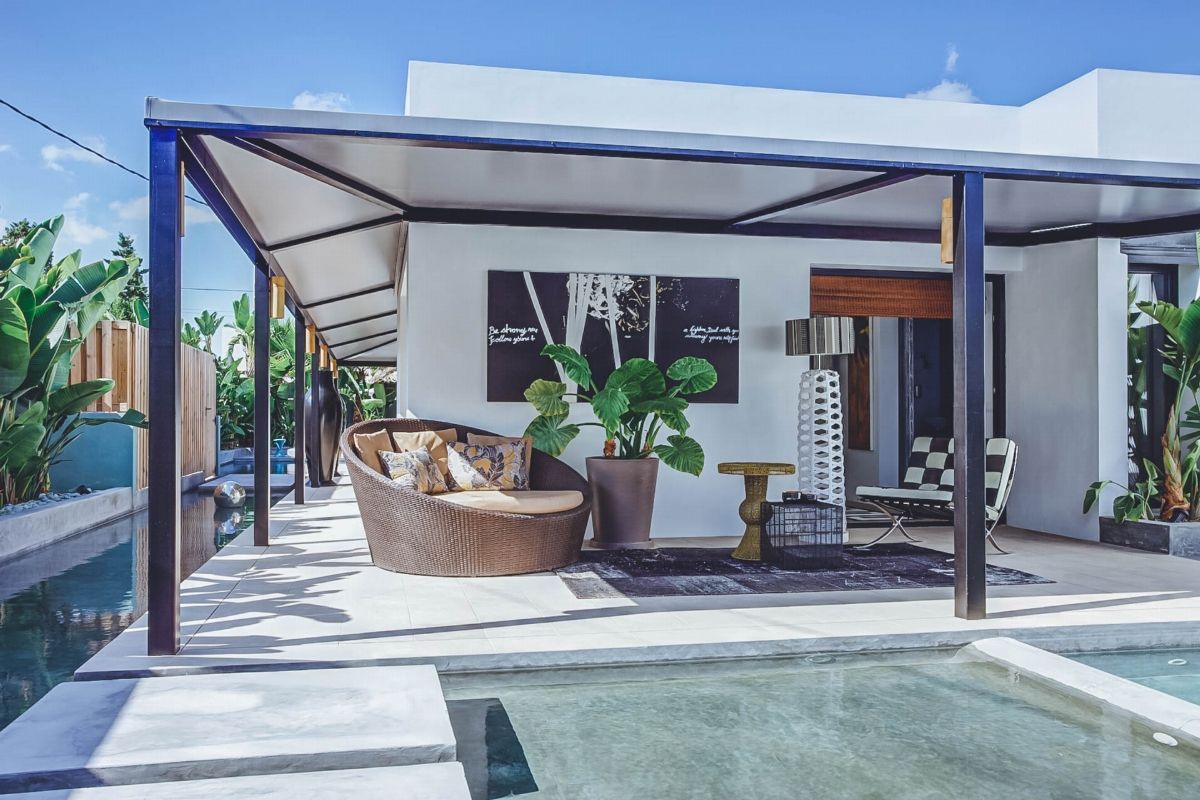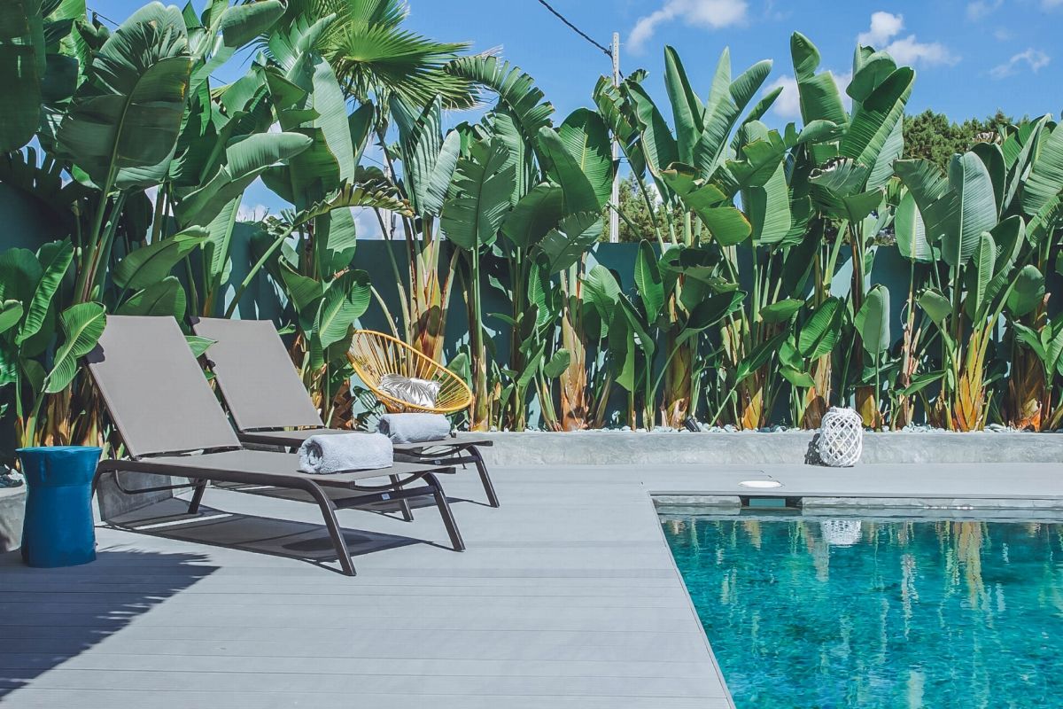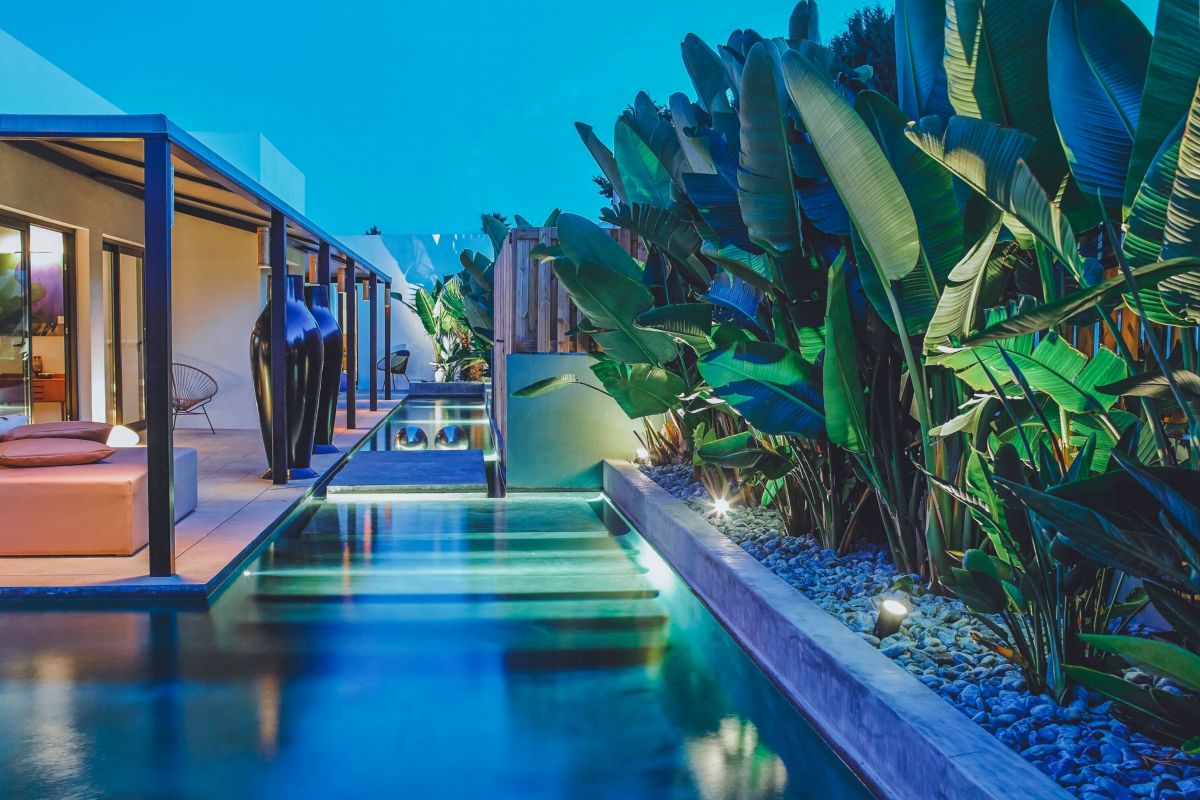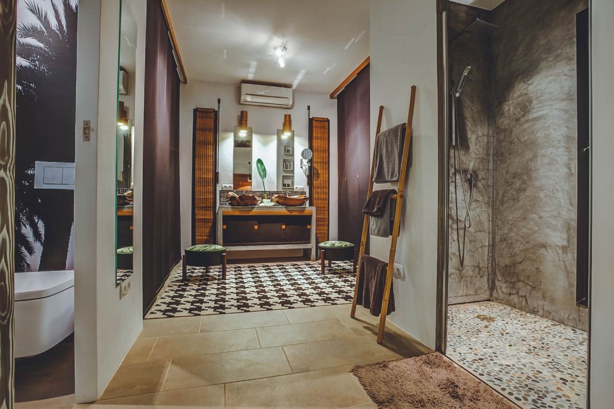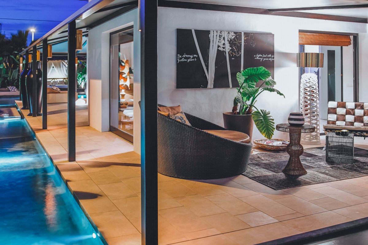 Outside in Villa Gracie guests will delight in an array of sun soaked and shaded areas to immerse yourself in Ibizan spirit, from an outdoor covered terrace lounge with daybeds and sofas, an al fresco dining space for entertaining friends and family, and the choice of a stylish swimming pool which curves around the property, or jacuzzi with plenty of sun lounging spots.