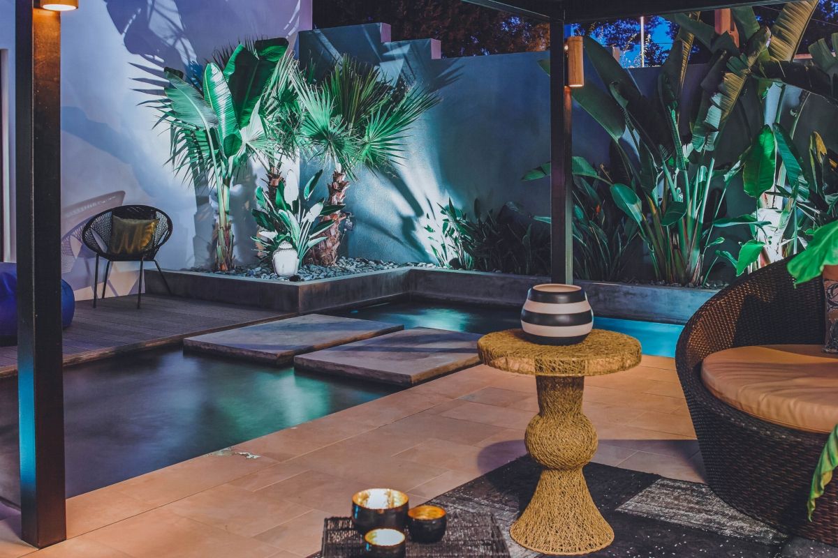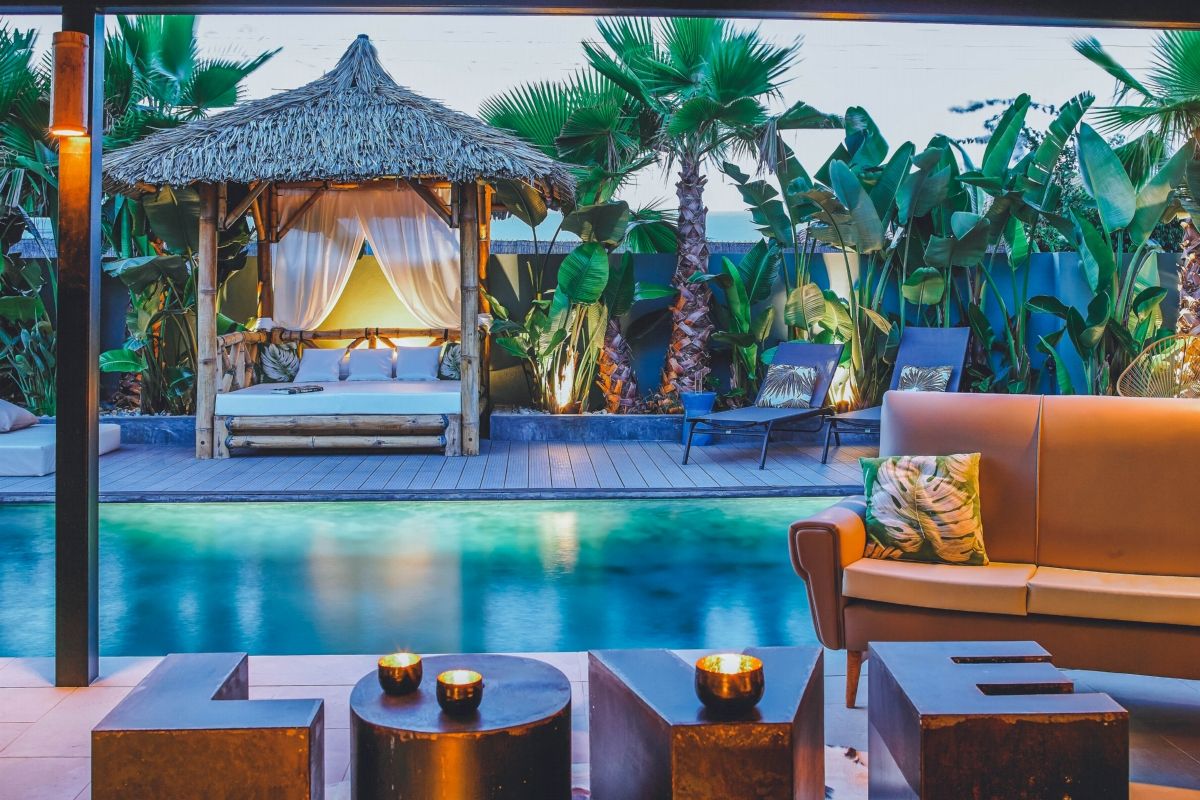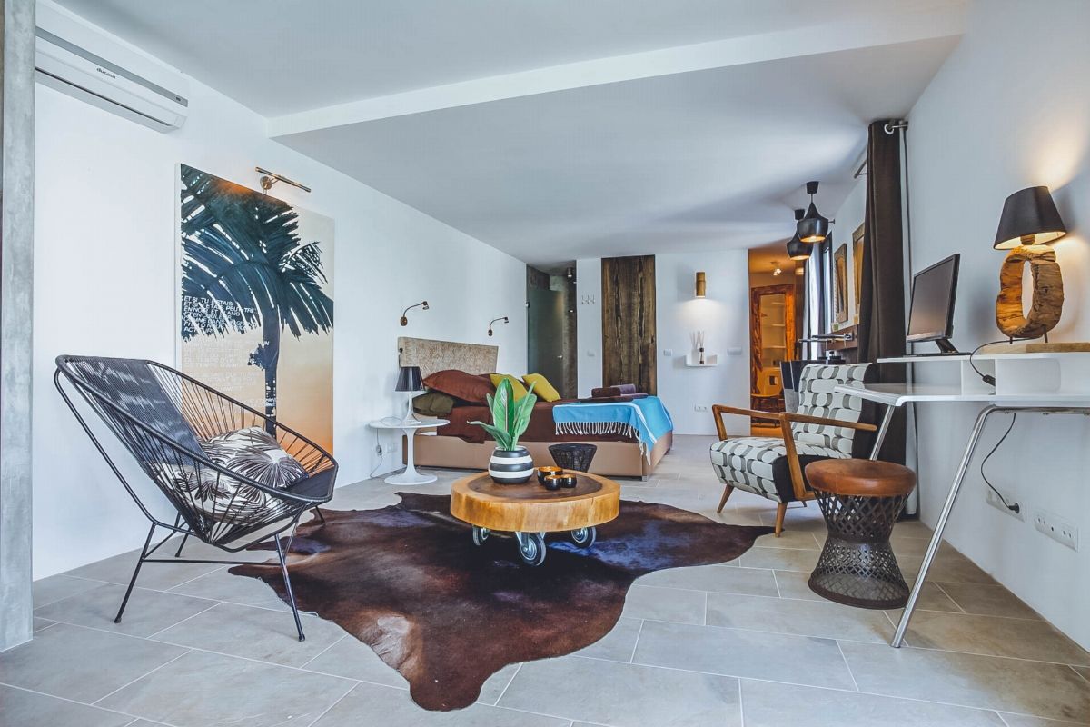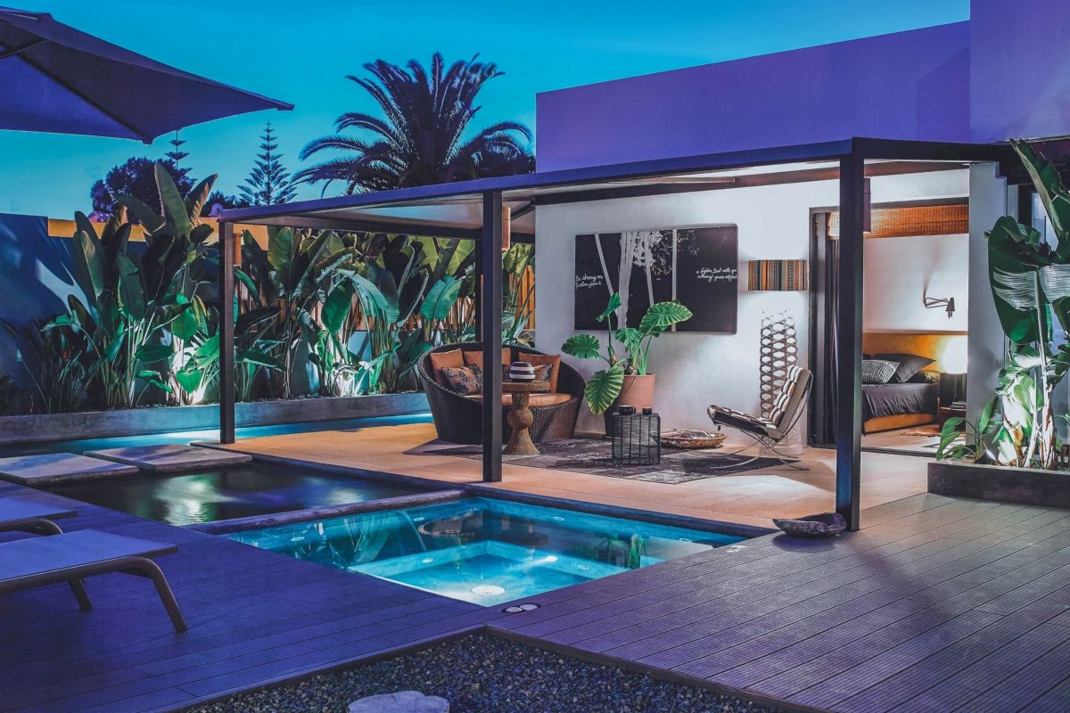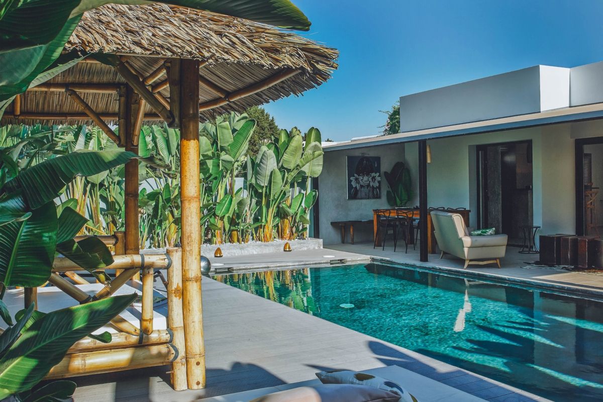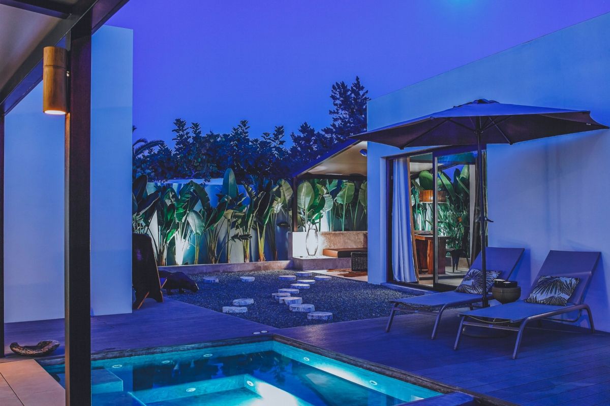 Outside in Villa Gracie guests will delight in an array of sun soaked and shaded areas to immerse yourself in Ibizan spirit, from an outdoor covered terrace lounge with daybeds and sofas, an al fresco dining space for entertaining friends and family, and the choice of a stylish swimming pool which curves around the property, or jacuzzi with plenty of sun lounging spots.