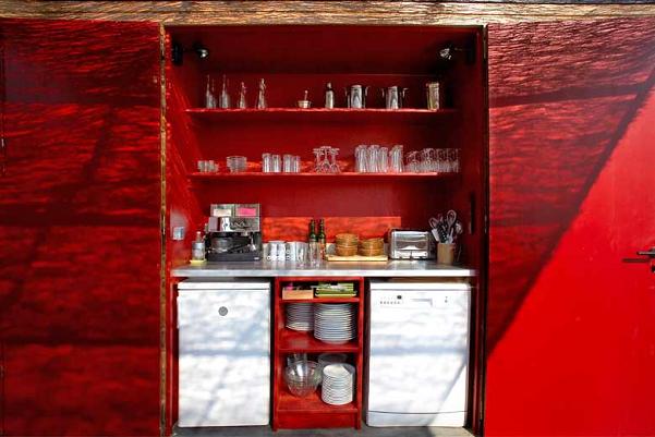 A fully equipped summer kitchen with BBQ, in front of a lawn