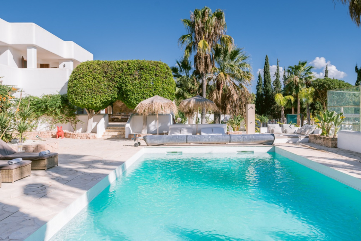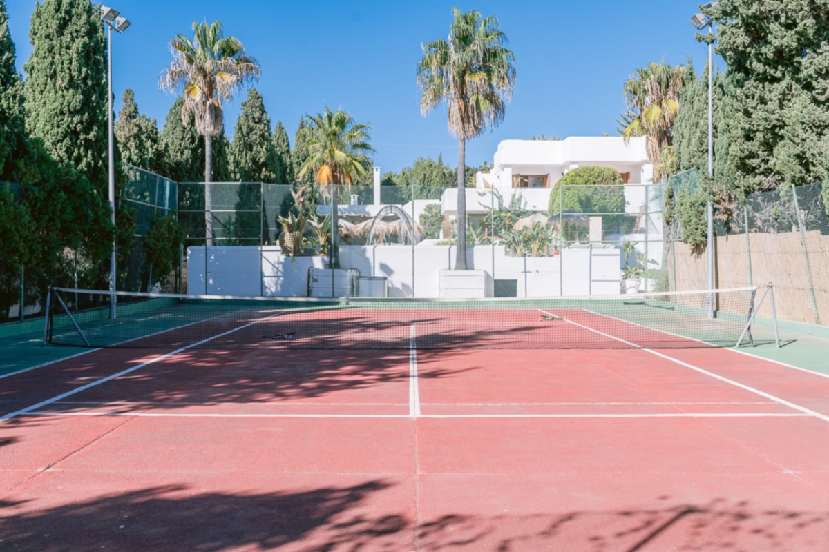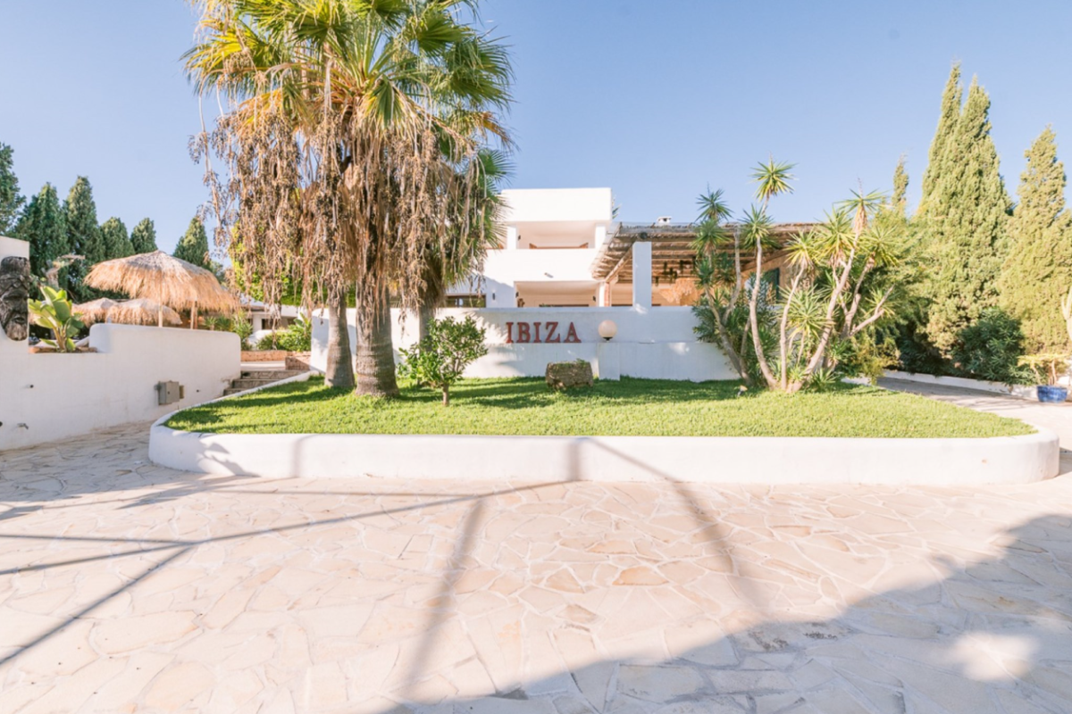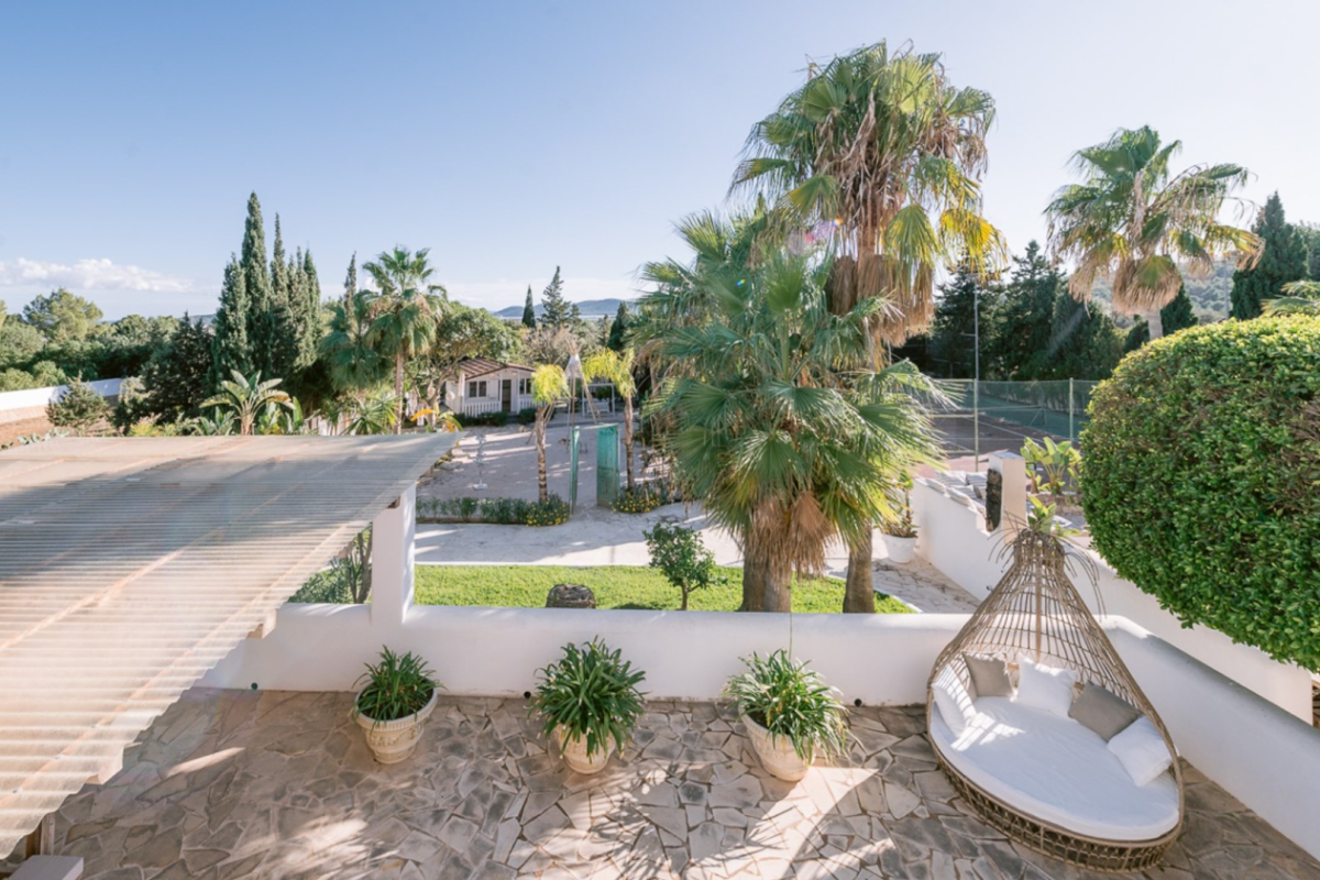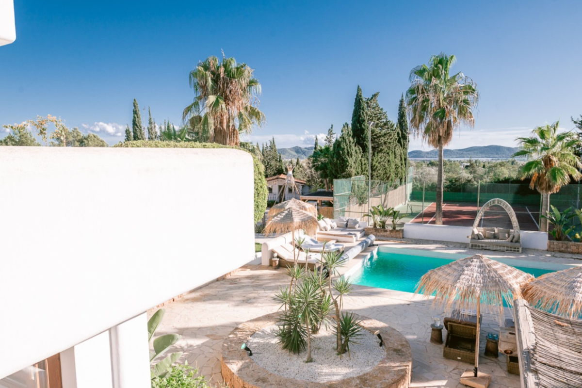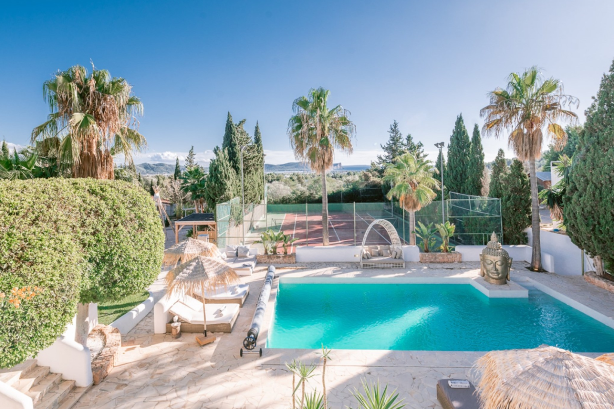 Spectaculaire villa de luxe fraîchement rénovée avec grande piscine chauffée, court de tennis, plage artificielle avec maison de plage, nombreux palmiers, cheminée et fontaine d'art. L'endroit idéal à Ibiza pour accumuler des souvenirs inoubliables.