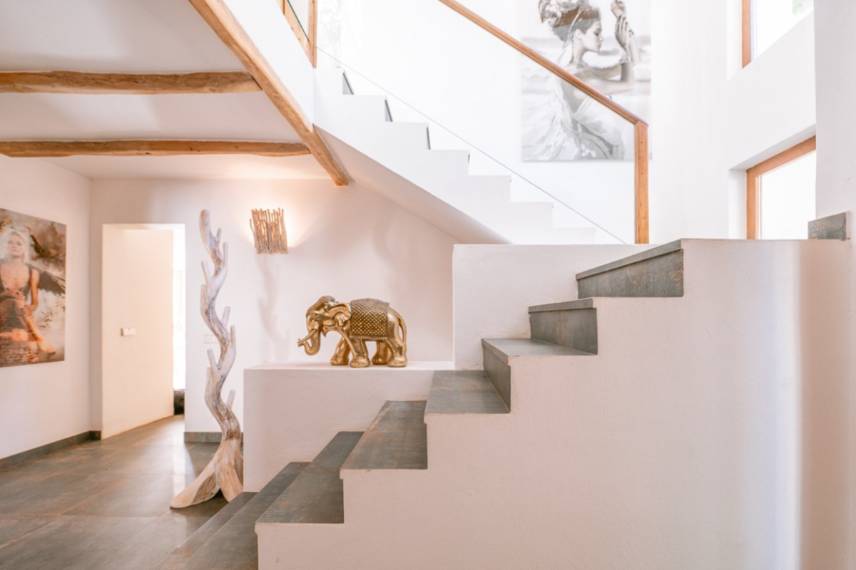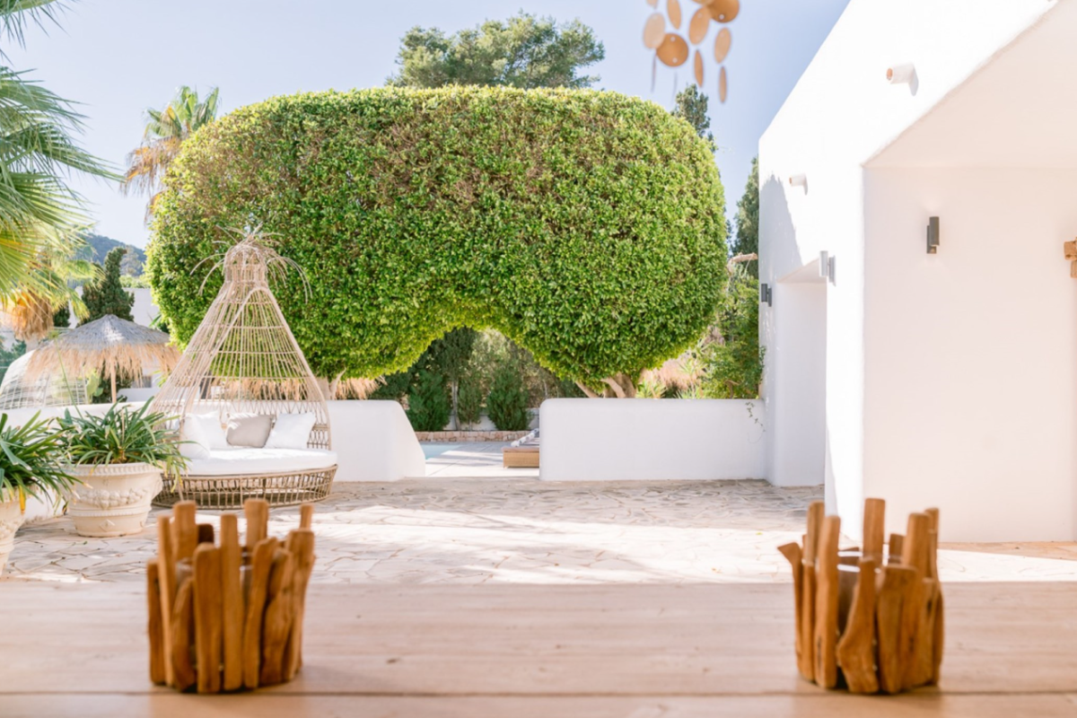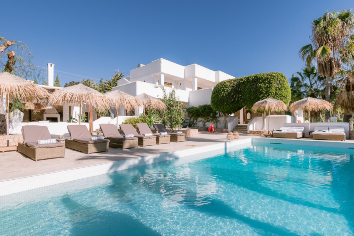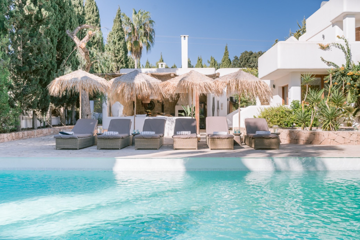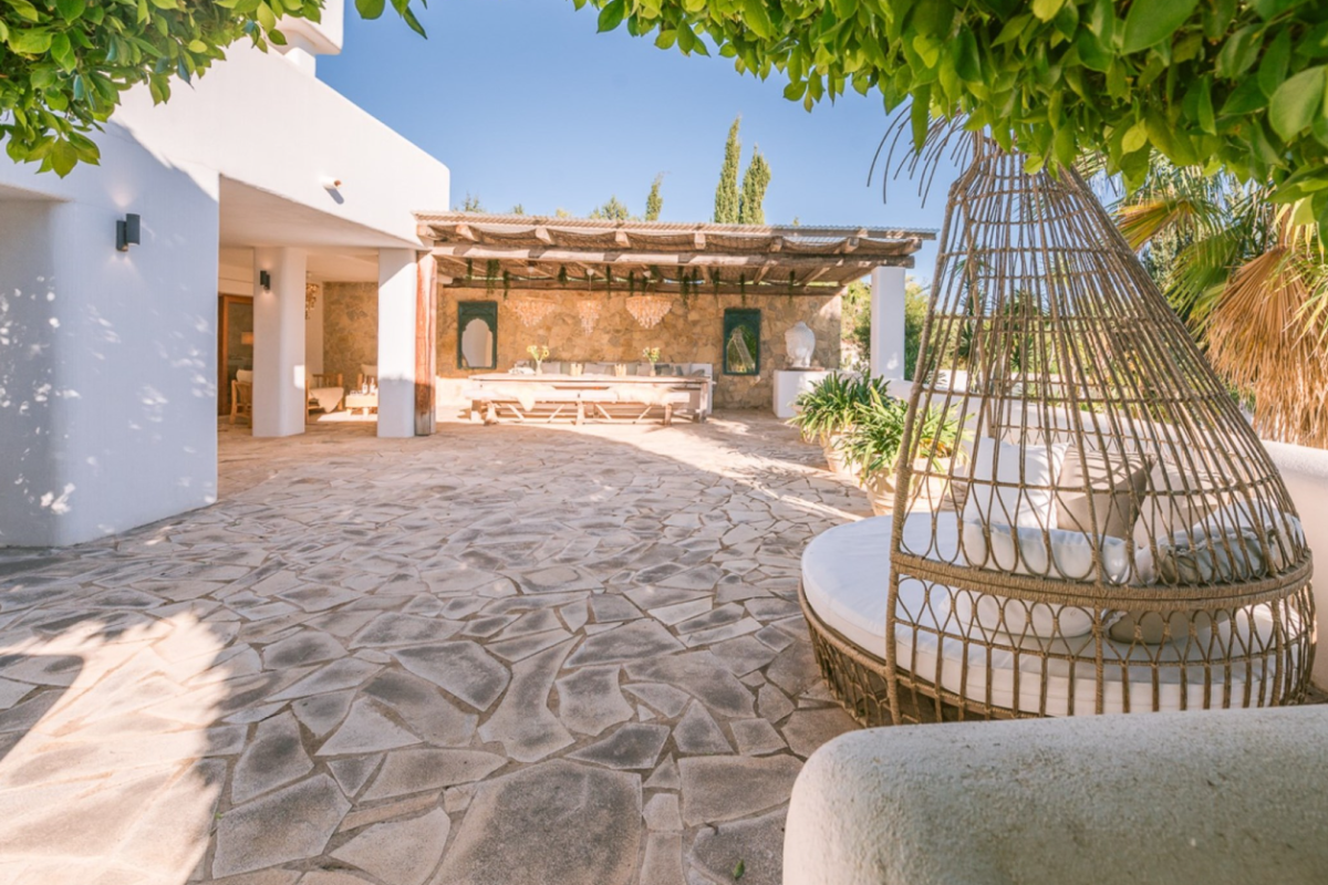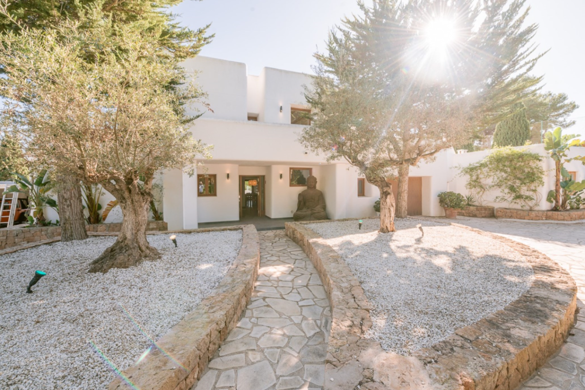 Spectaculaire villa de luxe fraîchement rénovée avec grande piscine chauffée, court de tennis, plage artificielle avec maison de plage, nombreux palmiers, cheminée et fontaine d'art. L'endroit idéal à Ibiza pour accumuler des souvenirs inoubliables.