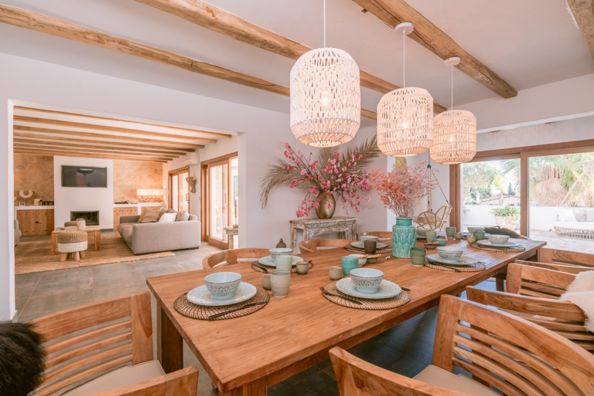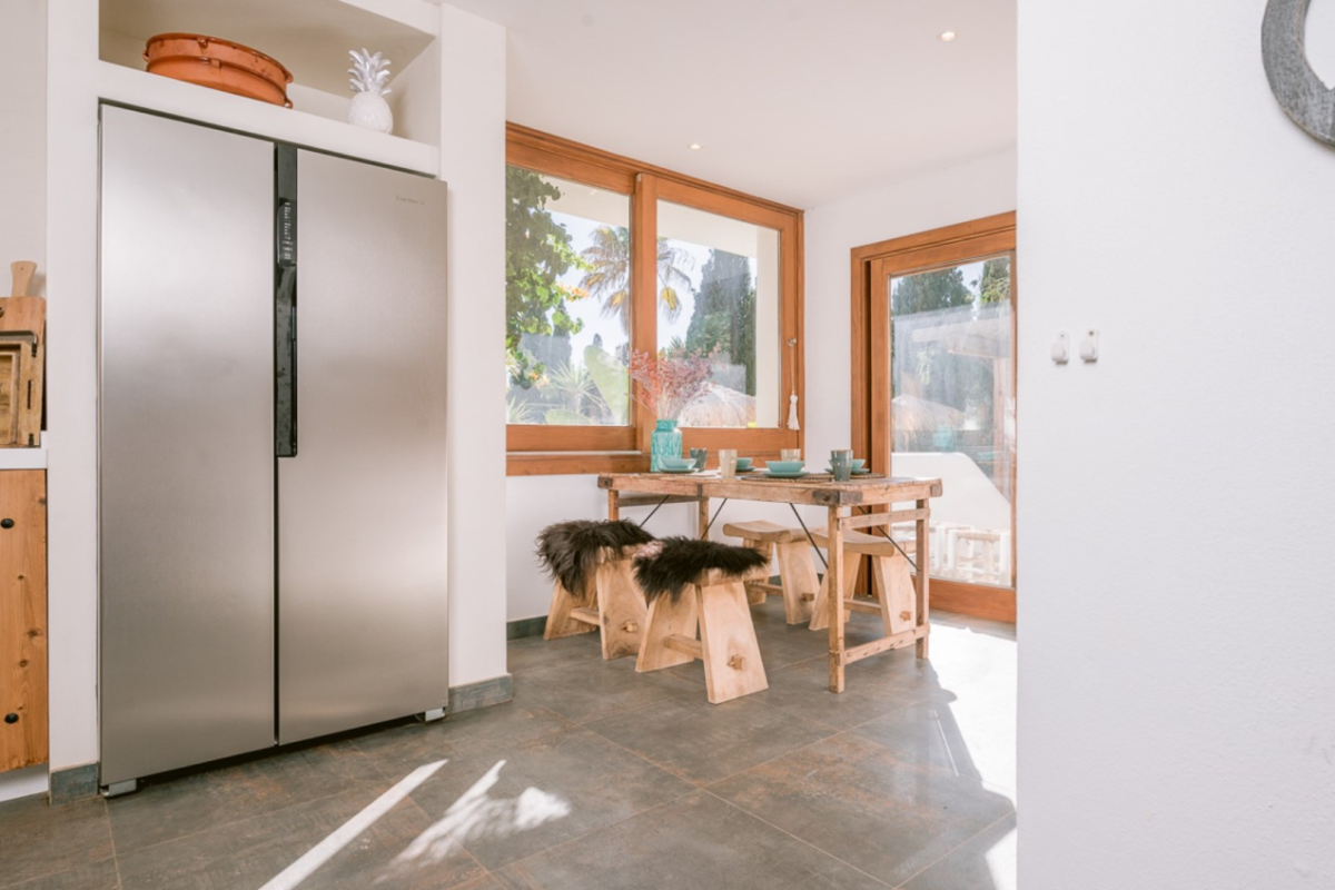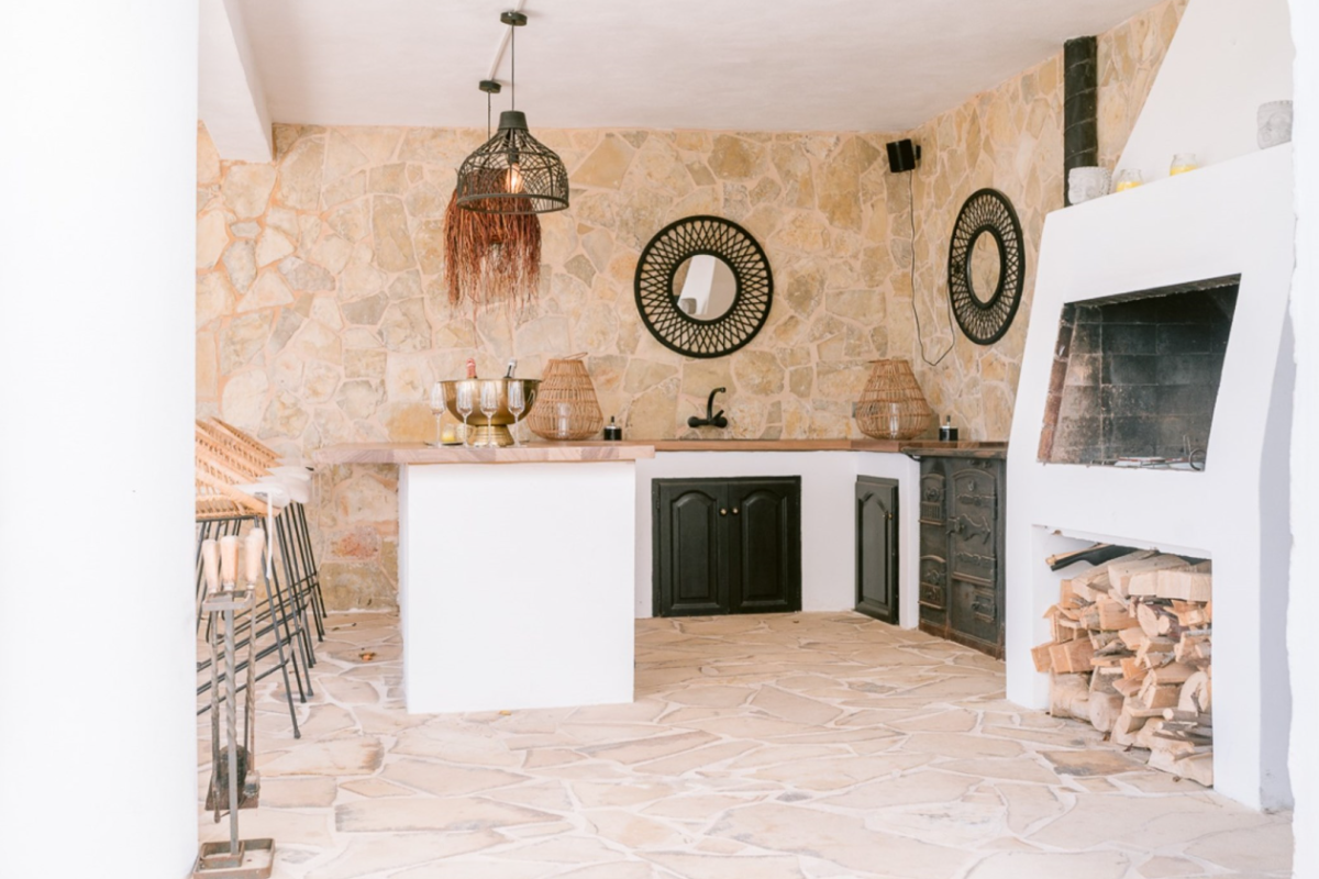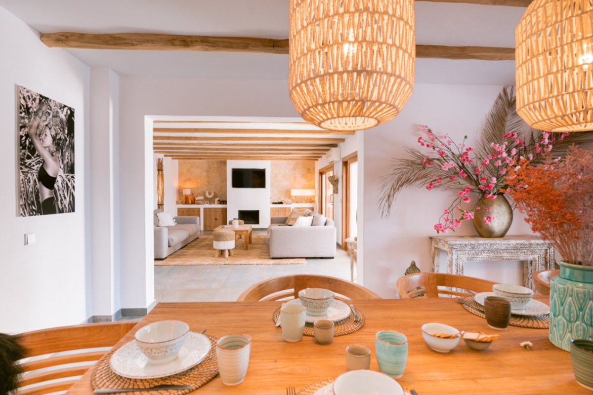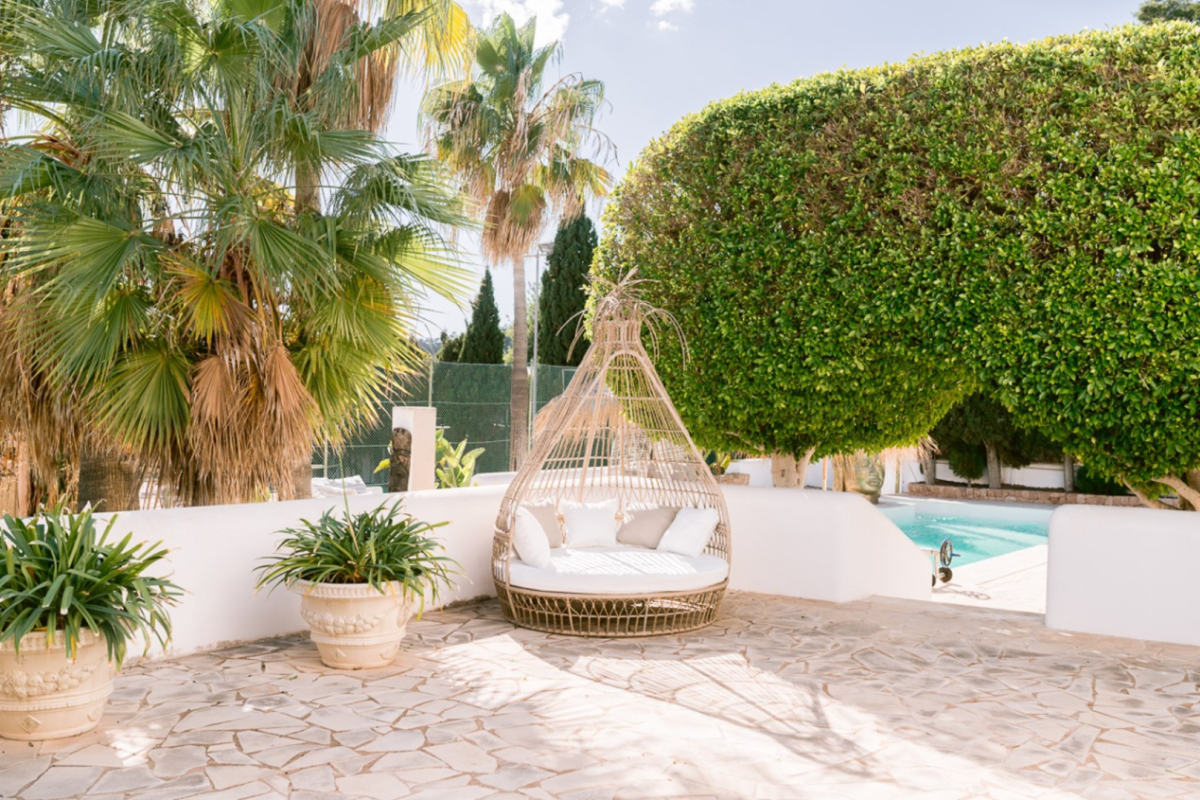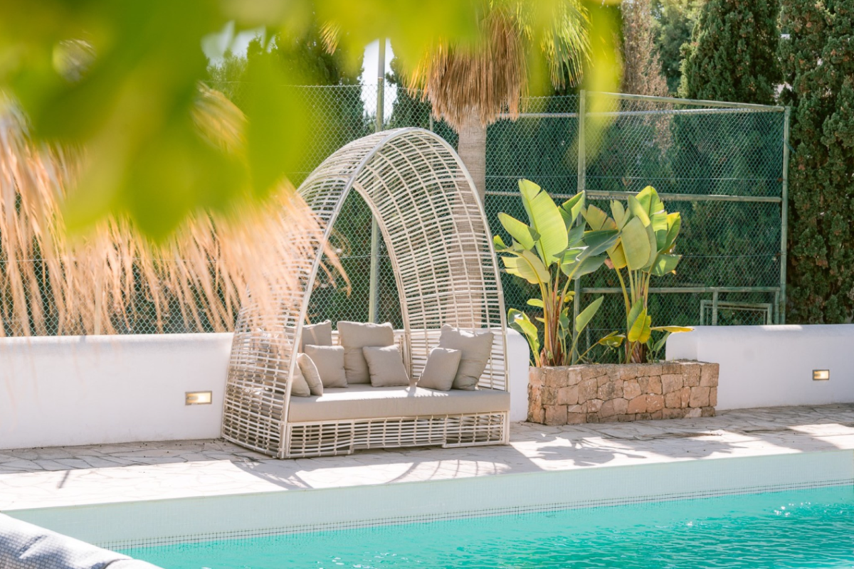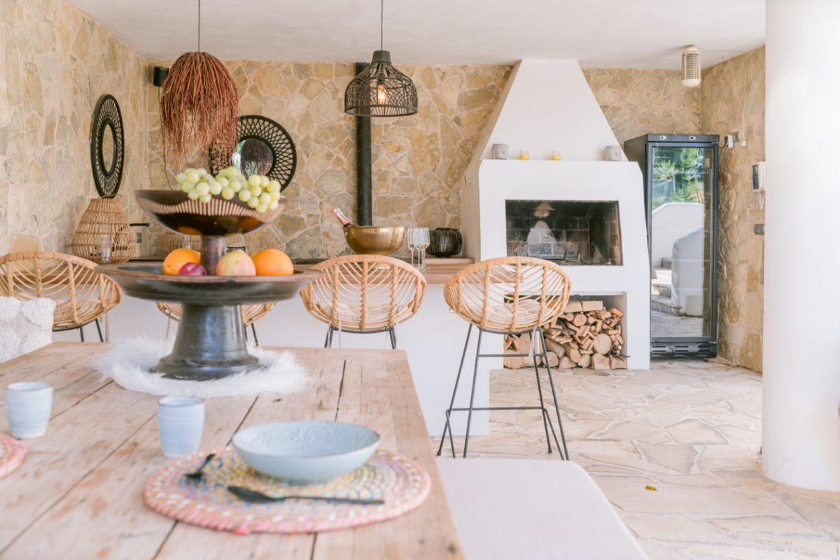 Spectaculaire villa de luxe fraîchement rénovée avec grande piscine chauffée, court de tennis, plage artificielle avec maison de plage, nombreux palmiers, cheminée et fontaine d'art. L'endroit idéal à Ibiza pour accumuler des souvenirs inoubliables.