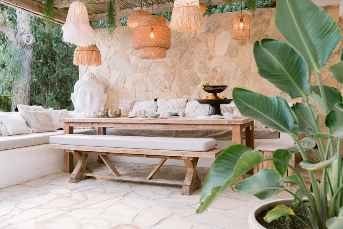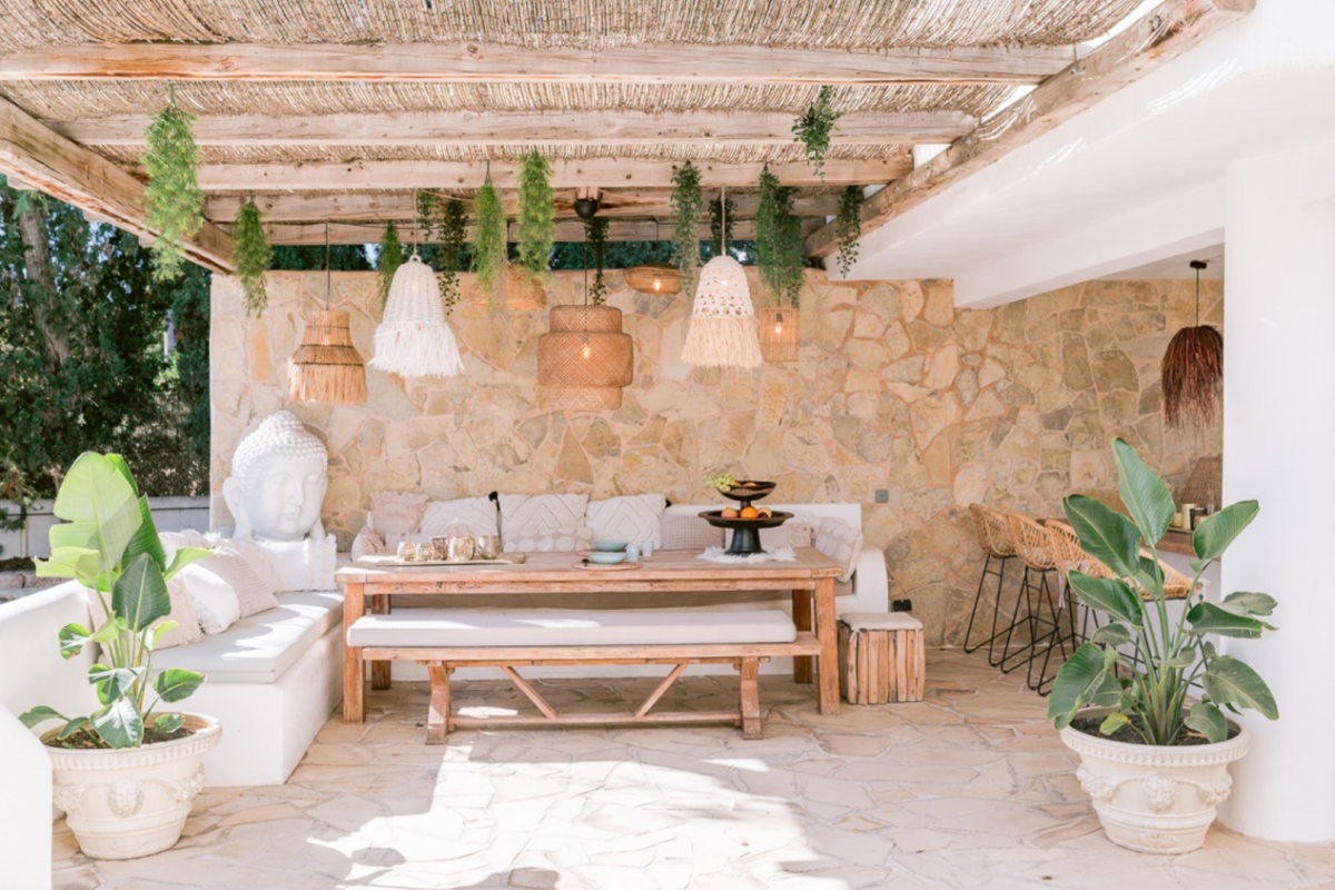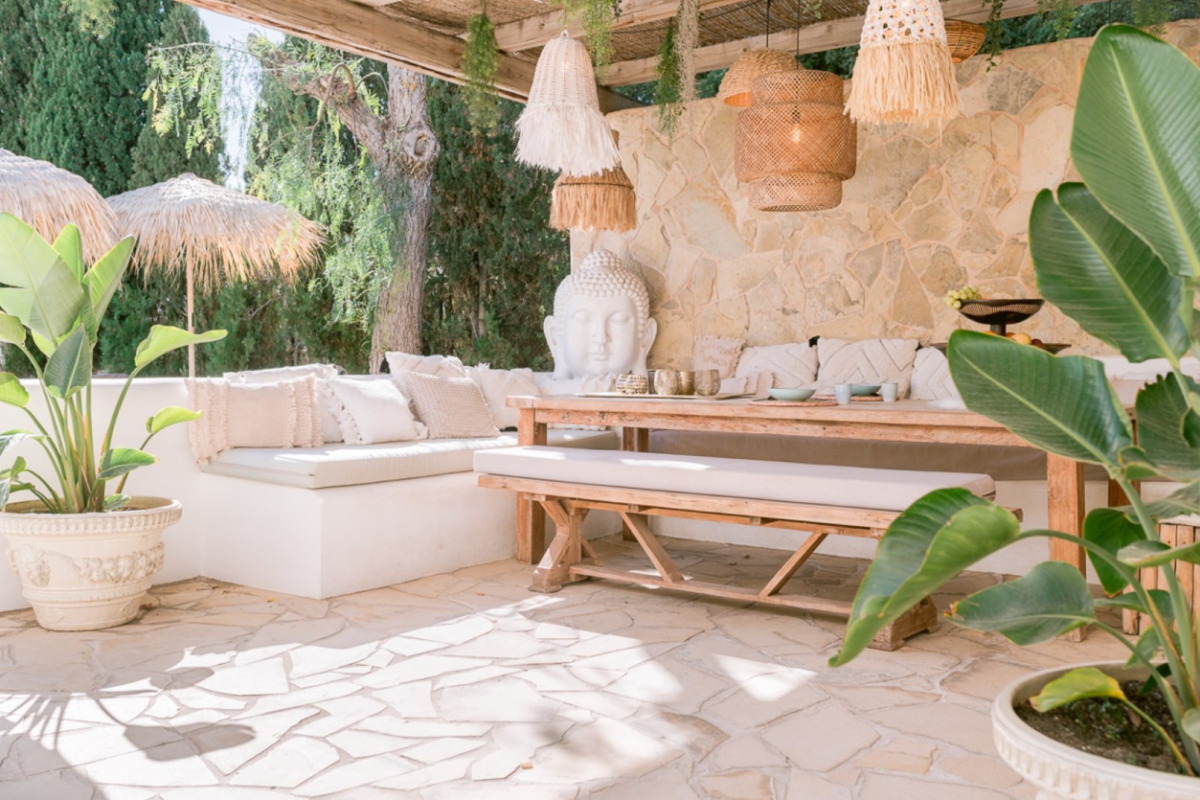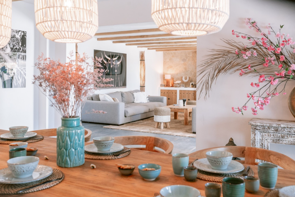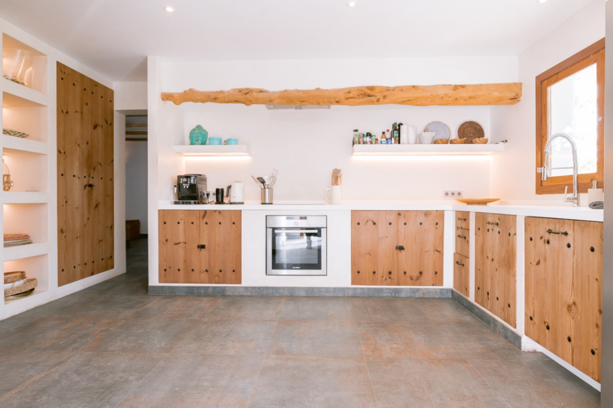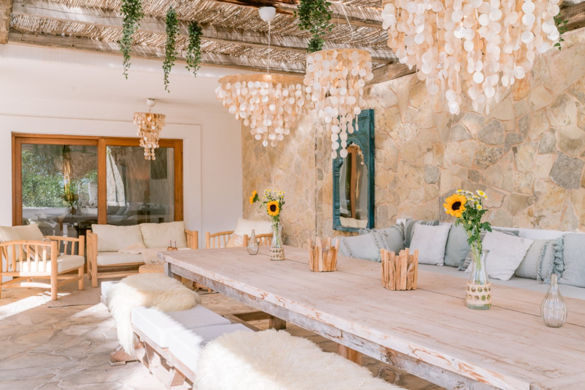 Spectaculaire villa de luxe fraîchement rénovée avec grande piscine chauffée, court de tennis, plage artificielle avec maison de plage, nombreux palmiers, cheminée et fontaine d'art. L'endroit idéal à Ibiza pour accumuler des souvenirs inoubliables.
